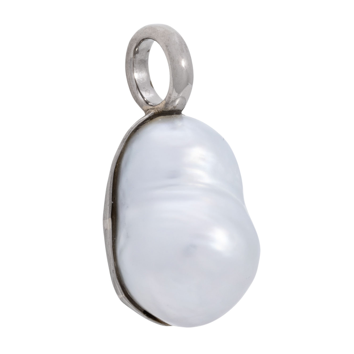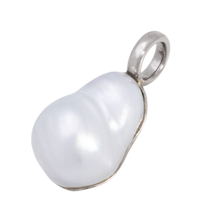 Pendant with baroque shaped pearl mounted in 14K white gold, 8 grams, L: ca. 3 cm, 20th/21st century, minor signs of wear.