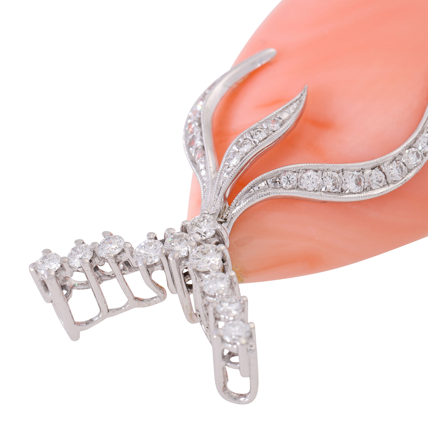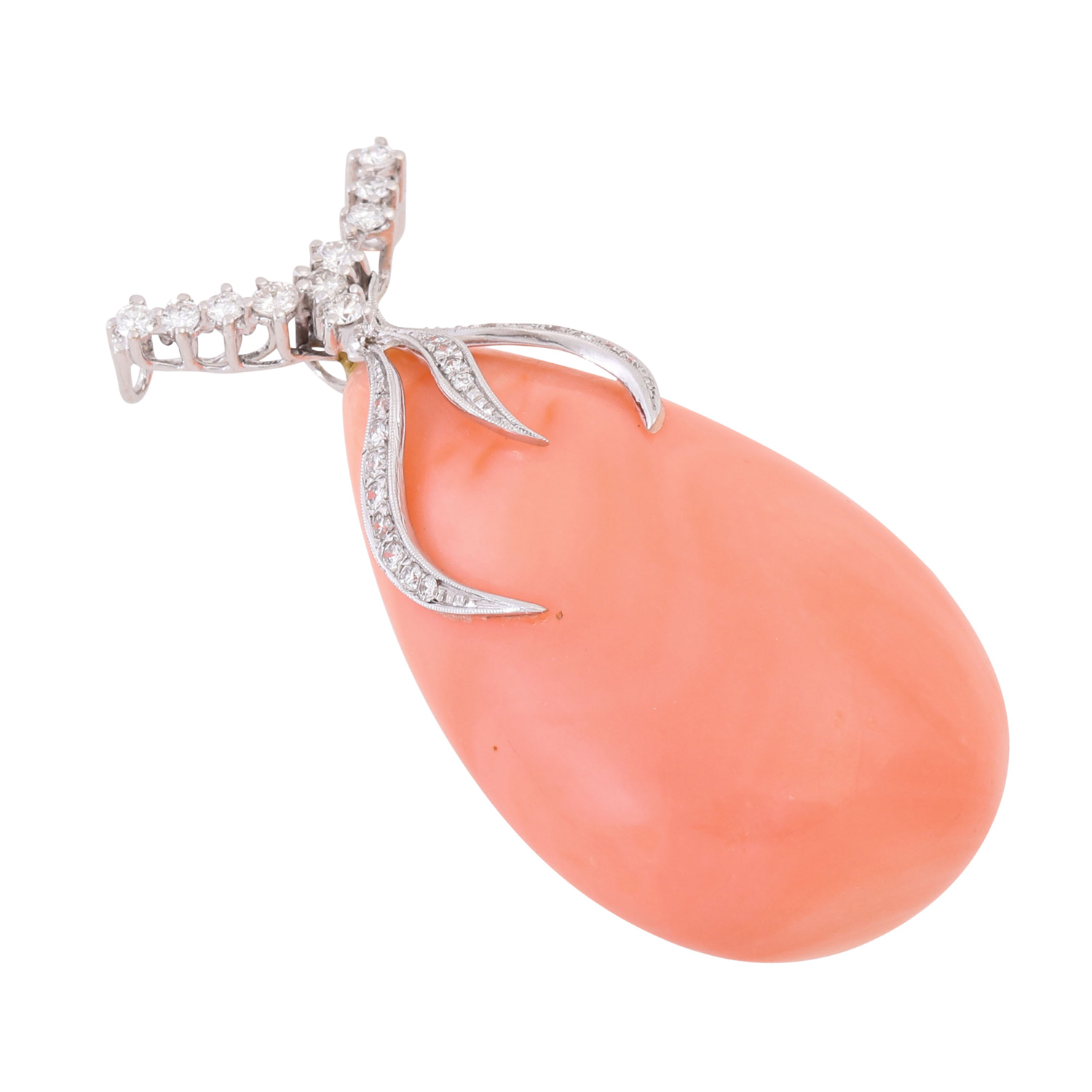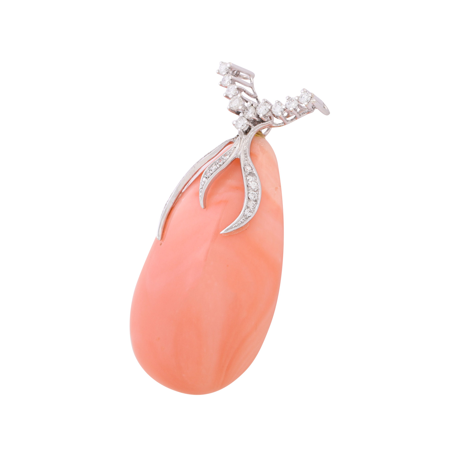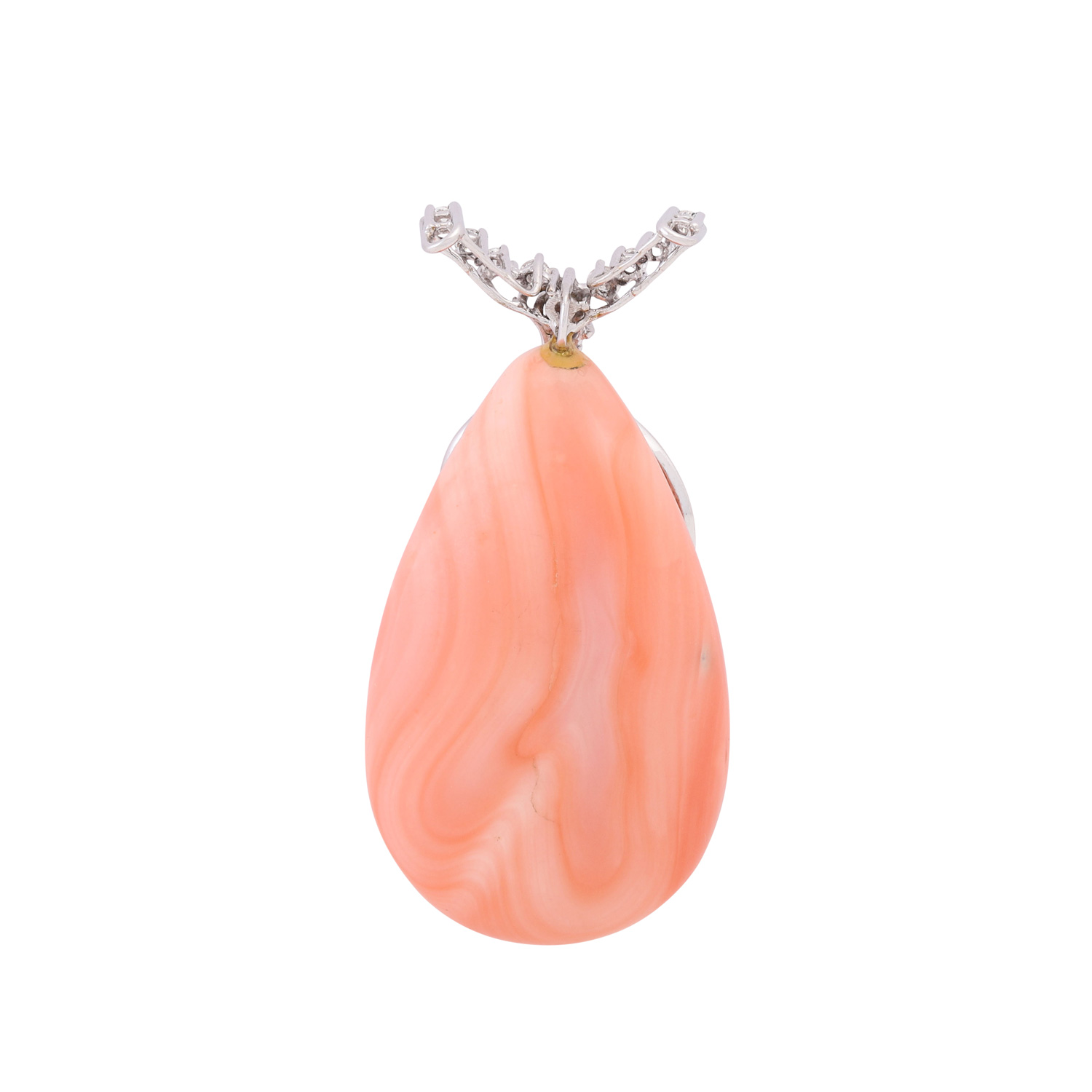Necklace with beautiful angel skin corall, drop shaped approx 41 x 24 mm and 28 brilliant-cut diamonds from approx 0.40 ct, WHITE (H) / SI, 18K WG 23 g, mid to end 20th century, minimal signs of wear and glue, good condition.