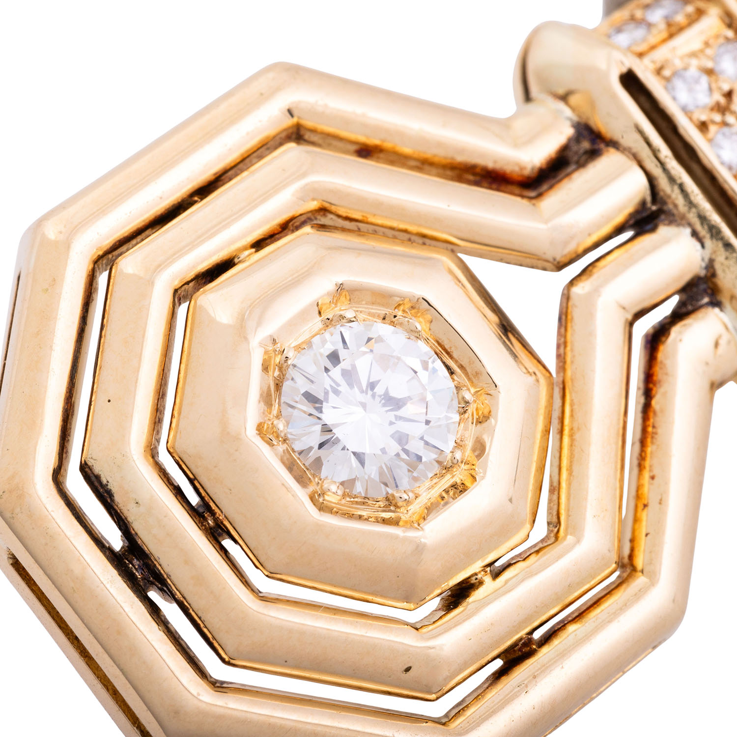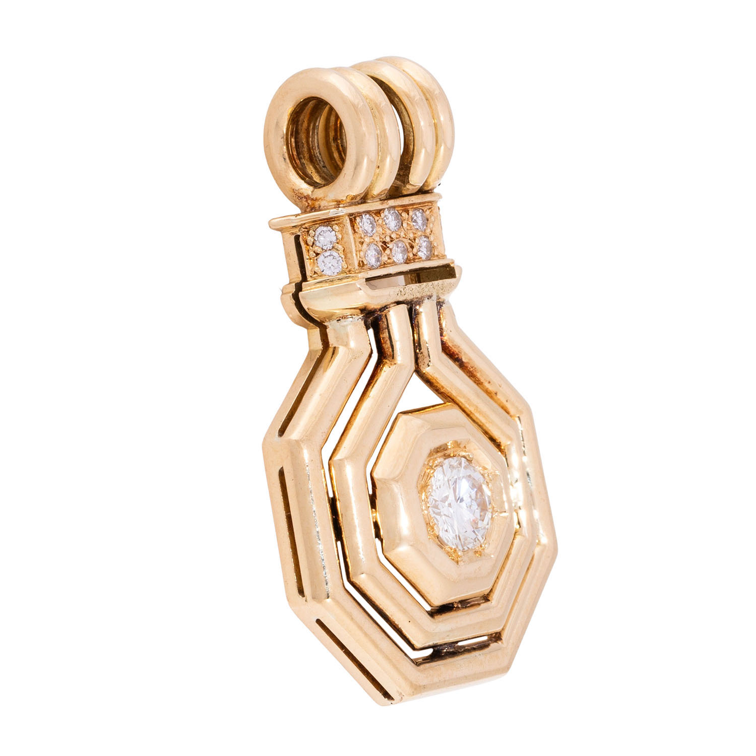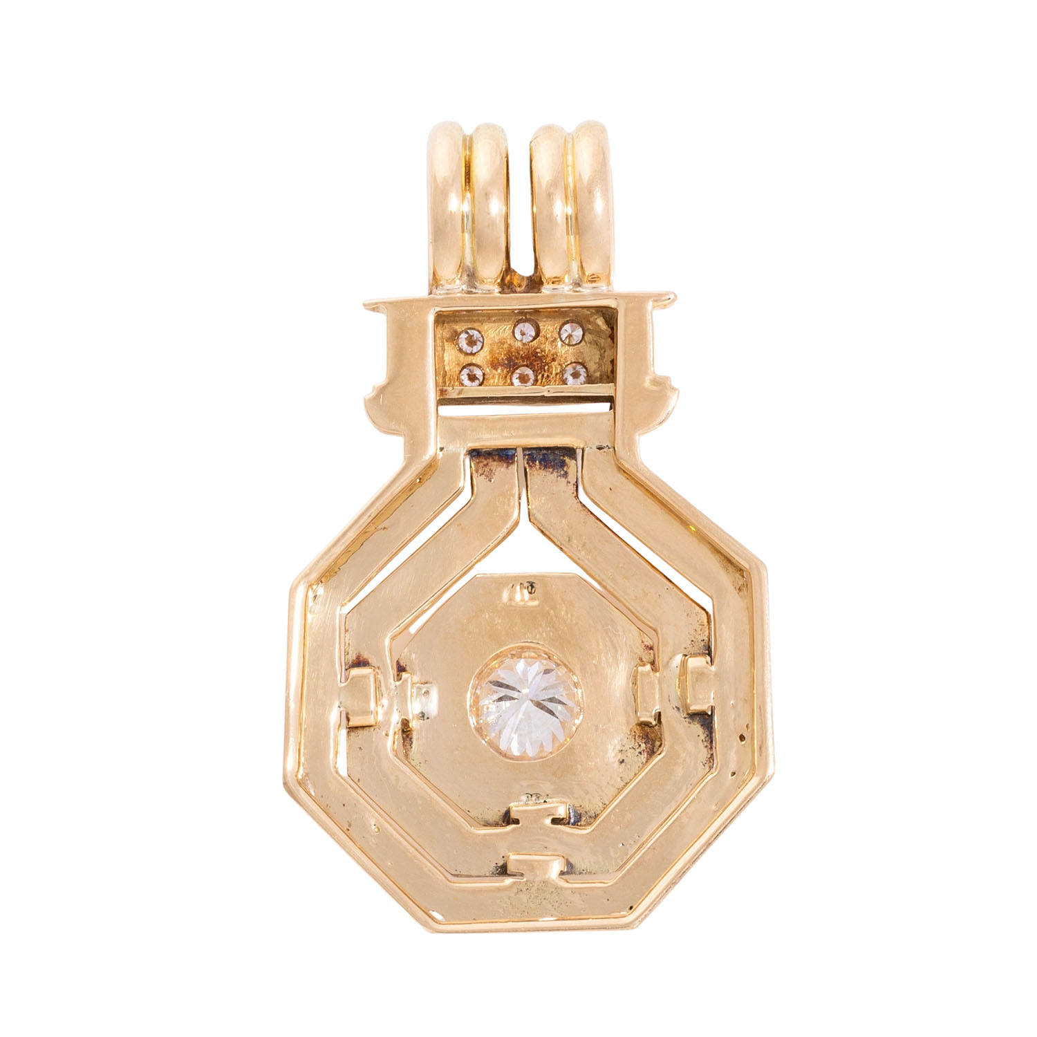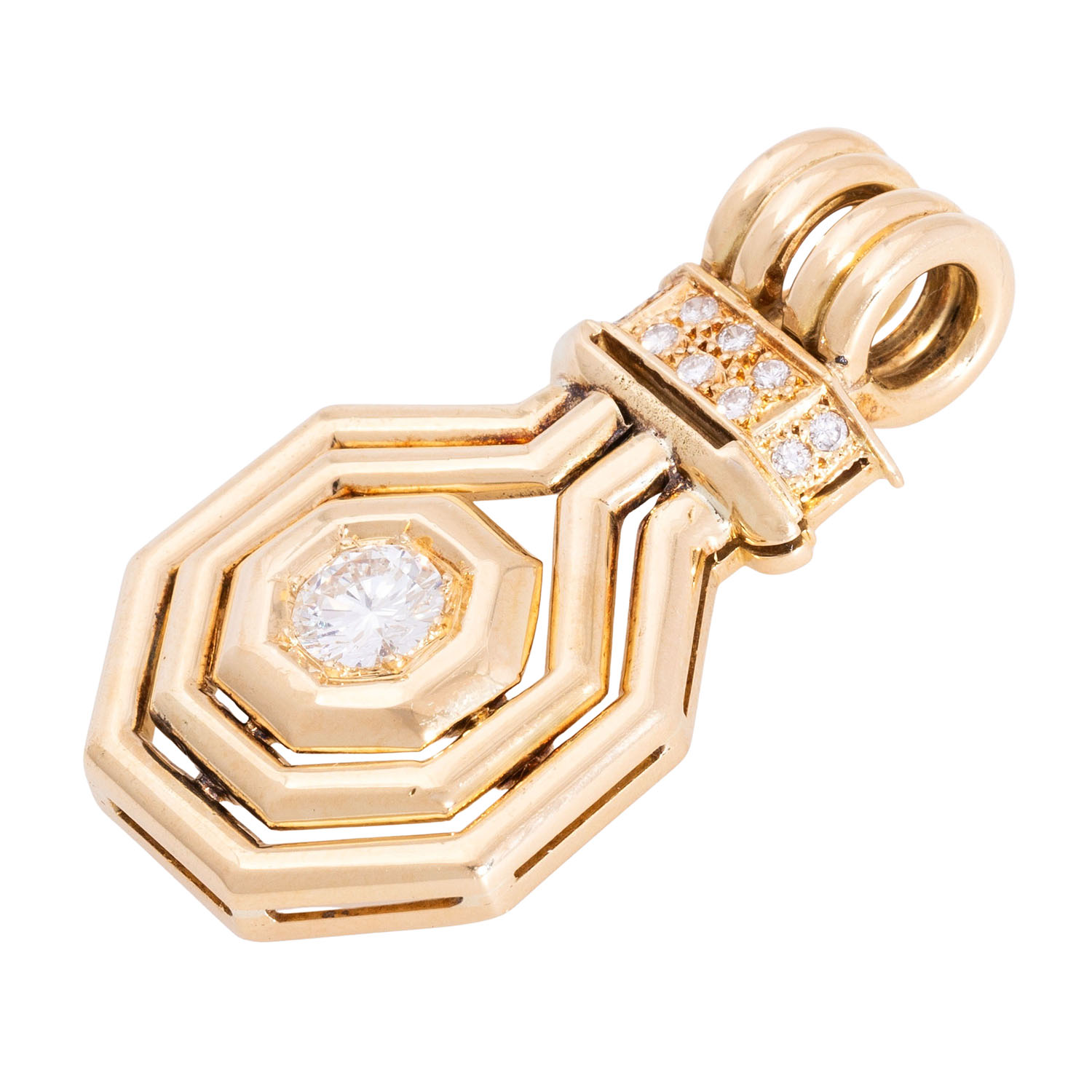 Pendant with brilliant-cut diamond ca. 1 ct, ca. WHITE (H)/SI and 10 further small brilliant-cut diamonds totalling ca. 0.2 ct, good to medium colour and clarity, partly with chips, 14K yellow gold, 16.8 g, 4x2.5 cm, late 20th century, signs of wear and casting.