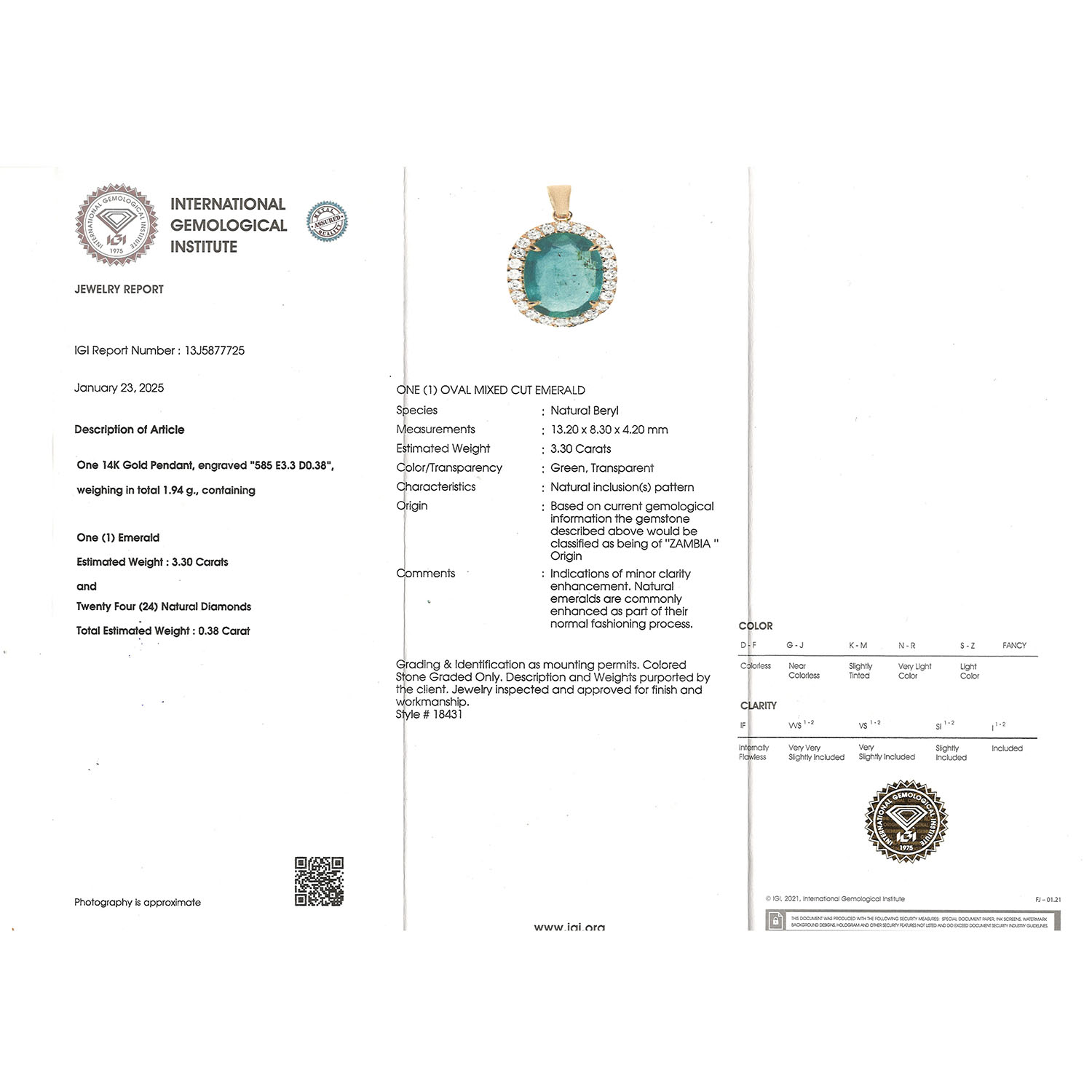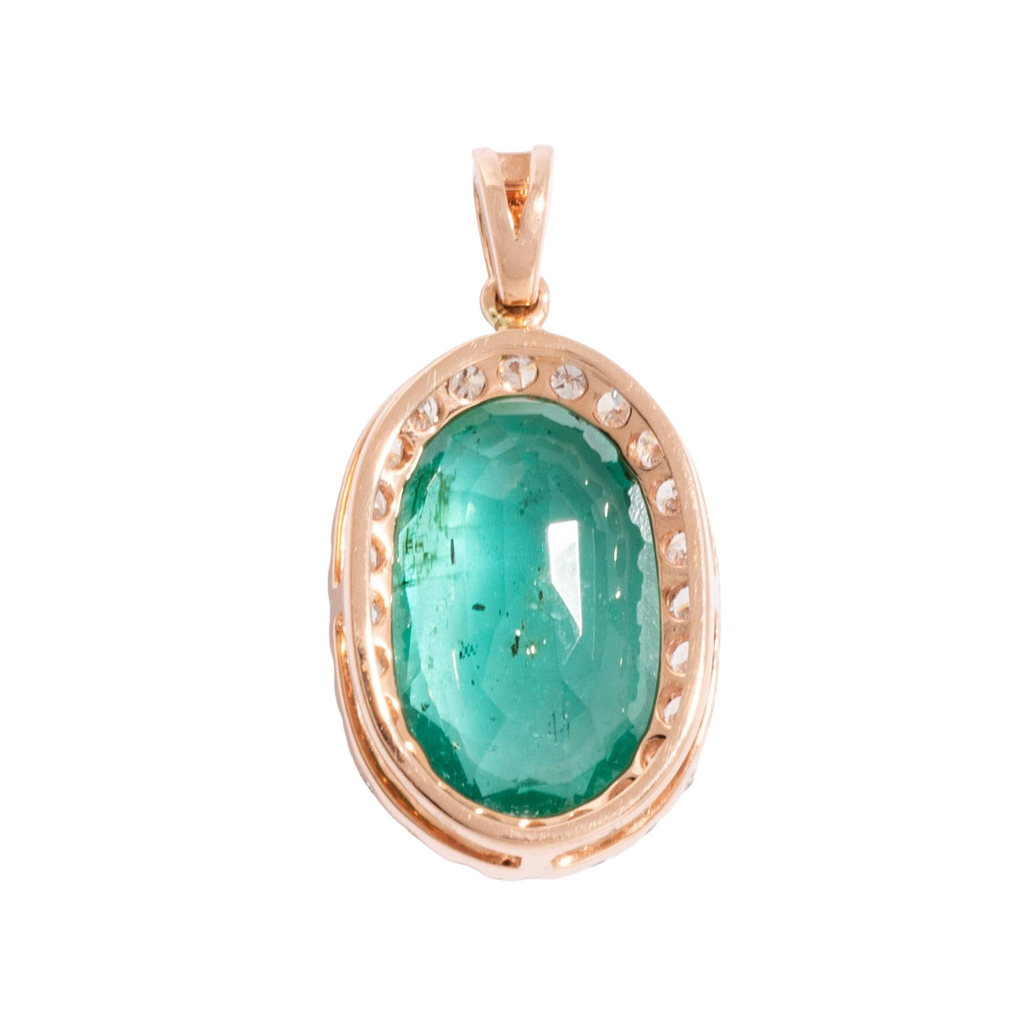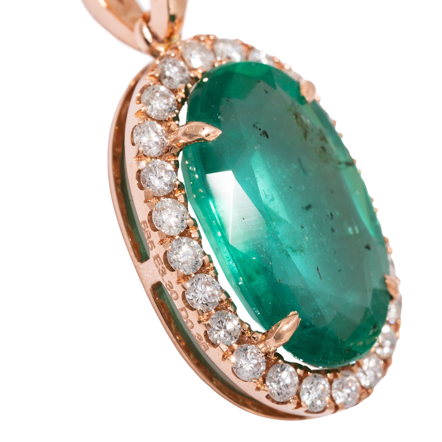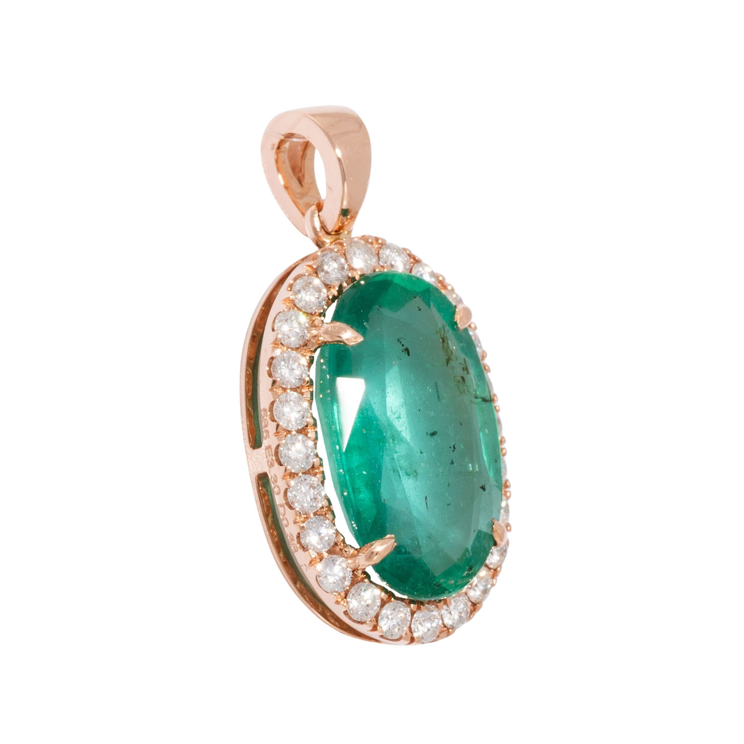 Pendant with Zambia emerald of ca. 3.3 ct and brilliant-cut diamonds totalling ca. 0.38 ct, good colour, low to medium clarity, 14K RG, 1,9 g, L: ca. 2 cm, 21st century, mint condition, incl. IGI certificate (2025).