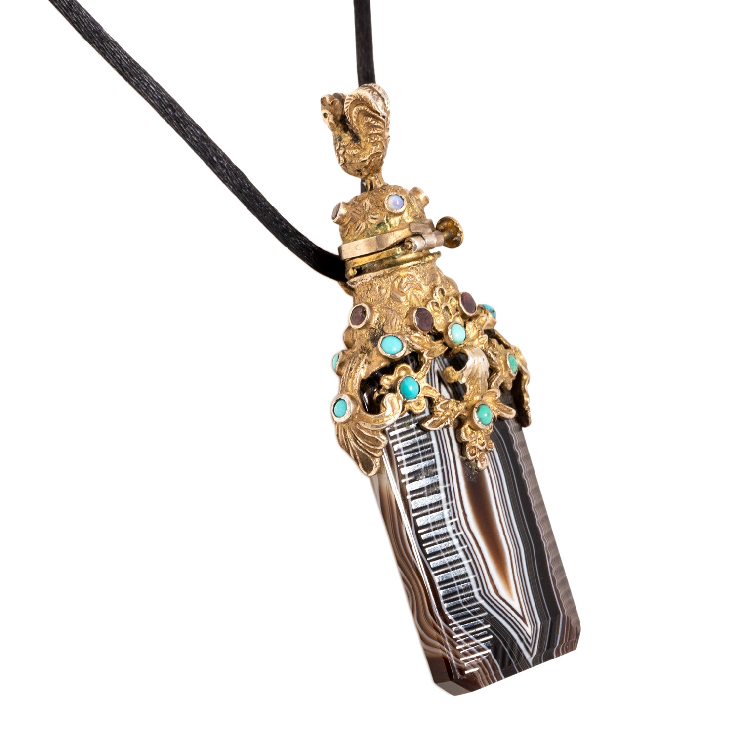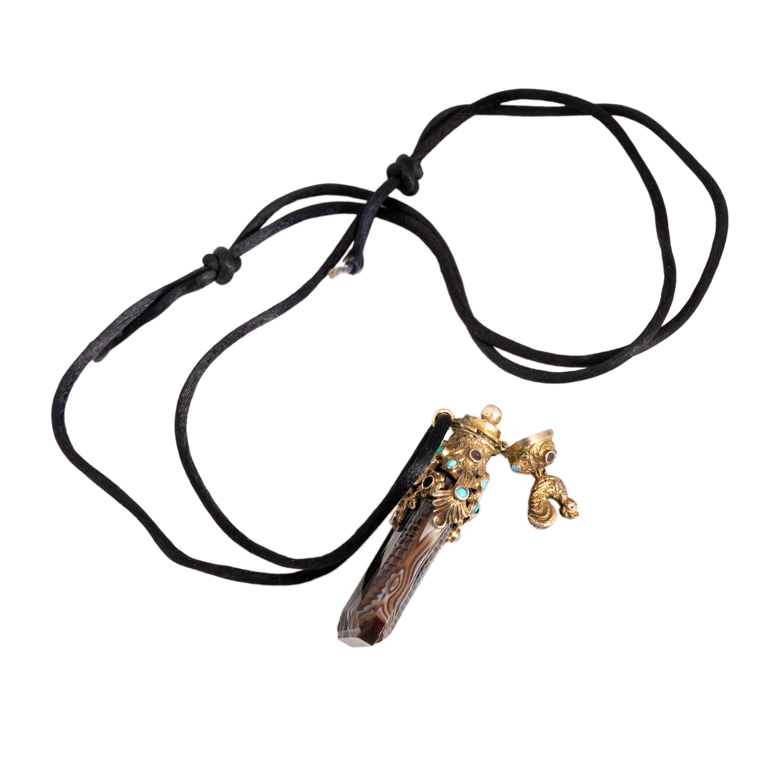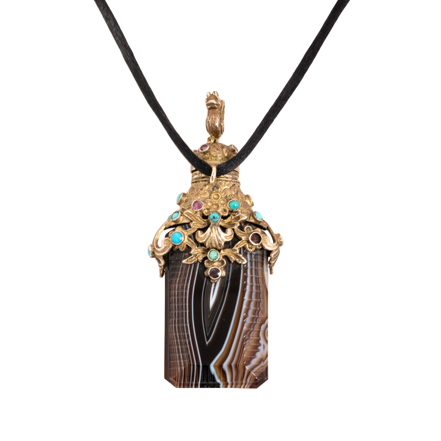 Pendant with faceted and engraved sardonyx, turquoise, garnets and opal on a necklace, Silver gold-plated, approx. 35 g, approx. 7.4 x 3.3 cm, minor signs of wear, 1 stone missing.