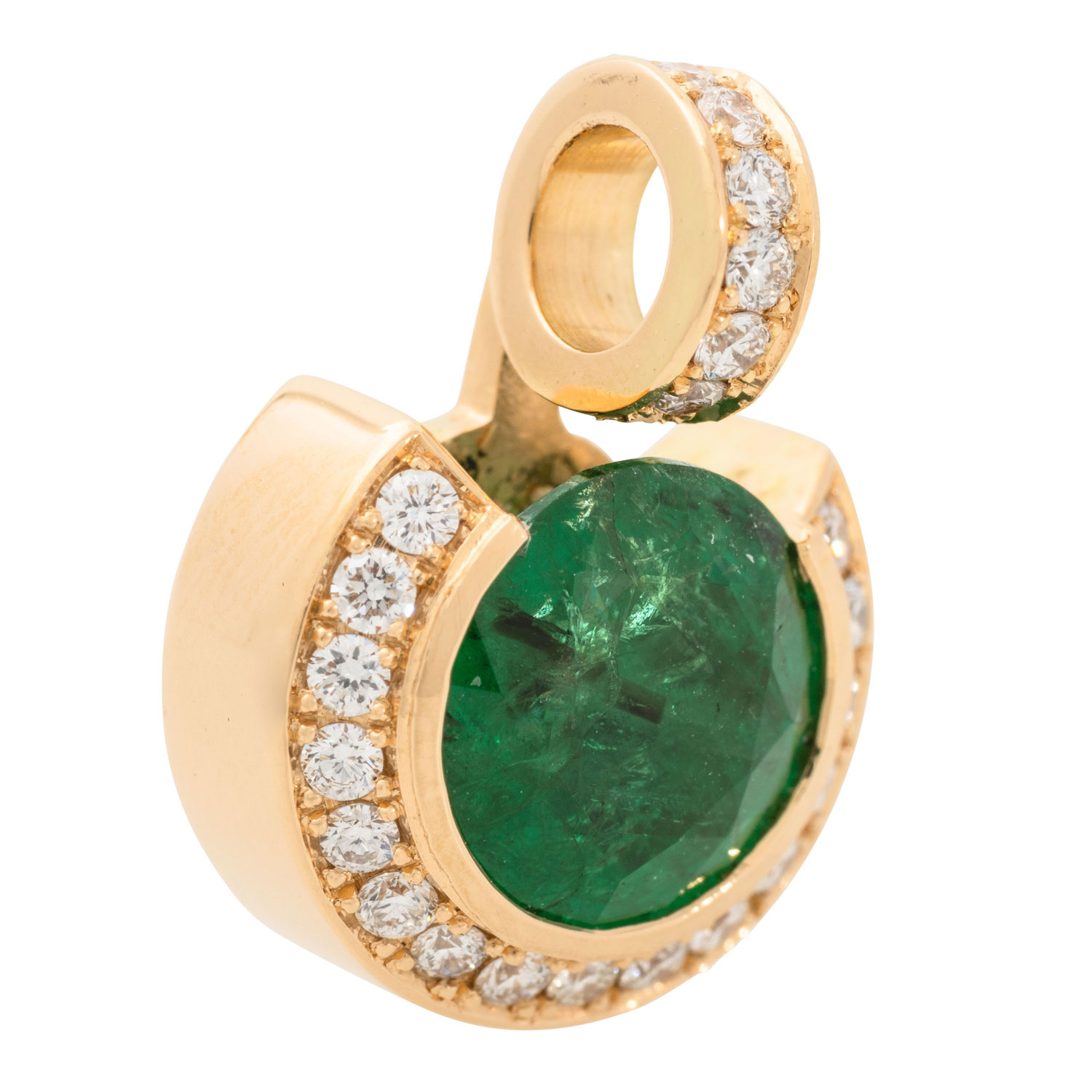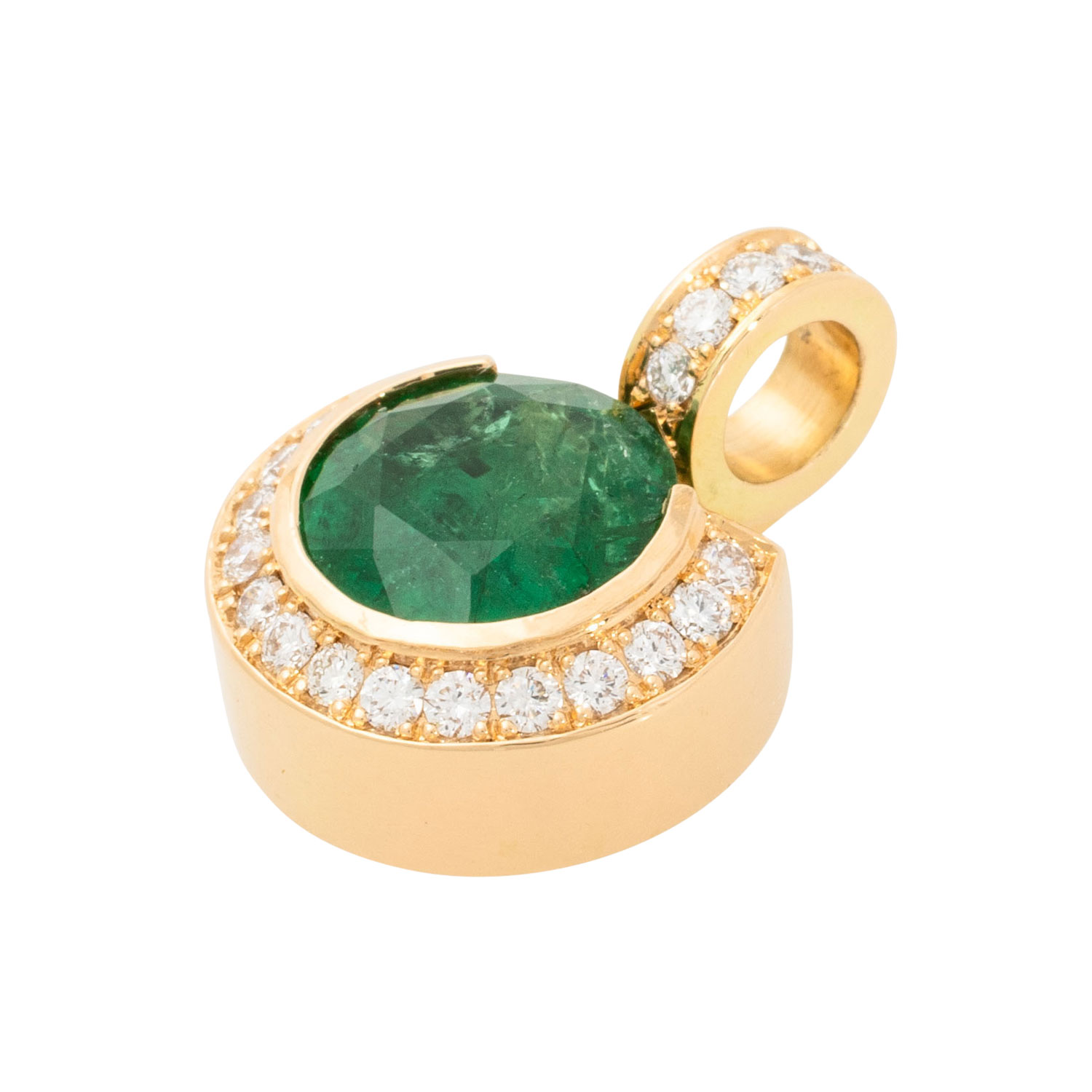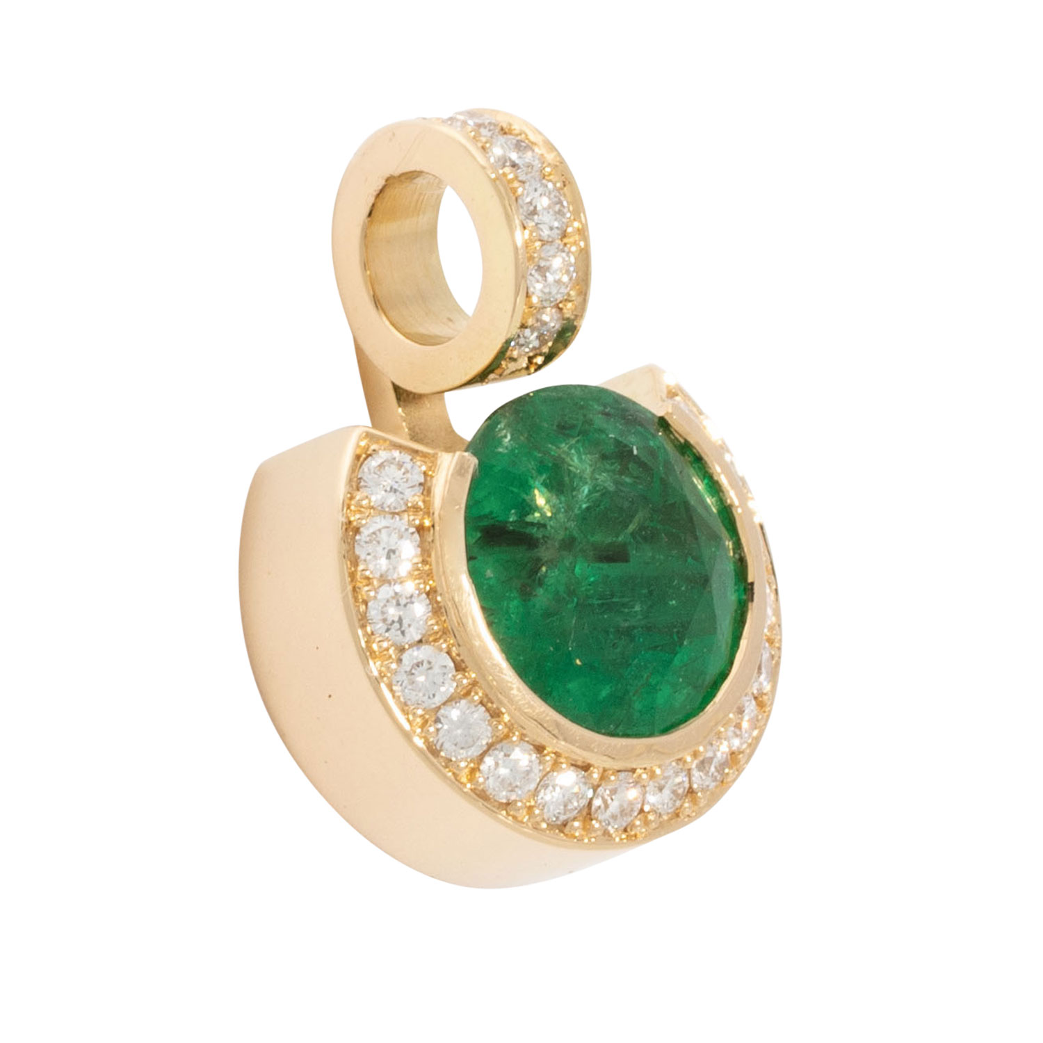 Pendant with fine emerald 2.04 ct and 22 brilliant-cut diamonds totalling ca. 0.28 ct, RW (G)/VS, YG 18K, 6.2 g, L x W 17.5 x 12.9 mm, 21st century, mint condition, high-quality goldsmith's work.