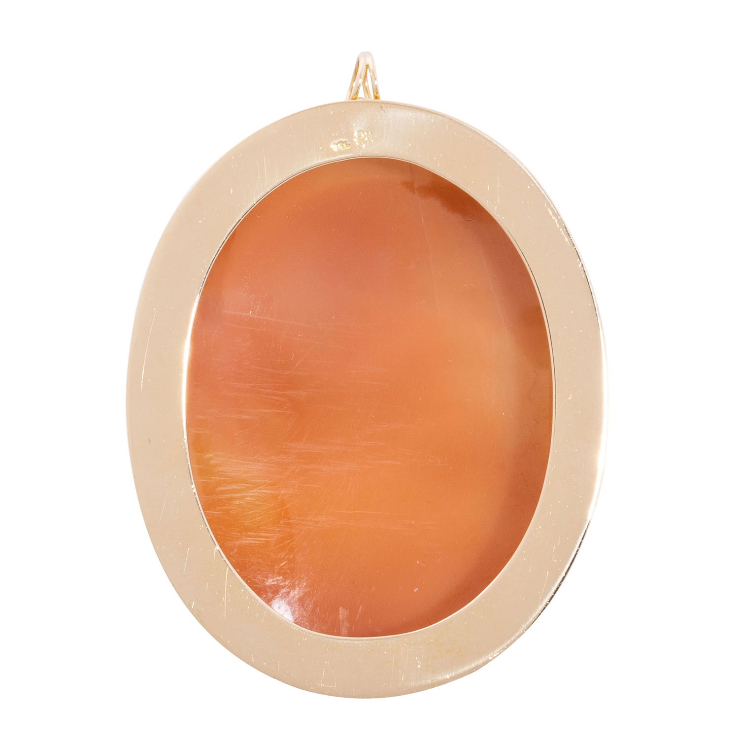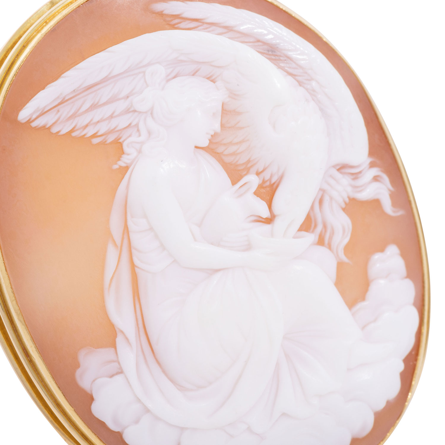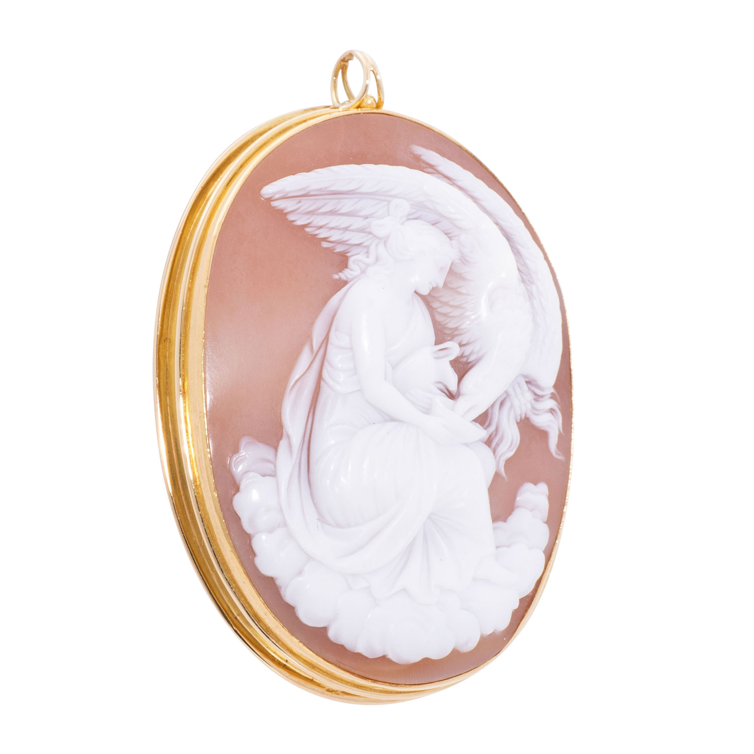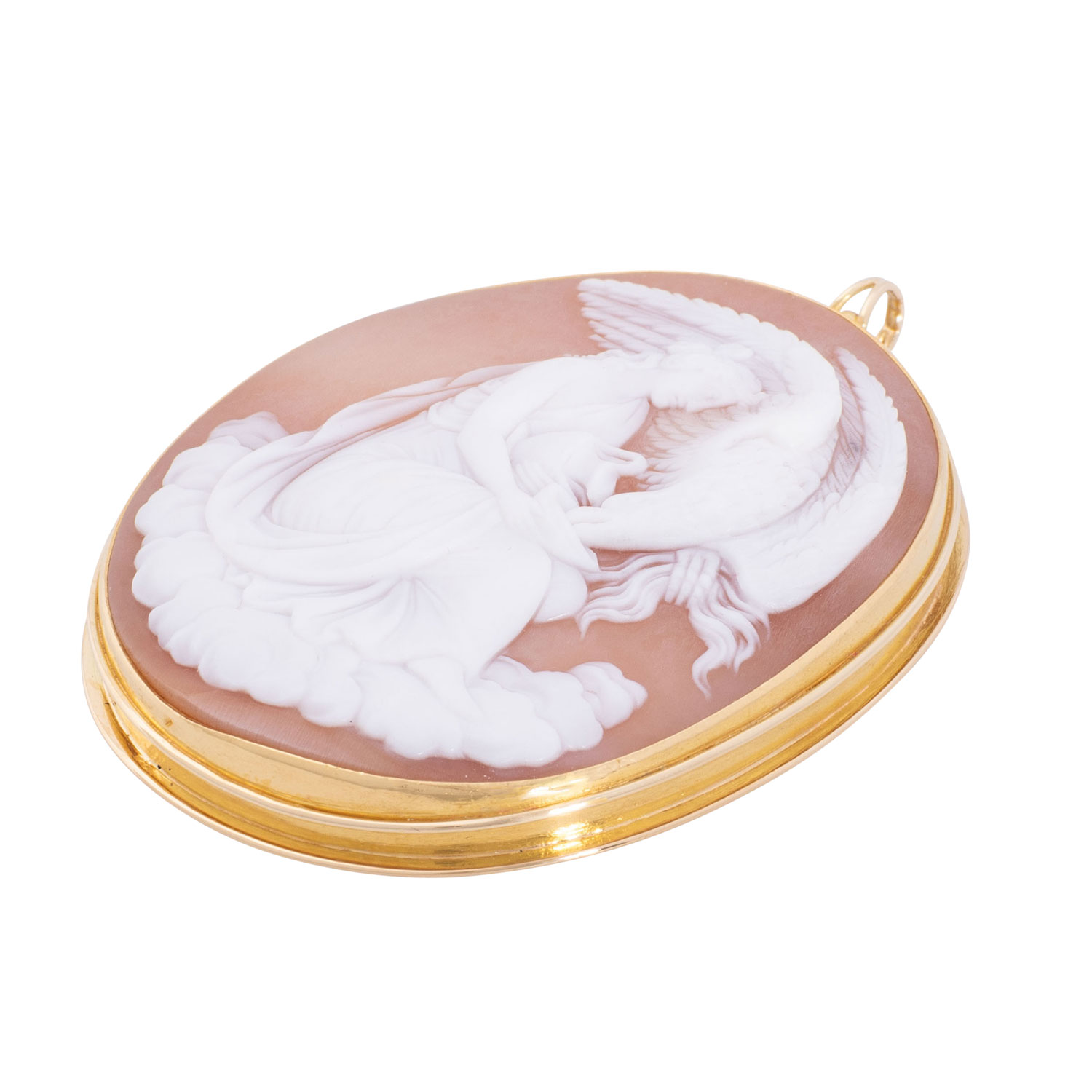 Pendant with fine shell cameo 'Hebe and Zeus' mounted in 18K yellow gold, 22.1 gr, L x B: 58 x 44 mm, 2nd half 20th century, minor signs of wear, depiction from the Greek mythology. Very sophisticated and masterly performed carving of best handcrafted quality.