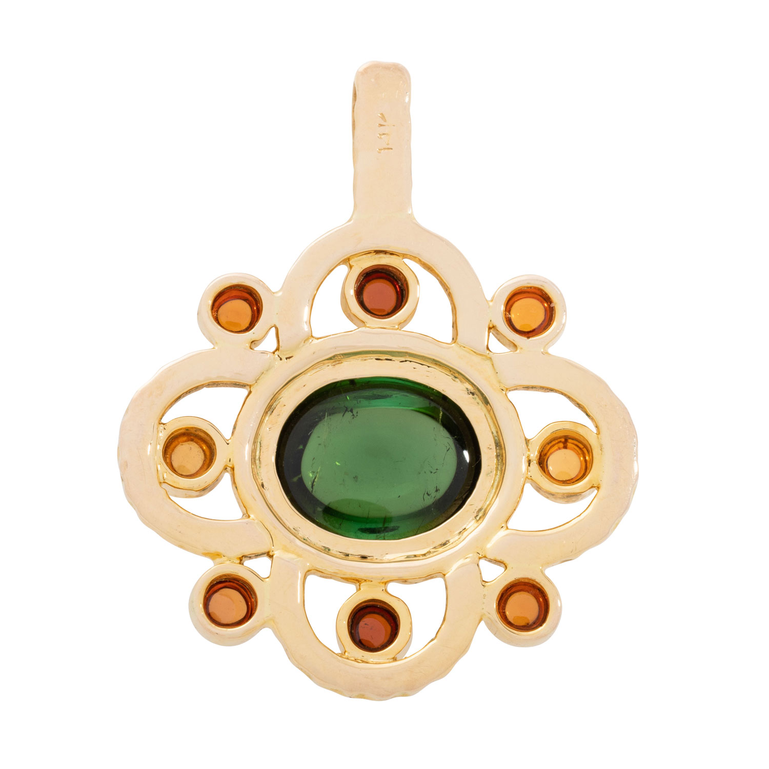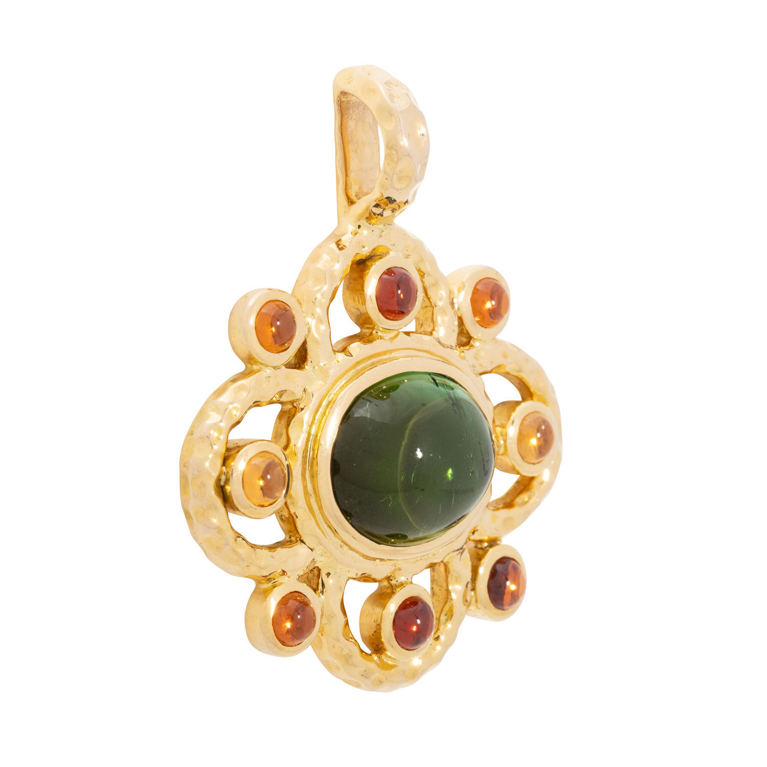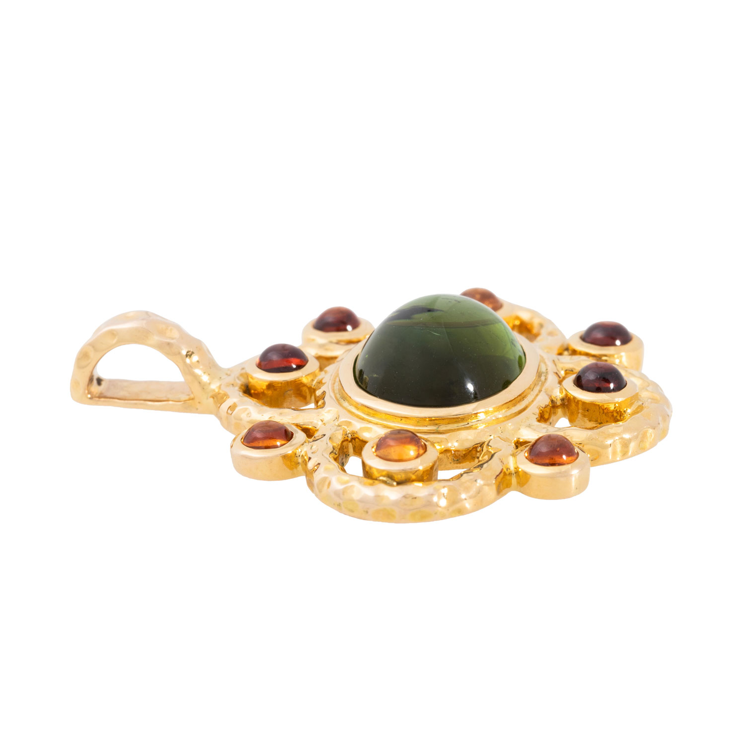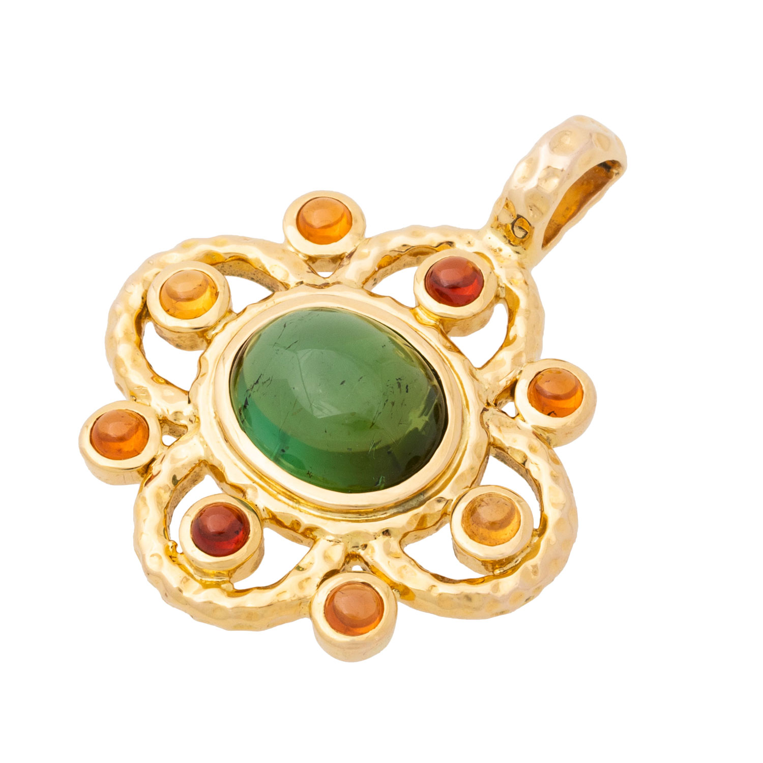 Pendant with green tourmaline, oval cabochon, ap. 11 x 9 mm, 8 round orange - yellow cabochons, D: ap. 2.6 mm, 14K yellow gold, 9.2 g, L x W: 34 x 27.5 mm, late 20th century, minimal signs of wear.