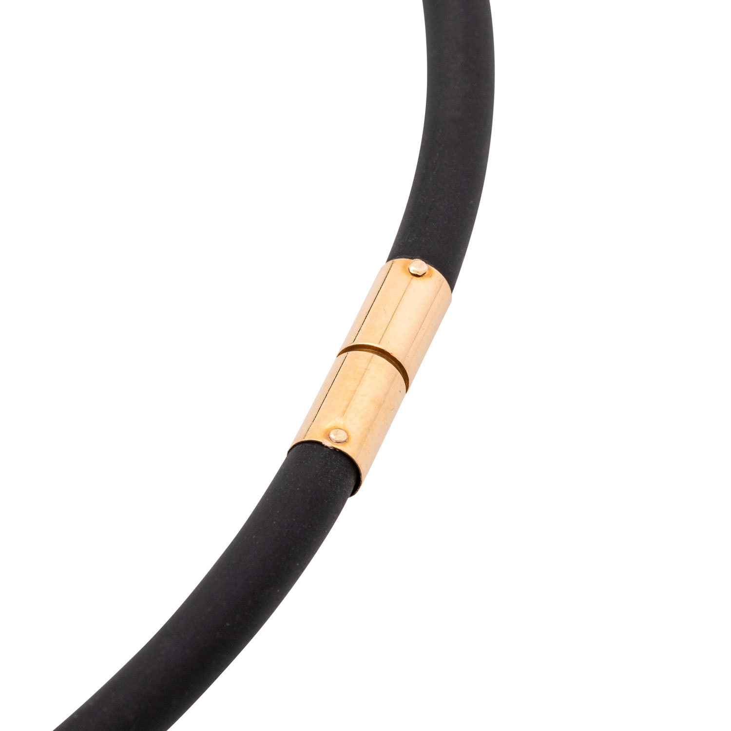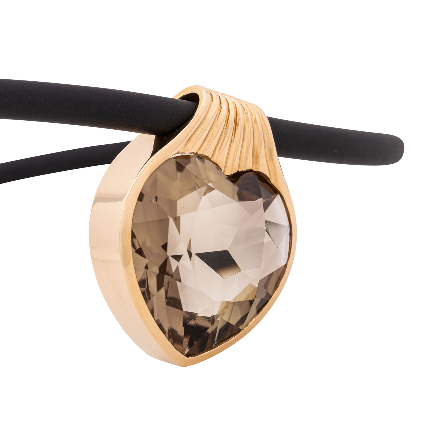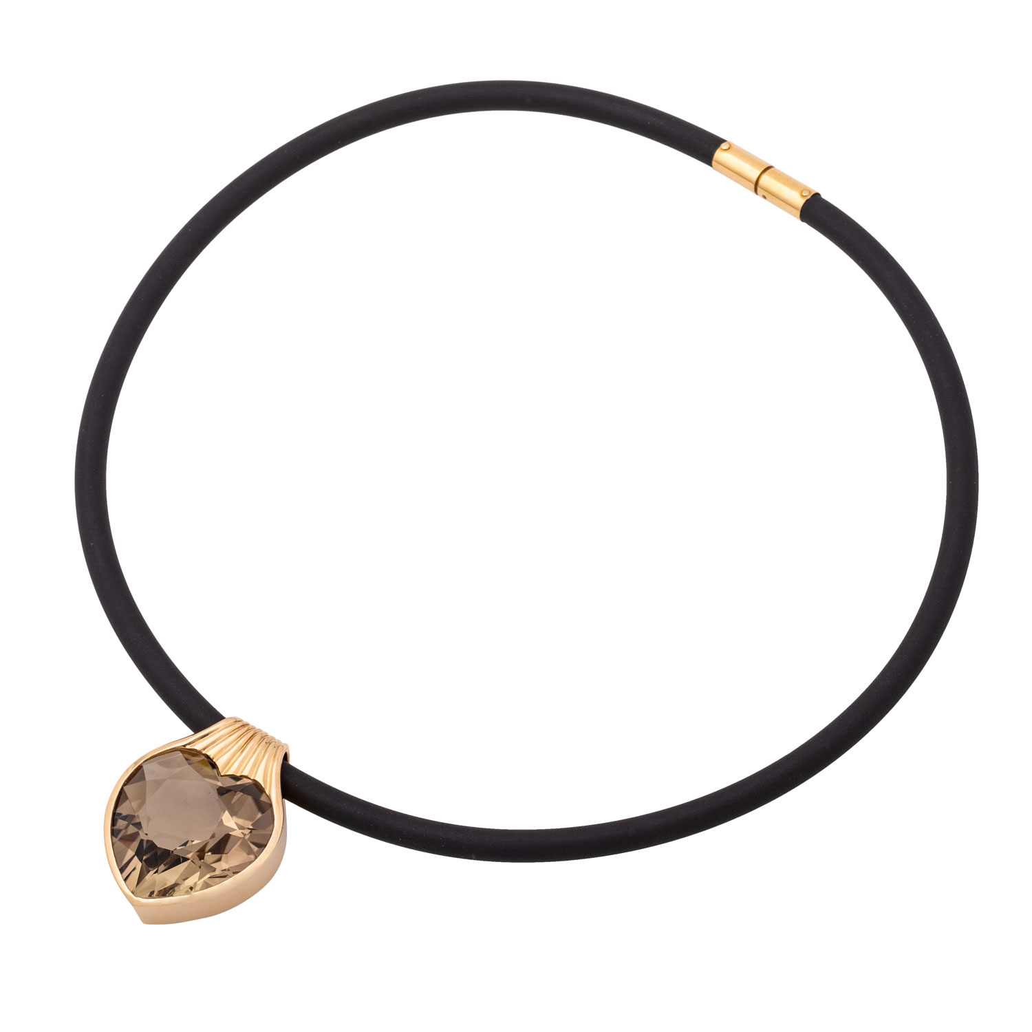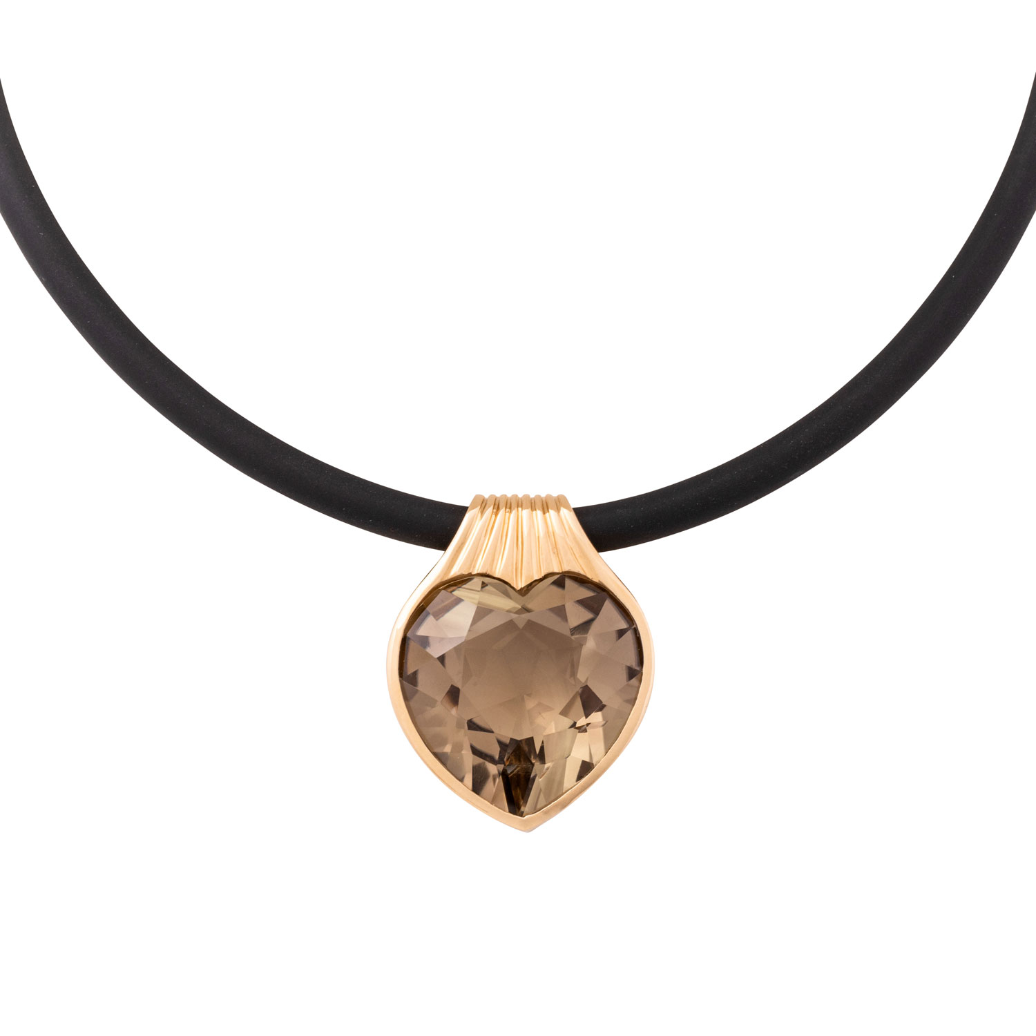Pendant with heart-cut faceted smokey quartz set in 18K yellow gold, 29.2 g, with rubber choker L: 44 cm, with bayonet clasp of 18K yellow gold, 20th/21st century, very good condition, high quality workmanship.