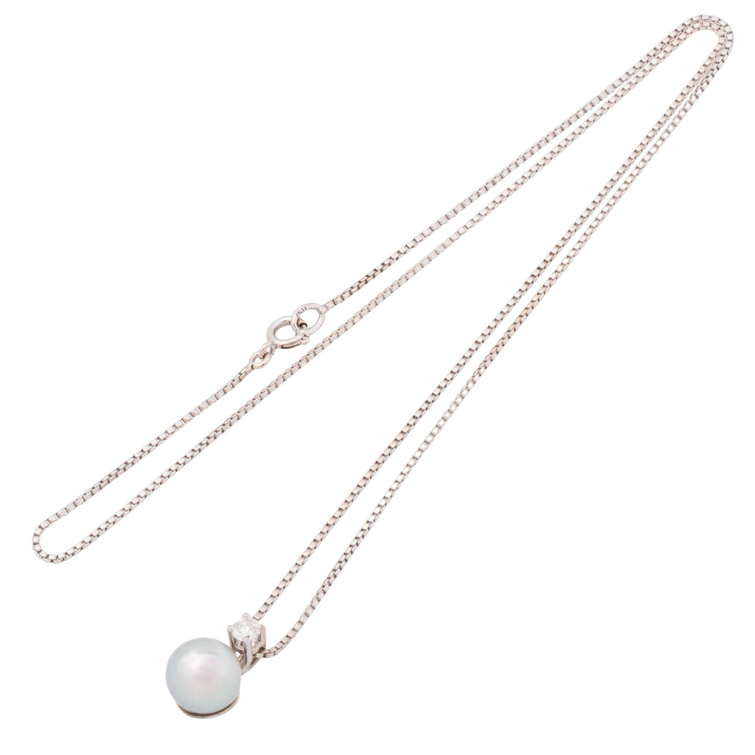 Pendant with brilliant-cut diamond, ca. 0.12 ct, WHITE (H)/P, light grey cultured pearl ca. 8 mm, very nice lustre, venezian box chain, L: ca. 43 cm, 18K white gold, 4.8 g, mid 20th century, minimal signs of wear.