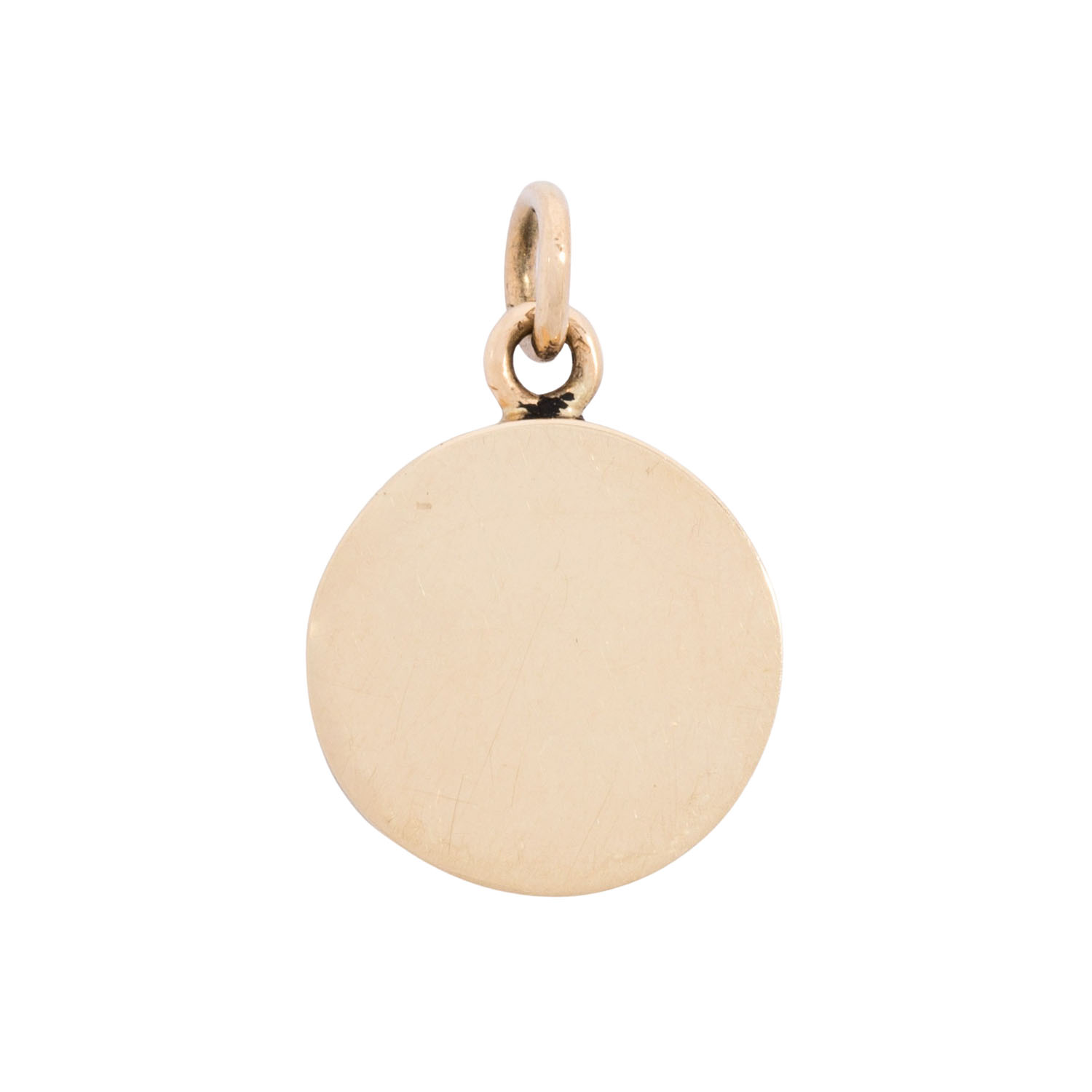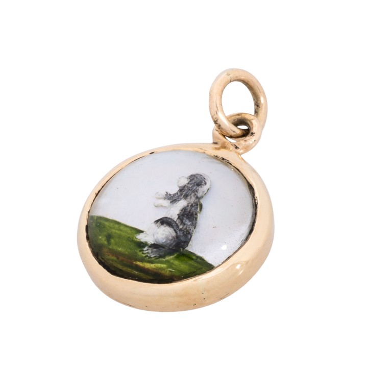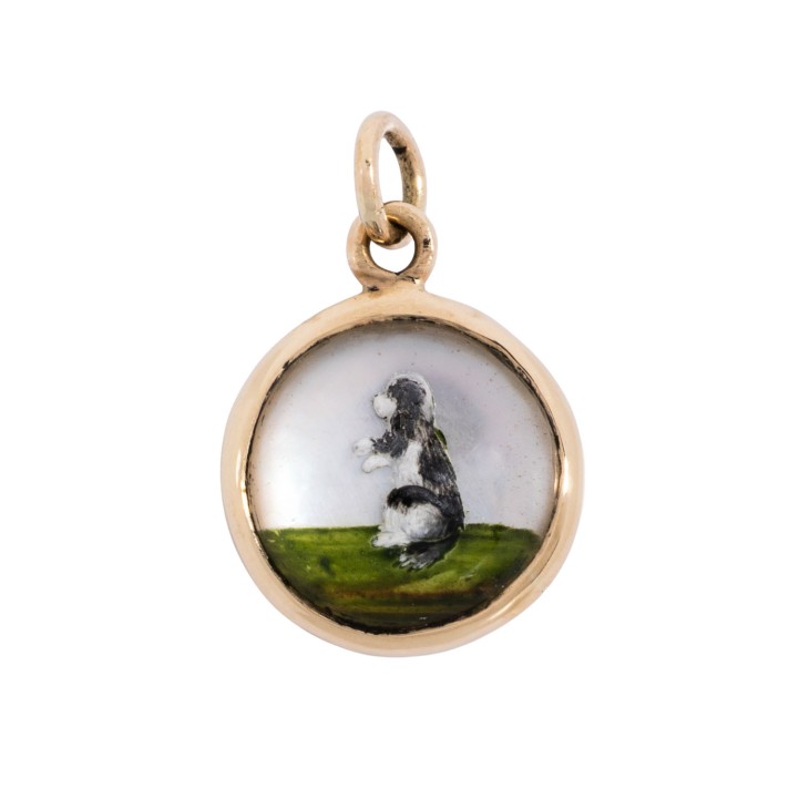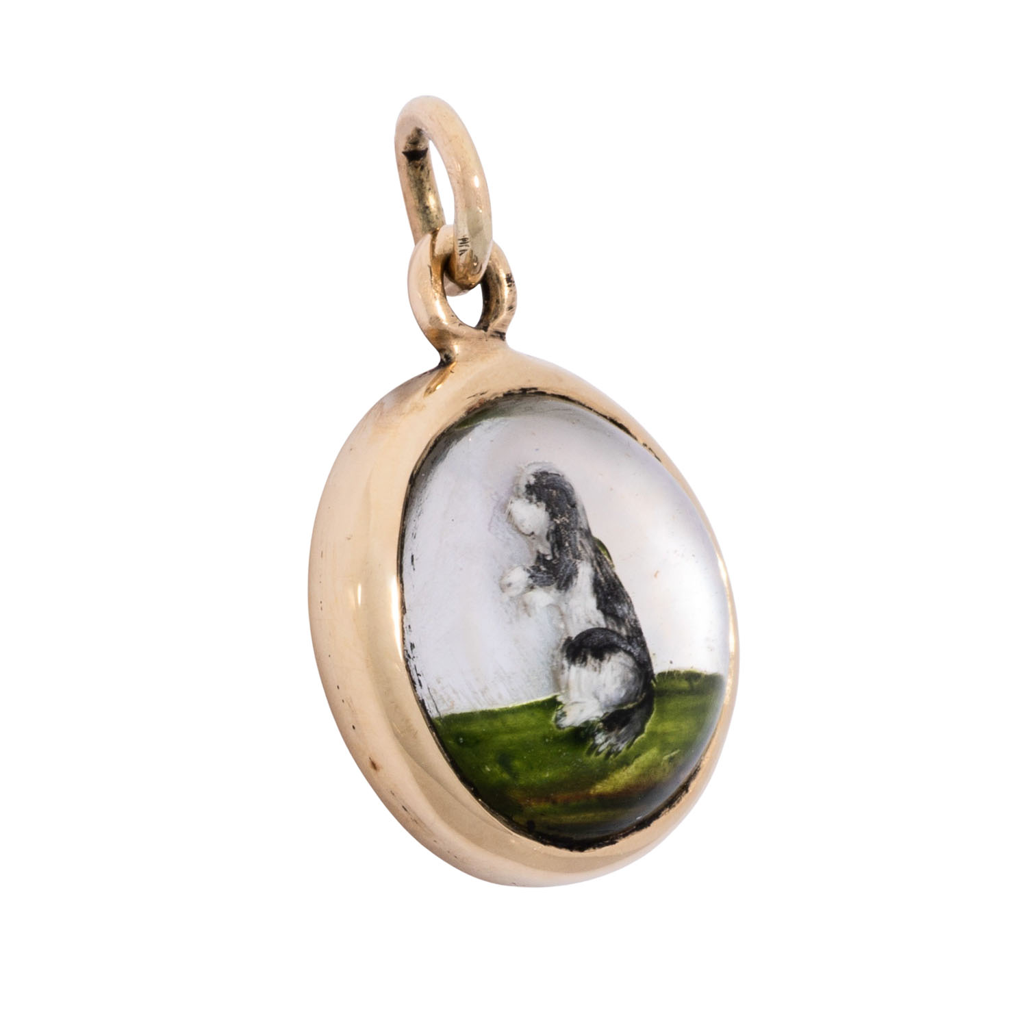 Pendant with painting 'Doggie', reverse painting in engraved enamel, 14K YG, 2.6 g, D: ca. 14 mm, around 1900, good condition consistent with age.