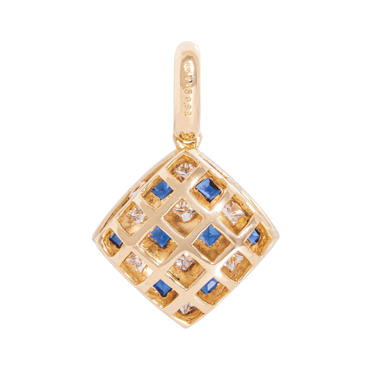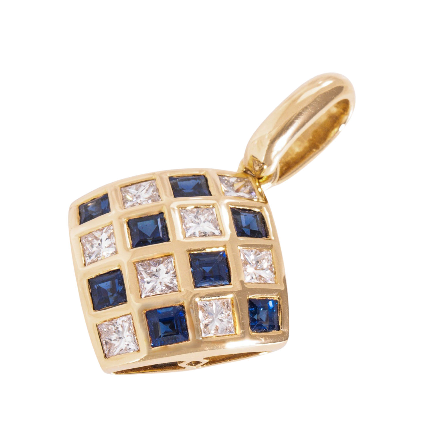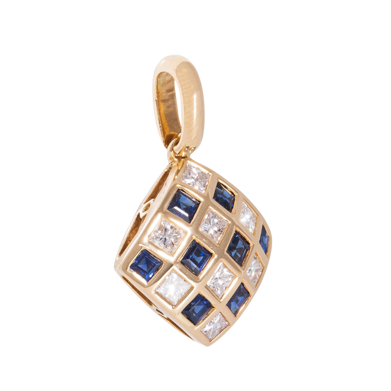Pendant with princess- cut diamonds totalling ca. 0,82 ct (engraved), good colour and clarity and carée- cut sapphires totalling ca. 1,15 ct (engraved). GG 18K, 4,4g. length ca. 3,7 cm, 20th/ 21st century, minimale signs of wear.