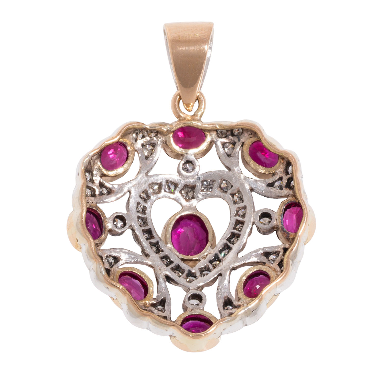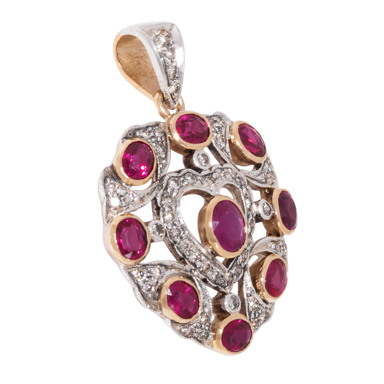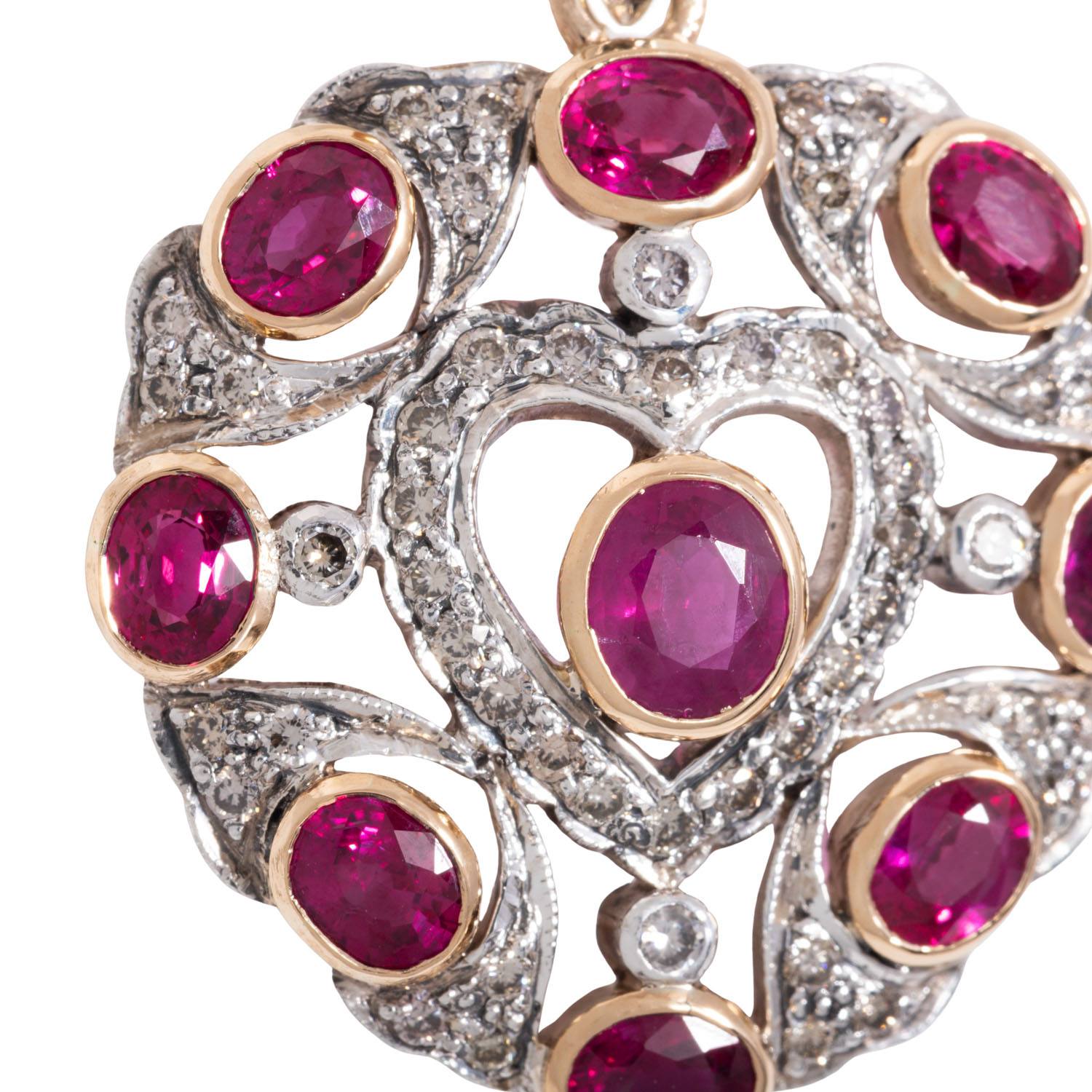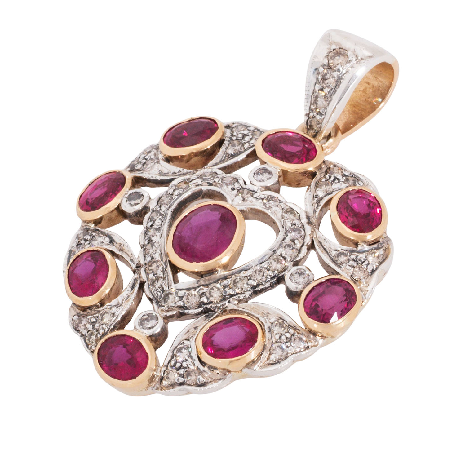 Pendant set with oval-cut rubies totalling approx. 3.0 ct, probably burma, brilliant-cut diamonds totalling approx. 0.60 ct, good colour, low clarity, 18K YG and silver, 8.2 g, 20th century, minor signs of wear.