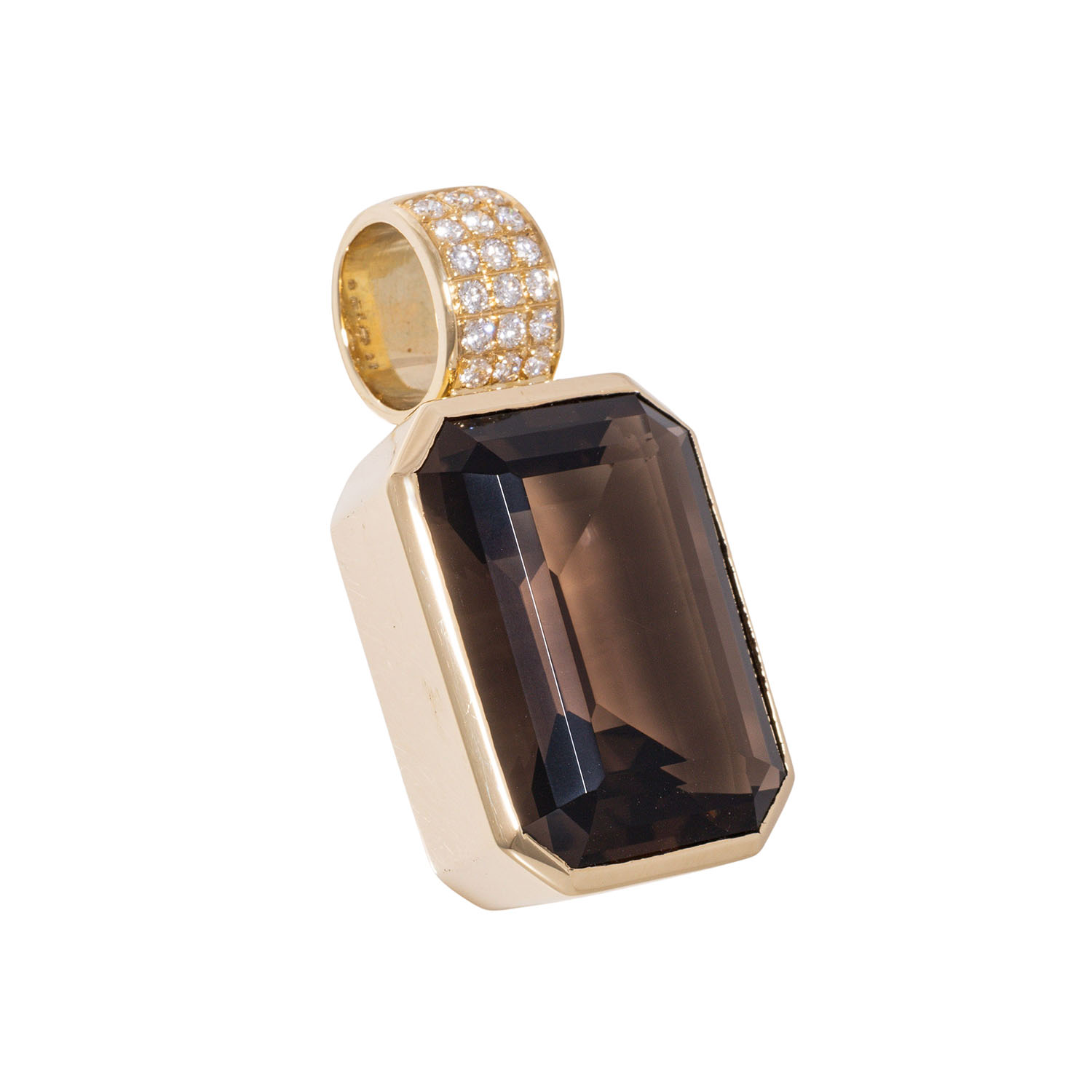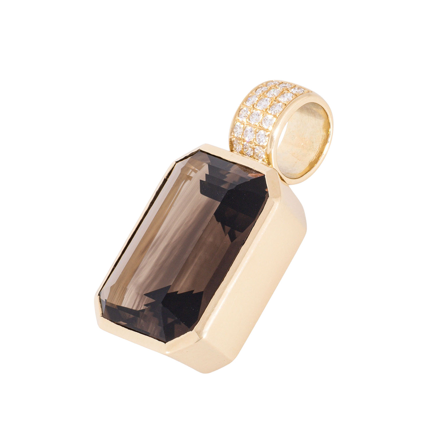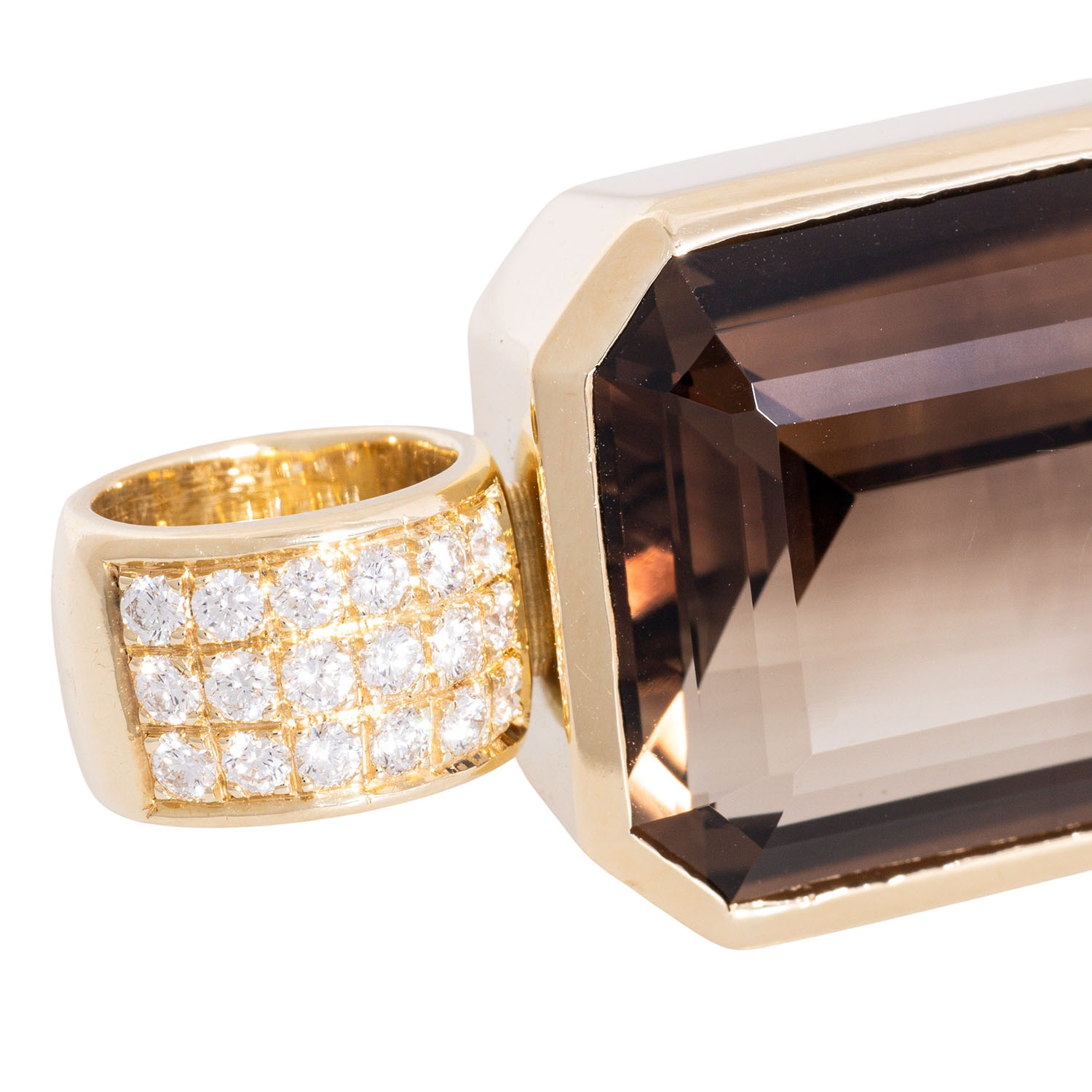 Pendant with smoky quartz, octogonal step cut, ap. 24 x 18 mm, 18 brilliant cut diamonds, totalling ap. 0.36 ct, good colour and clarity, 14 K yellow gold, 18.5 g, L x W: ap. 28 x 20 mm, late 20th century, minimal signs of wear.