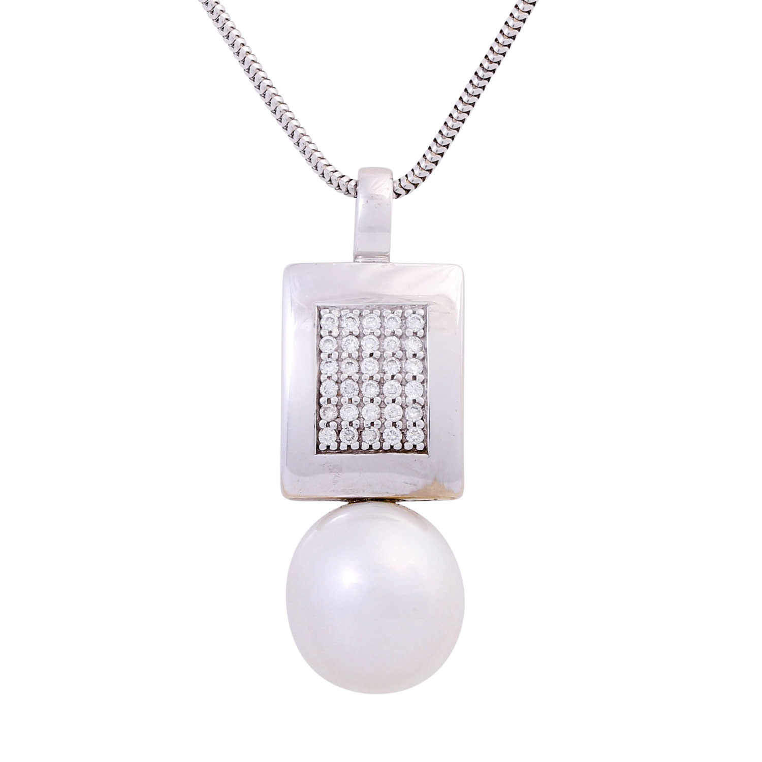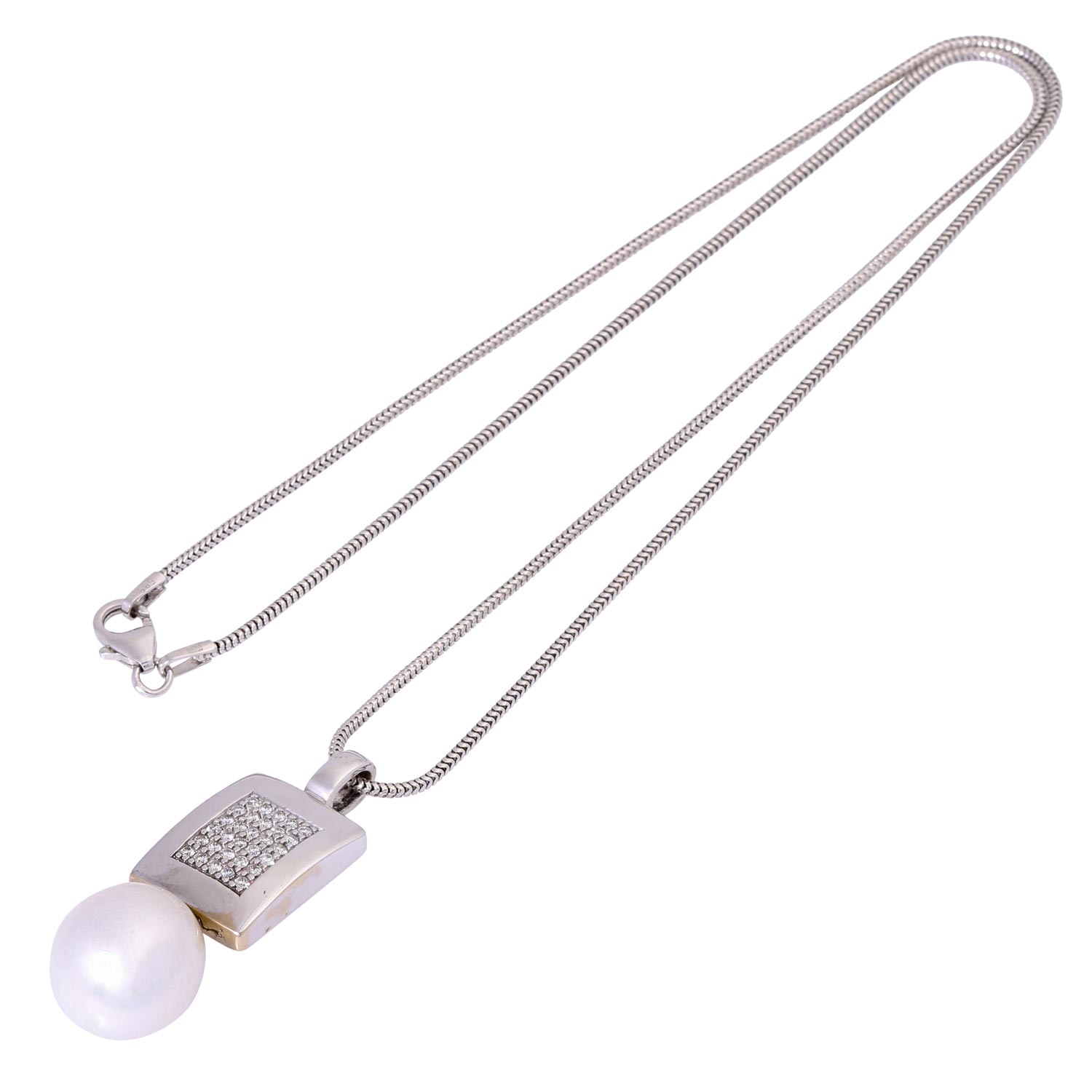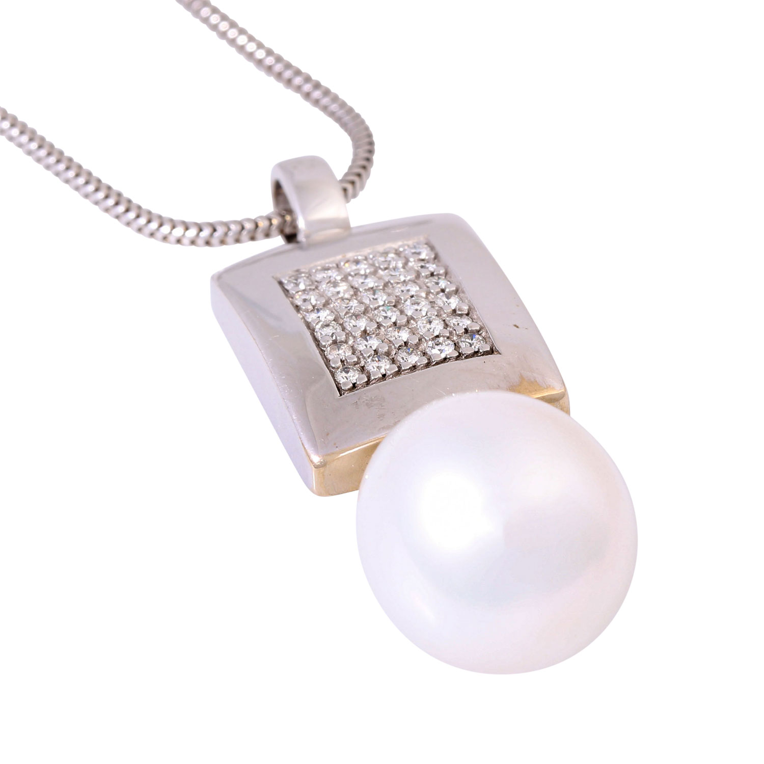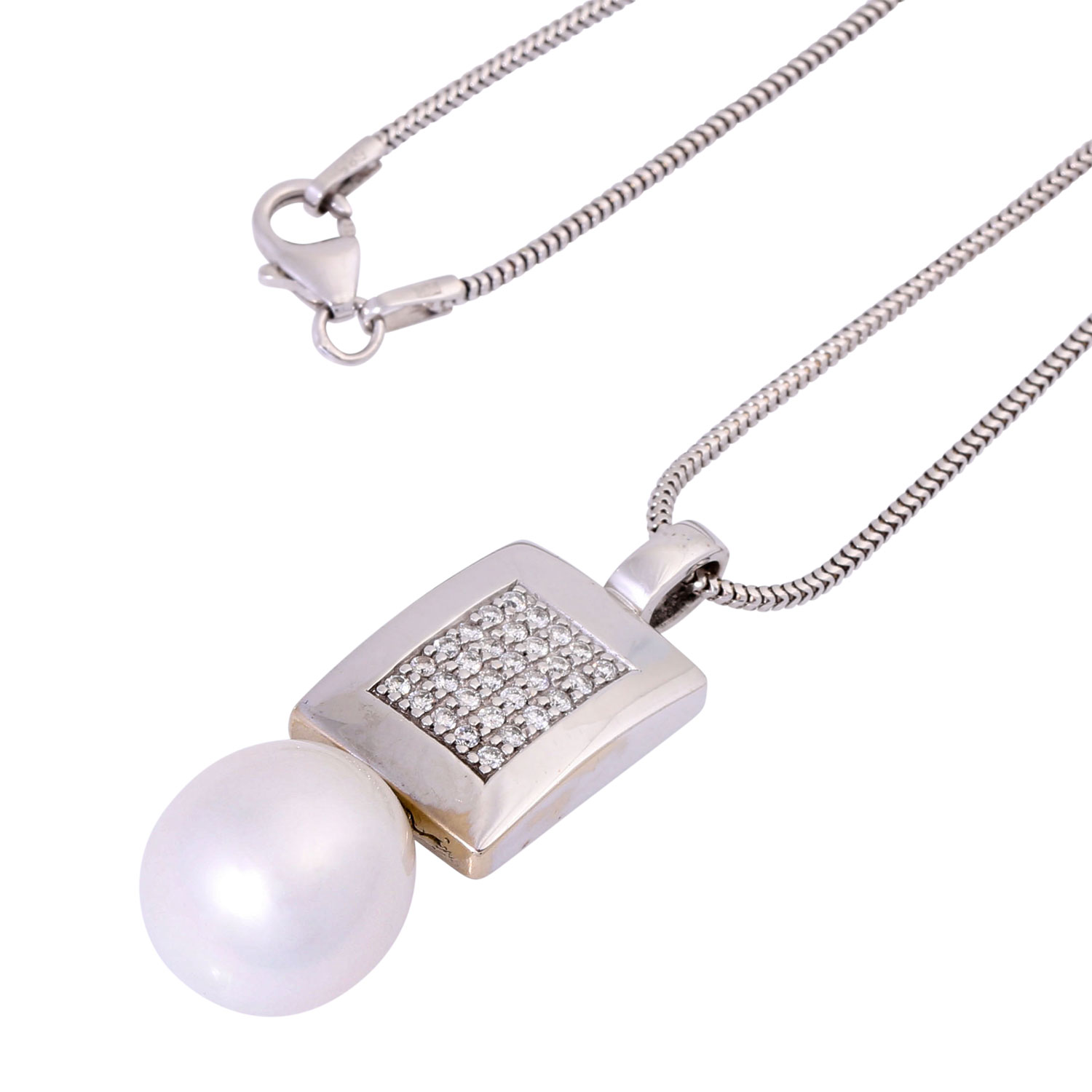 Pendant with South Sea pearl and 30 brilliant-cut diamonds, total ca. 0.24 ca. WHITE (H)/SI South Sea cultured pearl with fine lustre and growth marks, D: ca. 12 mm on fine snake chain, WG 14K, 10.8 g, chain length 41.5 cm, 21st century, minimal signs of wear.