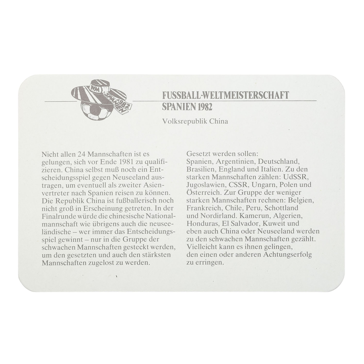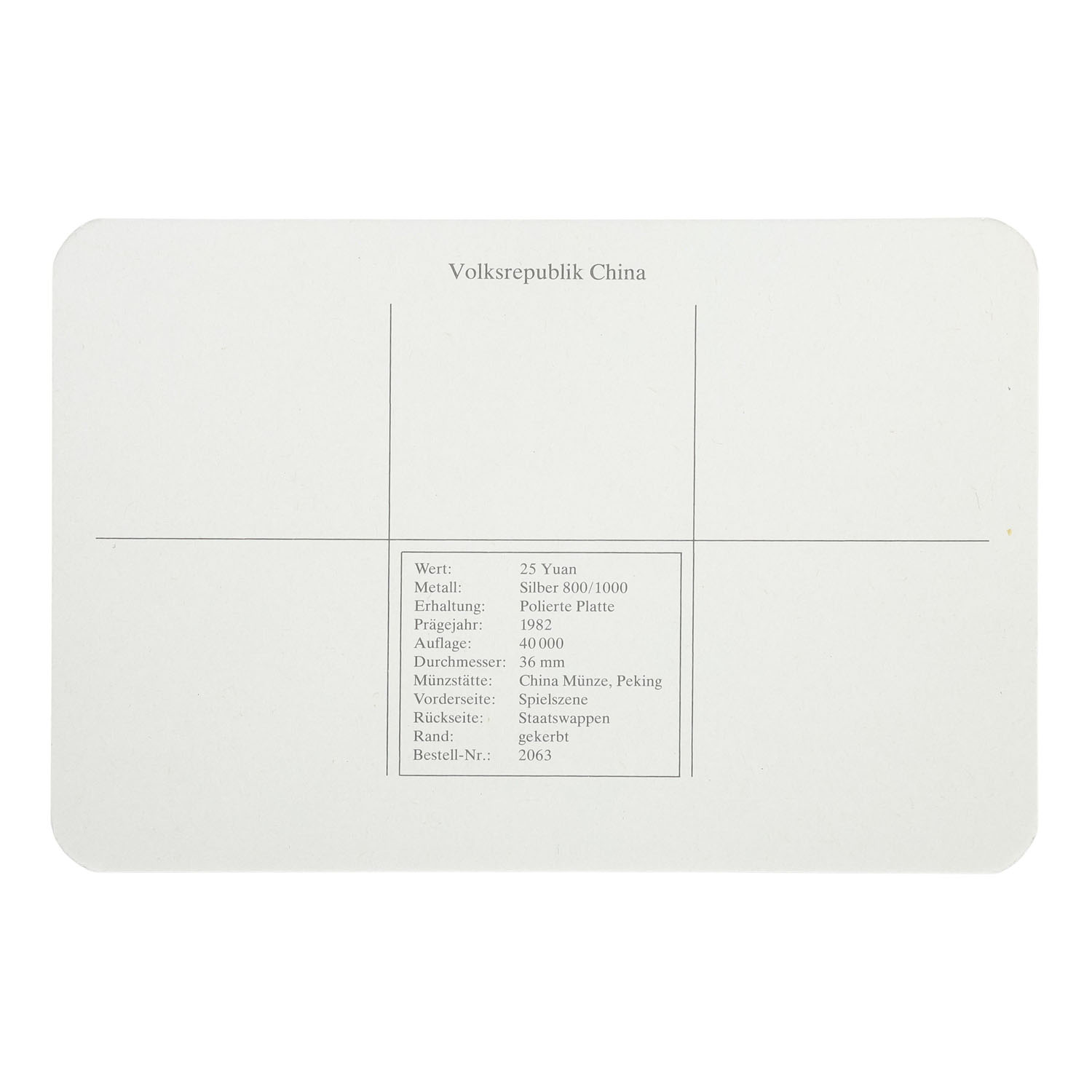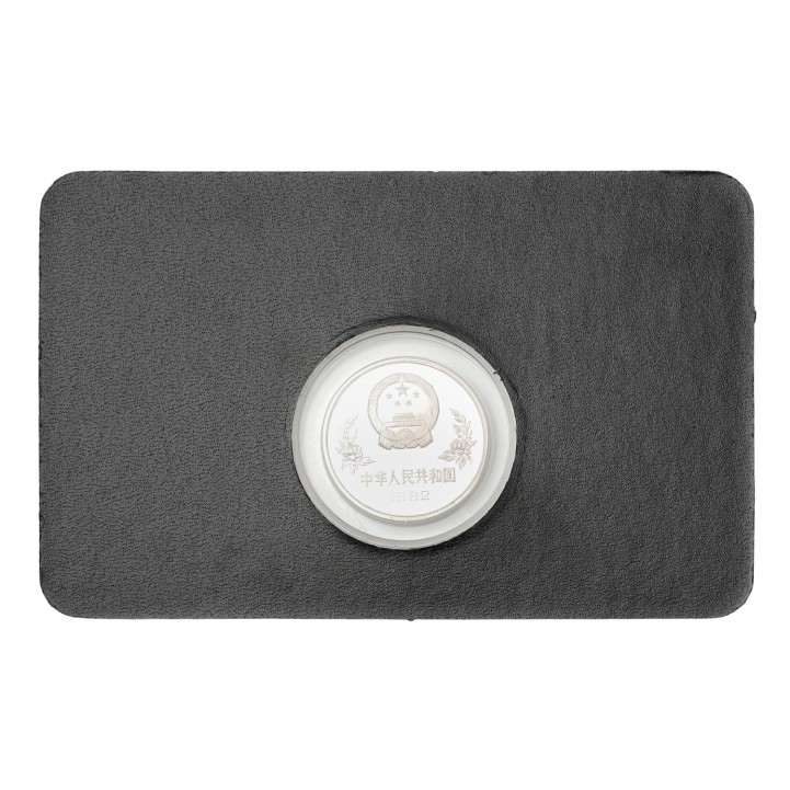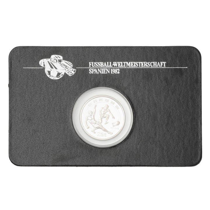 People's Republic of China/SILVER - 25 Yuan 1982 Soccer World Cup, impaired proof, scratches, fingerprints, white coating, encapsulated with certificate, 15.5g fine silver.
