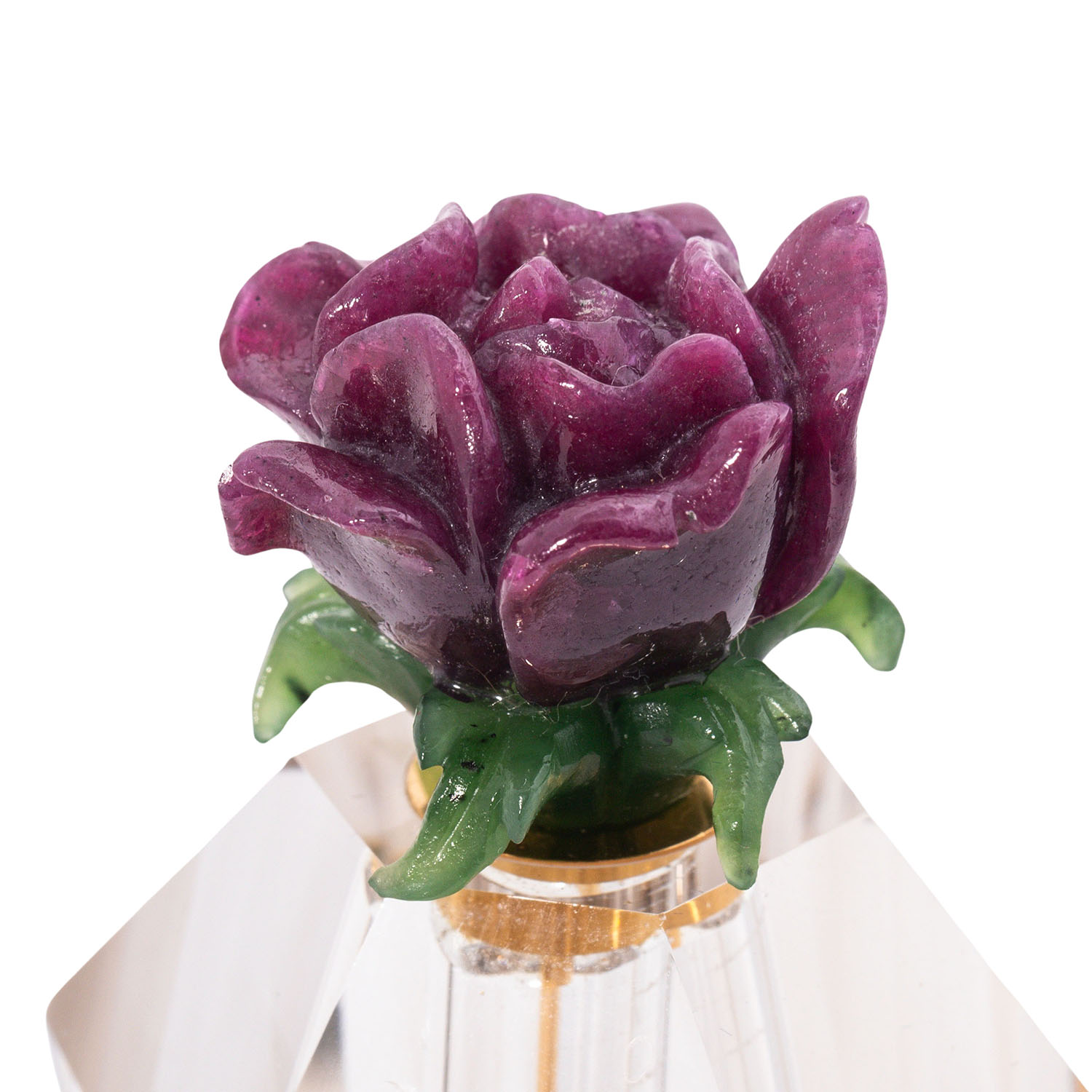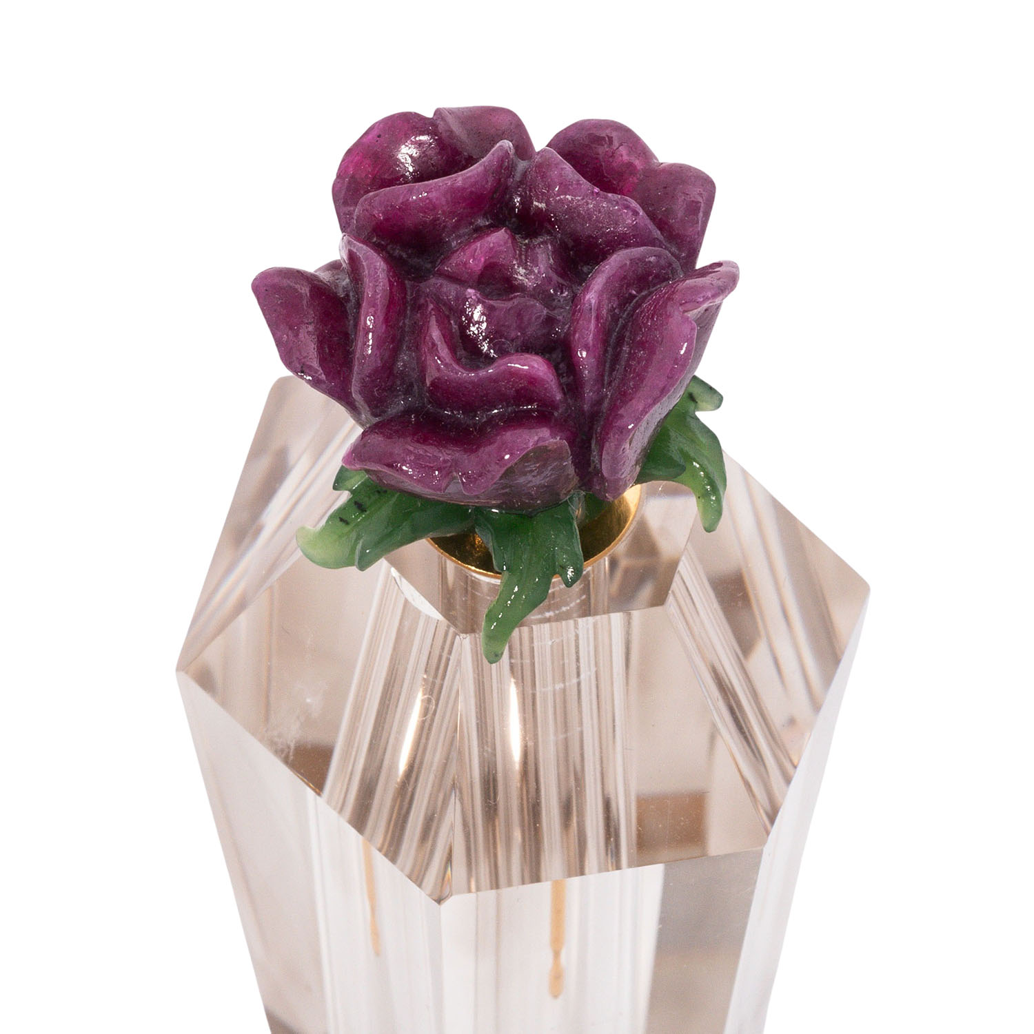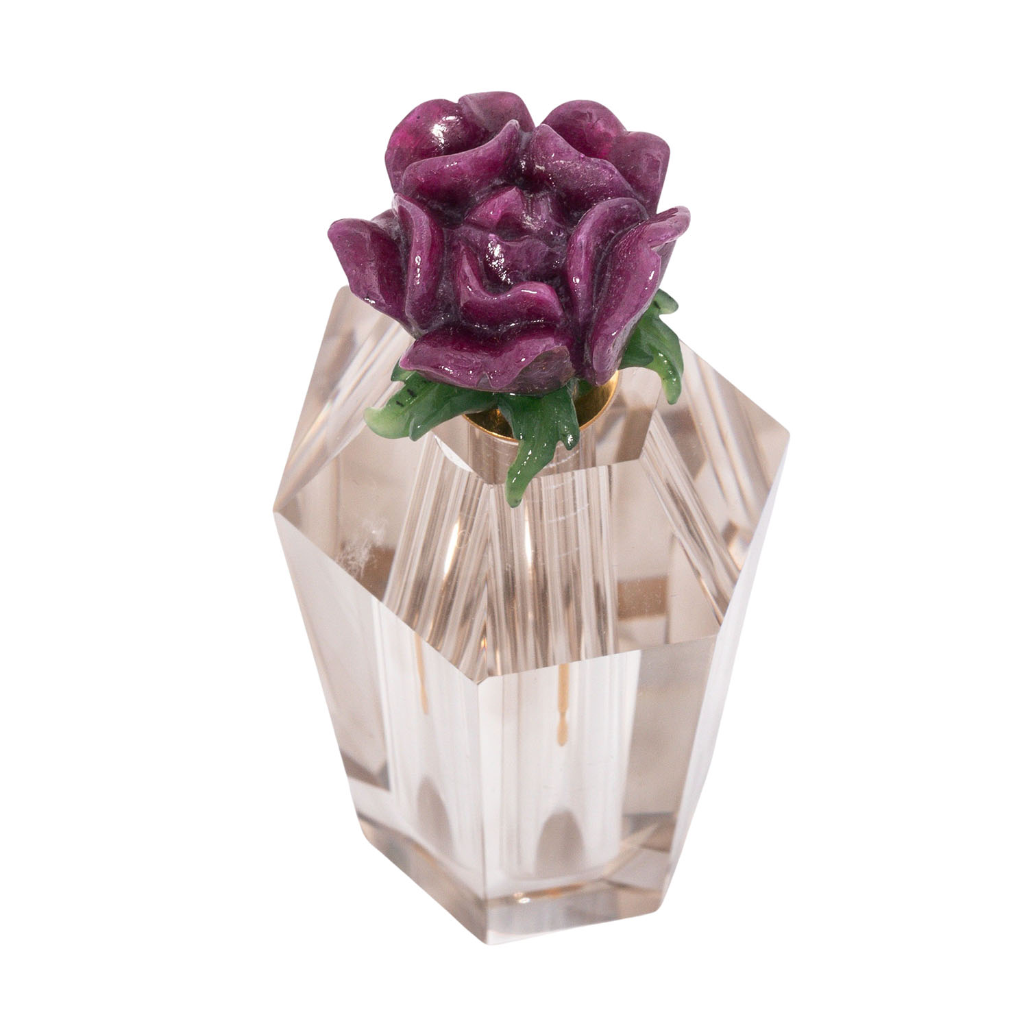 Perfume flacon made of rock crystal with wit bottle plug made of ruby/jade, H: ca. 9 cm, 170.7 gr, 20th/21st century, good condition.