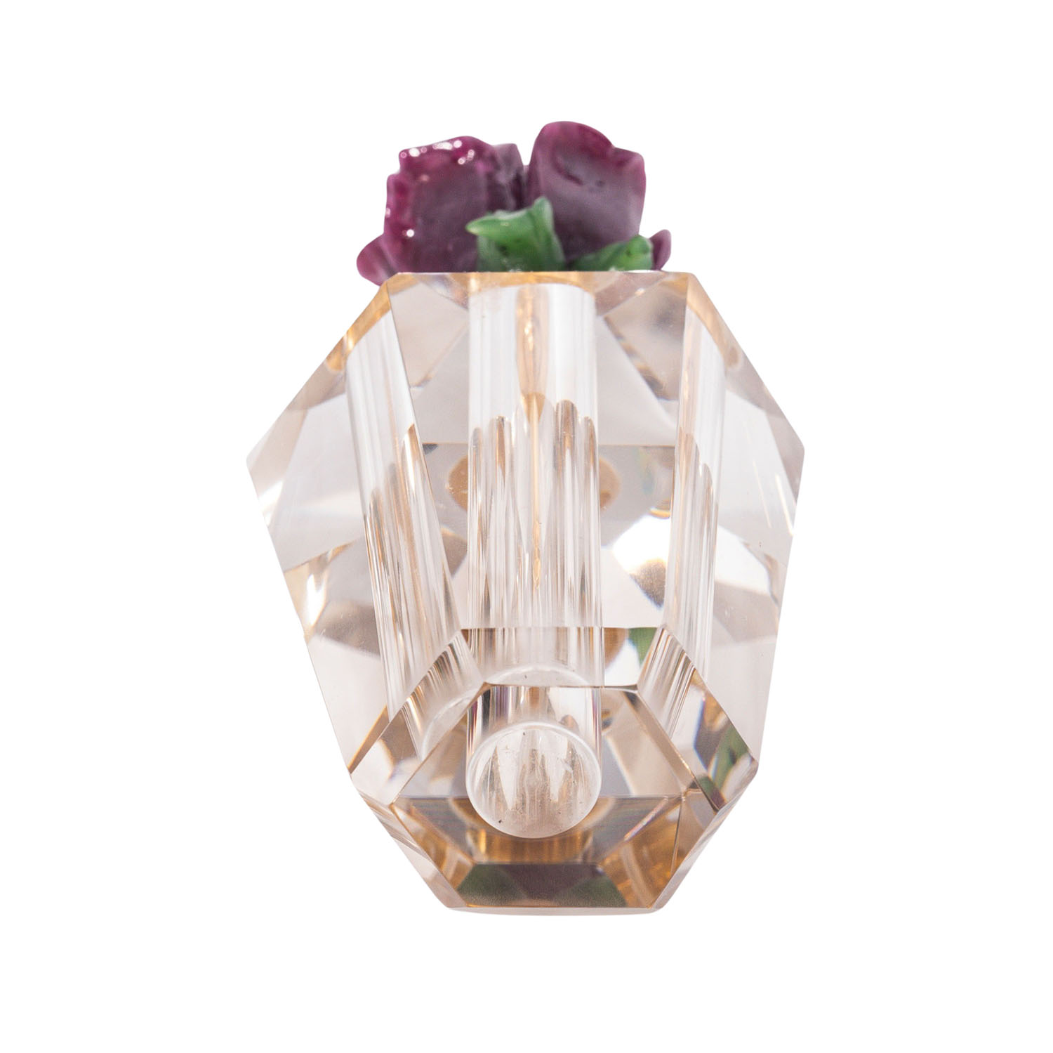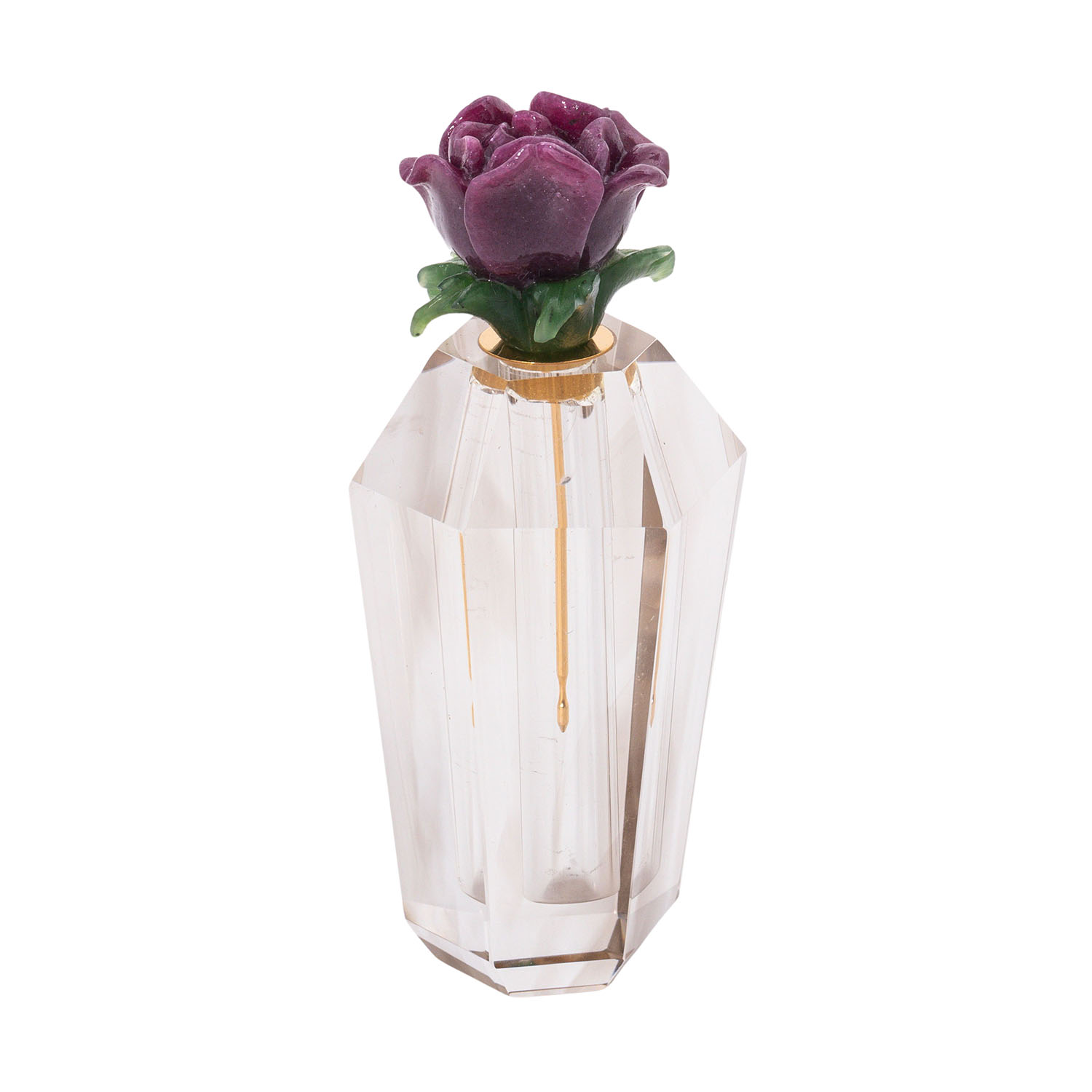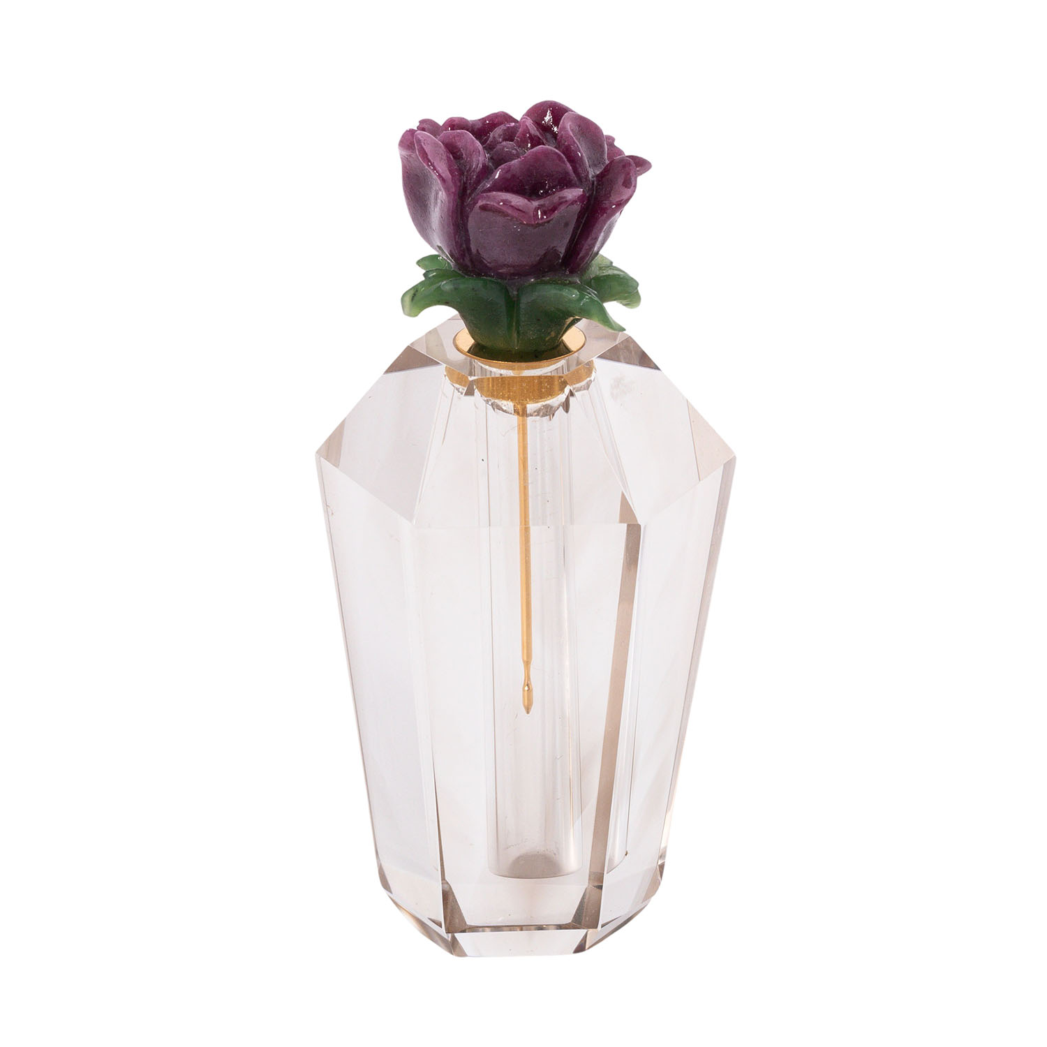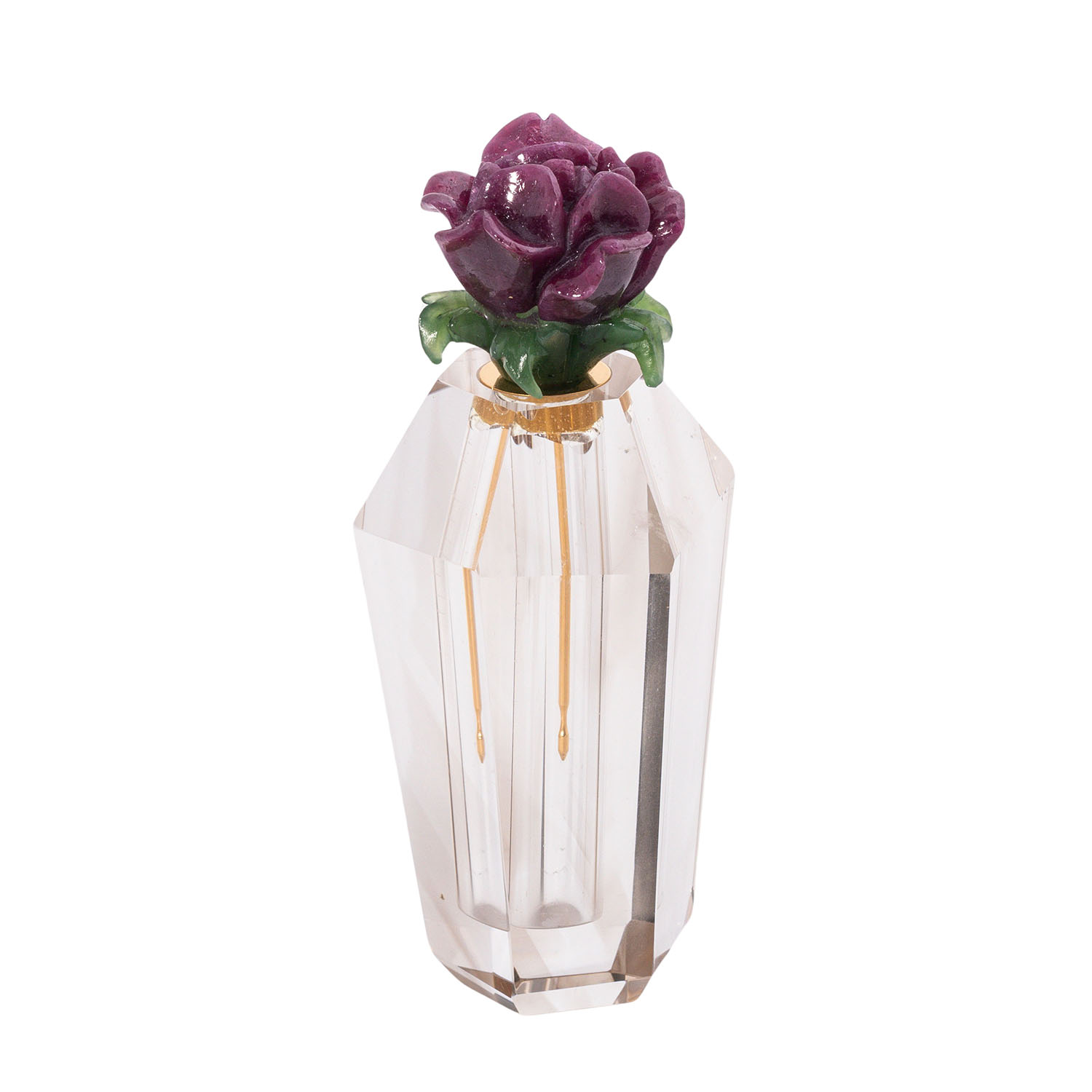 Perfume flacon made of rock crystal with wit bottle plug made of ruby/jade, H: ca. 9 cm, 170.7 gr, 20th/21st century, good condition.