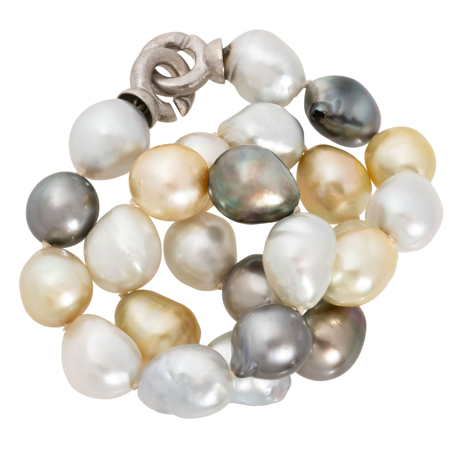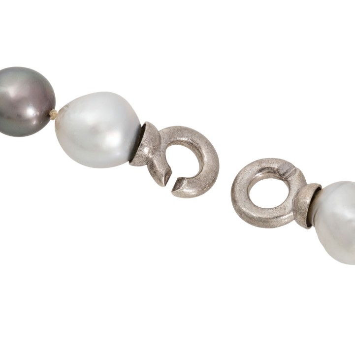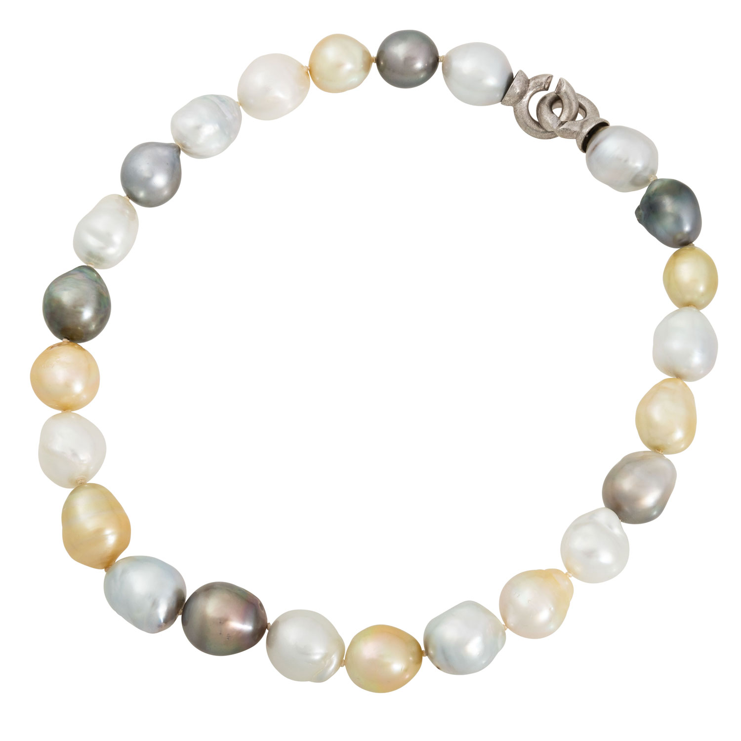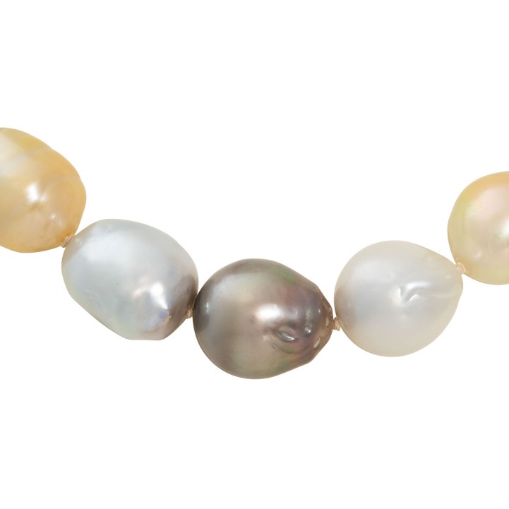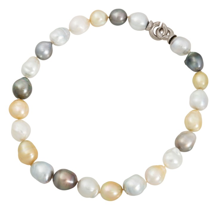 Pearl necklace, multicoloured, 24 South Sea and Tahiti cultured pearls, baroque shape, with growth marks, on silver clasp, 148.3 g, L: 49 cm, 21st century, good condition.