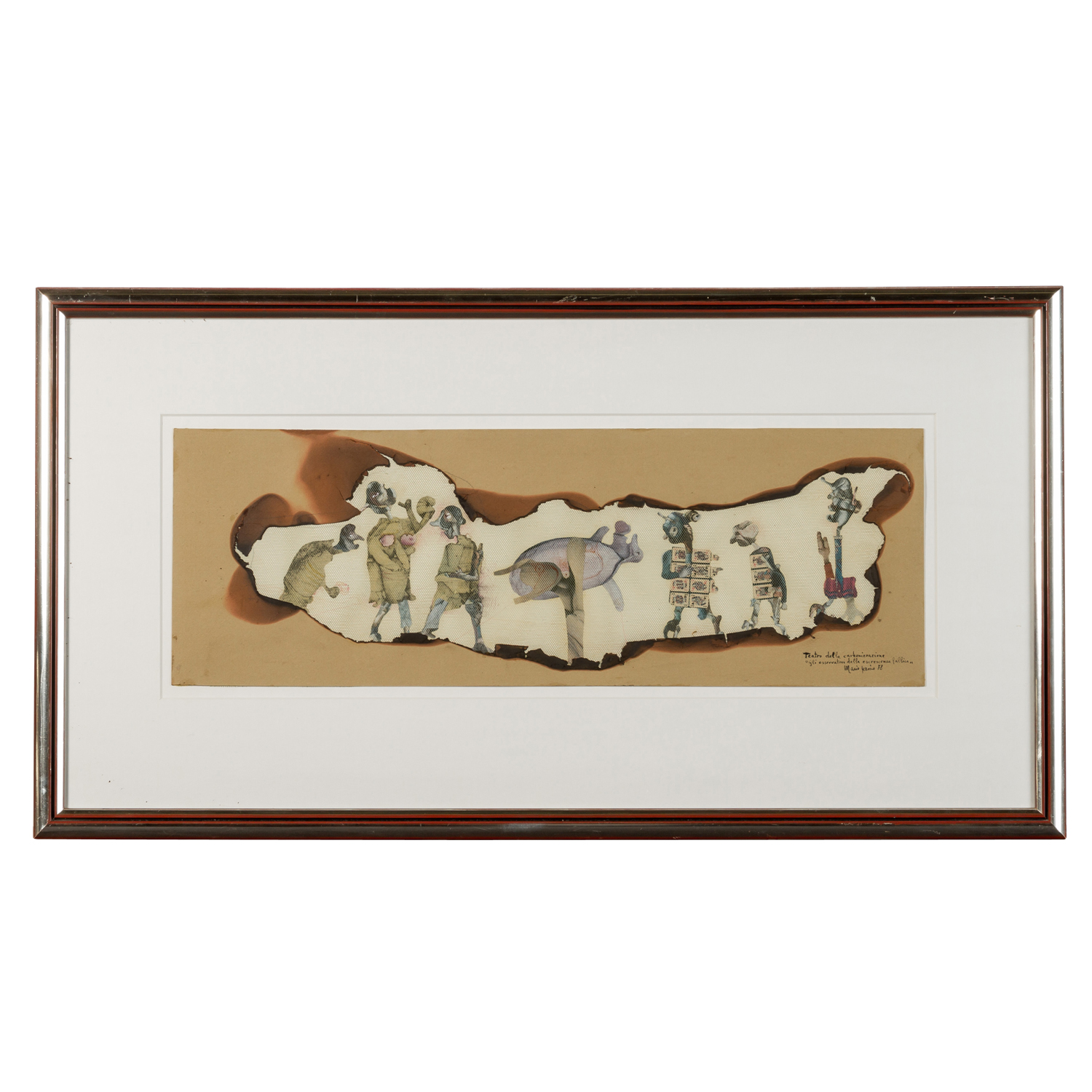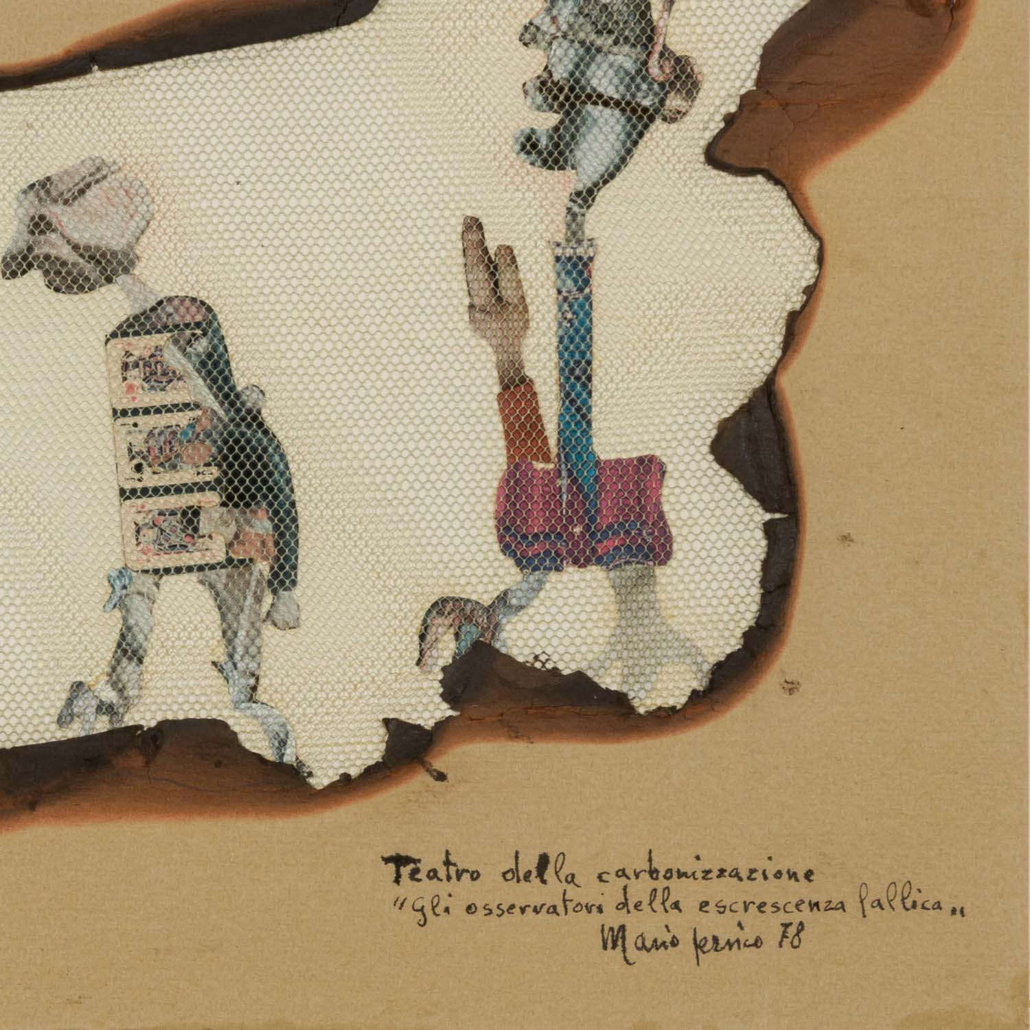 PERSICO, MARIO (1930), 'Teatro della carbonizzazione 'Gli osservatori della escrescenza fallica'', 1978, titled, signed and dated lower right, collage/cardboard, HxW: approx. 22x63 cm (46x86 cm with frame). Traces of age, partially slightly stained. Framed with passepartout behind glass (some slight traces of age and scratches).