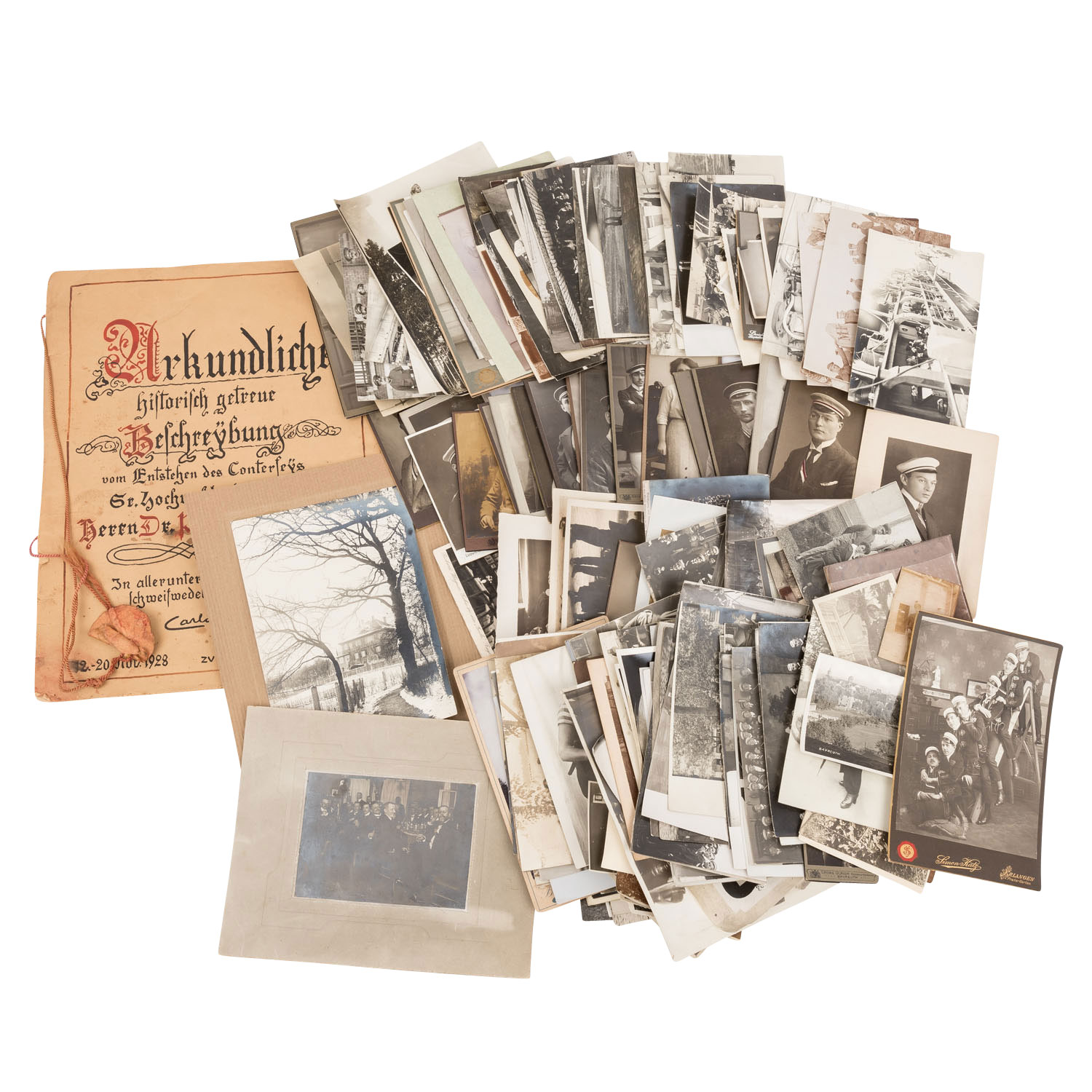 Photo estate from the environment, probably of the son of the former Bayreuth festival director Friedrich Wilhelm Schuler, the doctor DR. PAUL SCHULER. Around 1910. Various photos and photo cards in 2 shoe boxes, family photos, fellow students, scale length, photo card of the 'Richard Wagner corner' in the Eule inn in Bayreuth, Bayreuther Hofgarten, etc. In addition, opera glass, documentary description of the creation of the Conterfey of Dr. Paul Schuler, survivor's cross WW I, membership badge for NS war victims' welfare, mother's cross bronze-colored, calligraphed coat of arms behind glass of 'Schuler's friendship', large framed portrait photo of Paul Schuler, drawing with passe-partout of the Schuler estate with the Festspielhaus in the background by F. Stassen. Inspection recommended, condition varies, frame and drawing partially damaged.