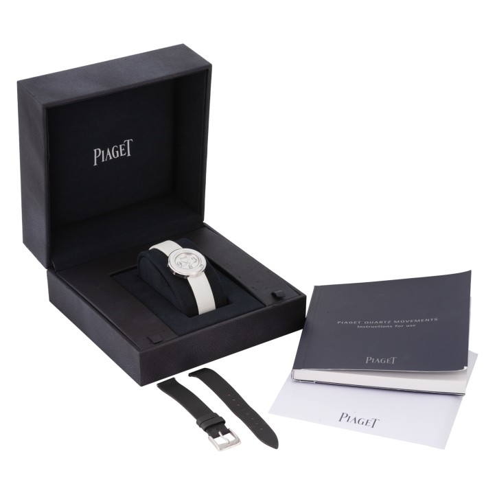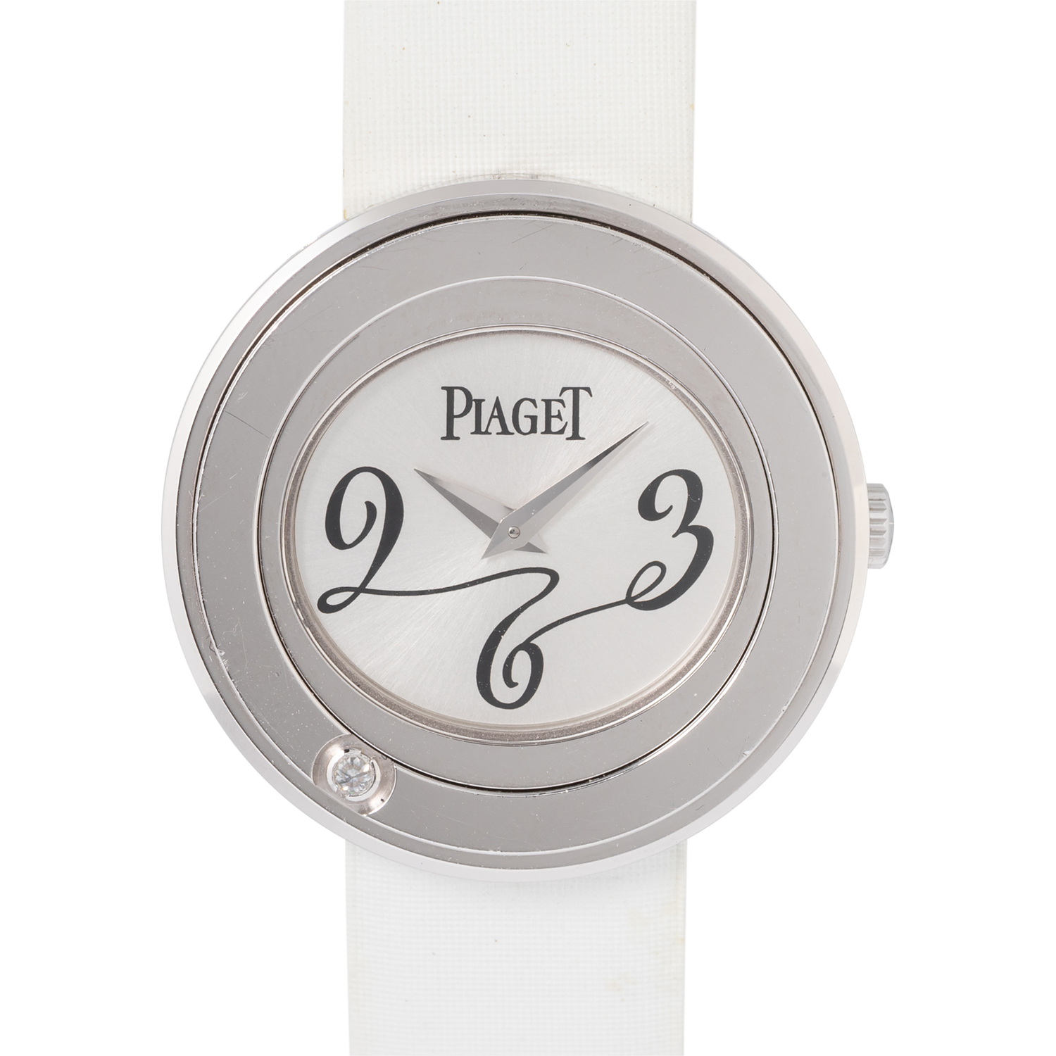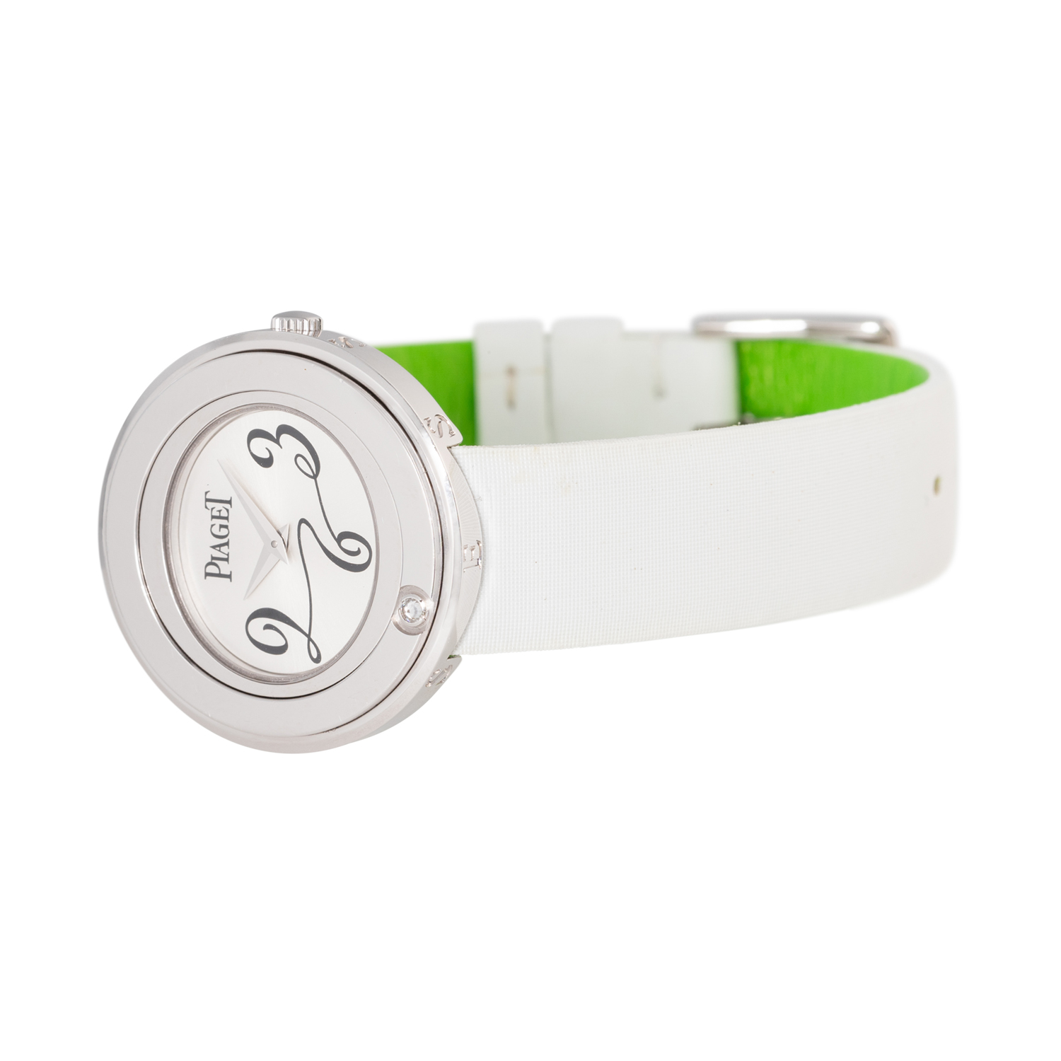 PIAGET Possession women's watch Ref. P10402. 18K white gold with 1 diamond in a rotatable bezel. Quartz movement with a fresh battery replacement. Silver dial with Arabic numerals 3, 6, and 9. Original Piaget textile strap in white with green lining, additional original Piaget textile strap in black with pink lining. Original Piaget stainless steel pin buckle. Good condition, signs of wear on the case. Original box and manual as well as dealer directory included. Diameter approx. 29 mm, measured without crown.
