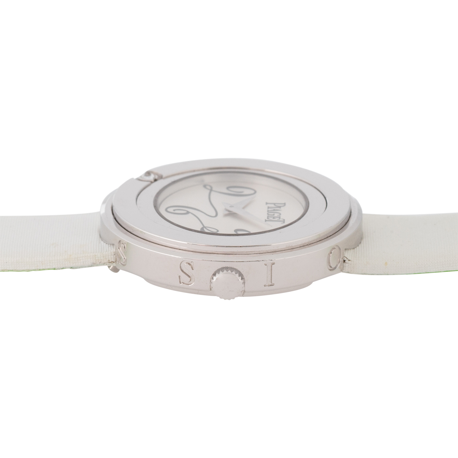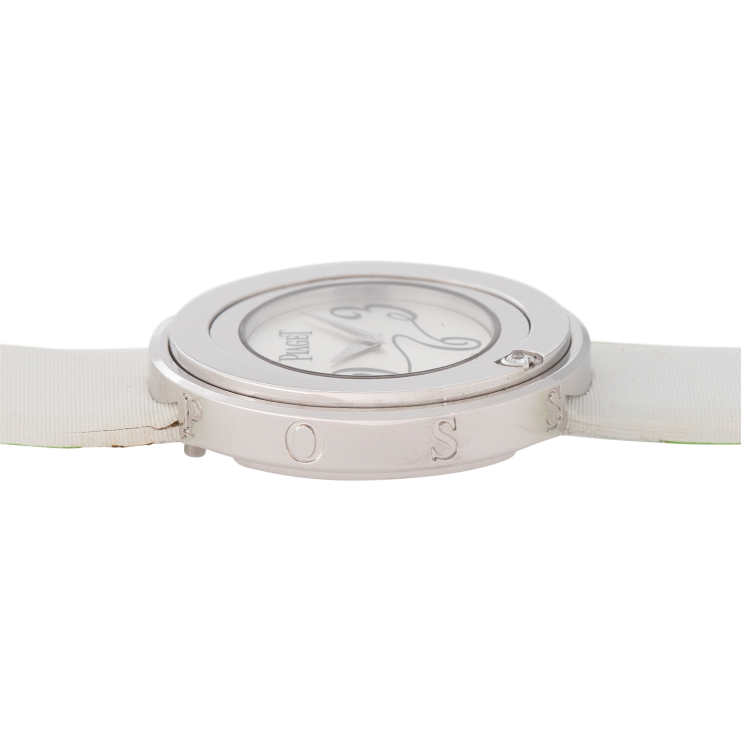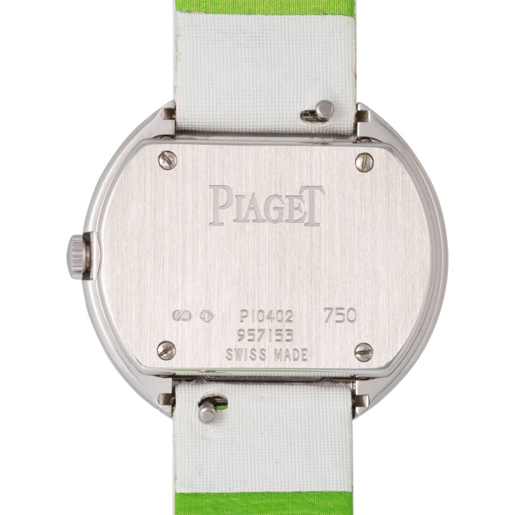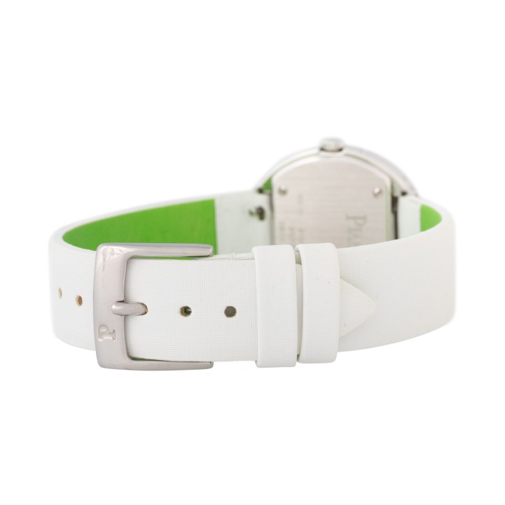 PIAGET Possession women's watch Ref. P10402. 18K white gold with 1 diamond in a rotatable bezel. Quartz movement with a fresh battery replacement. Silver dial with Arabic numerals 3, 6, and 9. Original Piaget textile strap in white with green lining, additional original Piaget textile strap in black with pink lining. Original Piaget stainless steel pin buckle. Good condition, signs of wear on the case. Original box and manual as well as dealer directory included. Diameter approx. 29 mm, measured without crown.