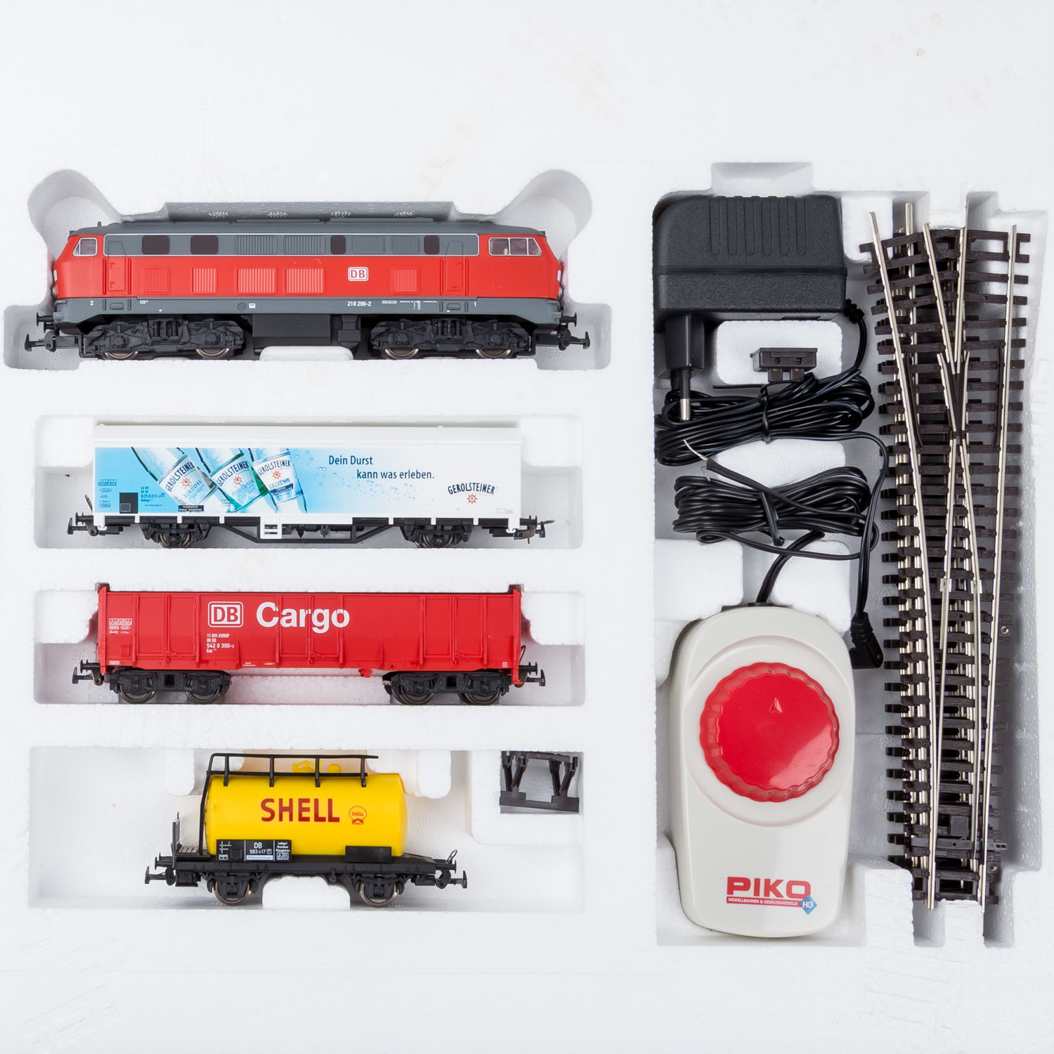 PIKO/ROCO 2 starter sets and 2 locomotives, gauge H0, PIKO: 2 x diesel sets, each with 1 red diesel locomotive, 3 freight cars, 1 controller with power supply, small buffer stop, 3 turnouts, 20 curved track sections, and 10 straight track sections, each complete in the original box, unused, function not tested, box with storage marks; ROCO red diesel locomotive 63423 and blue diesel locomotive 63422, both in the original box, function not tested, each unused, some with storage marks.