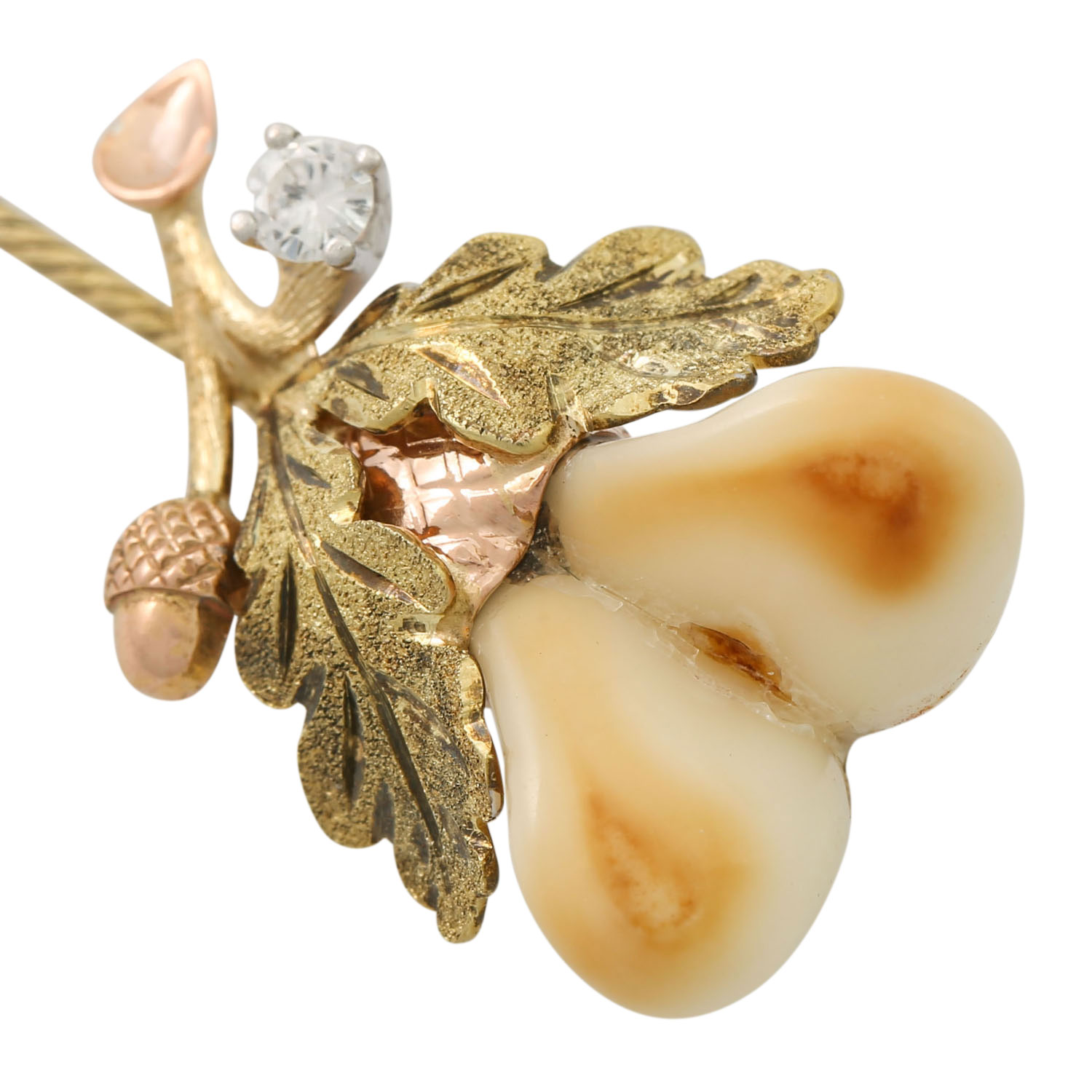 Stick pin set with brilliant-cut diamond approx. 0,08 ct, good colour and clarity, and deer teeth, 14K YG/RG, 4,2 g, L.: approx. 6 cm, 20th/21st c., very good condition, handcraft.
