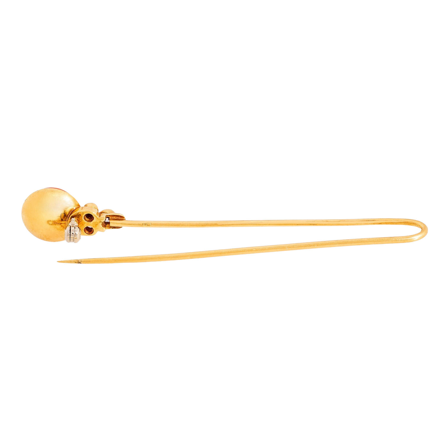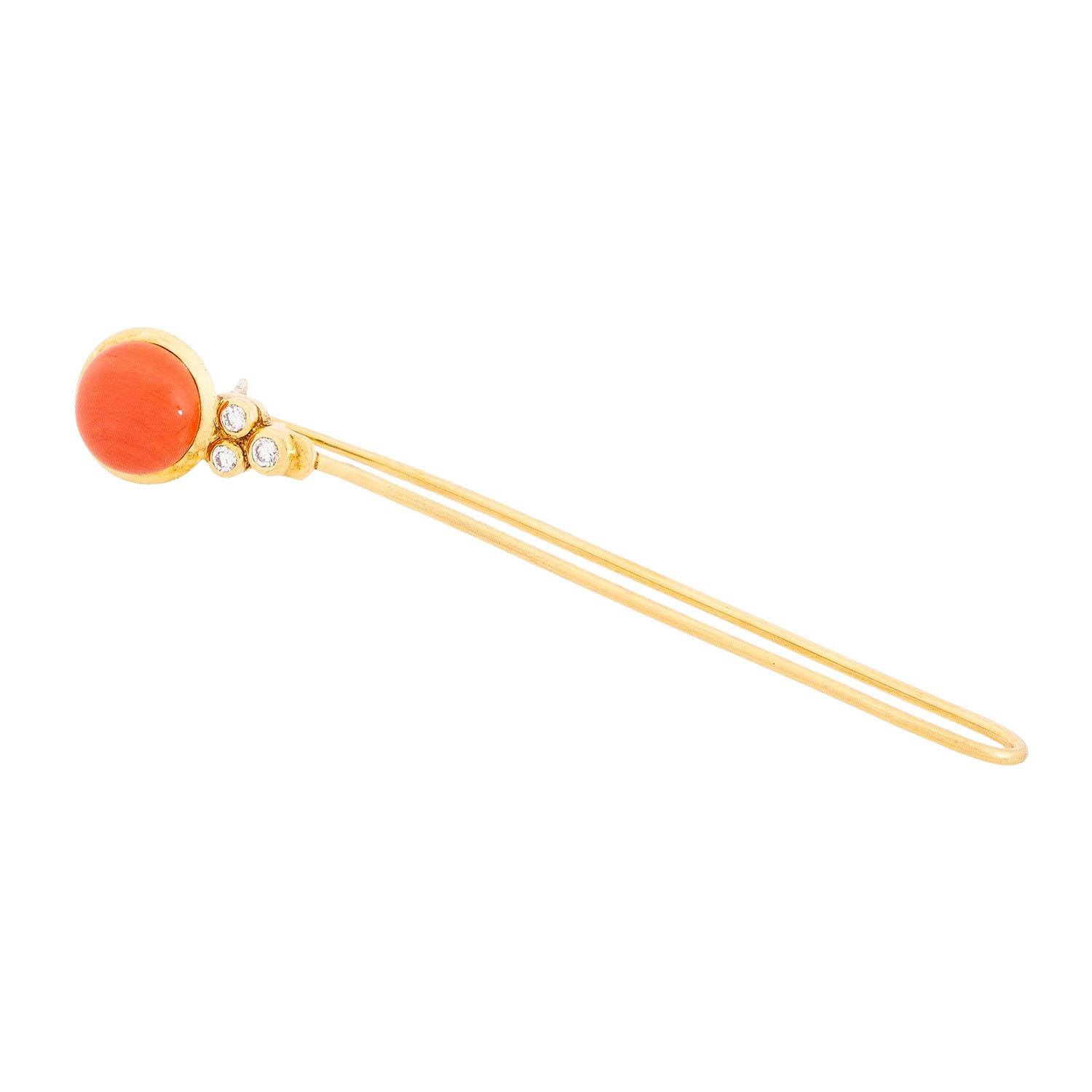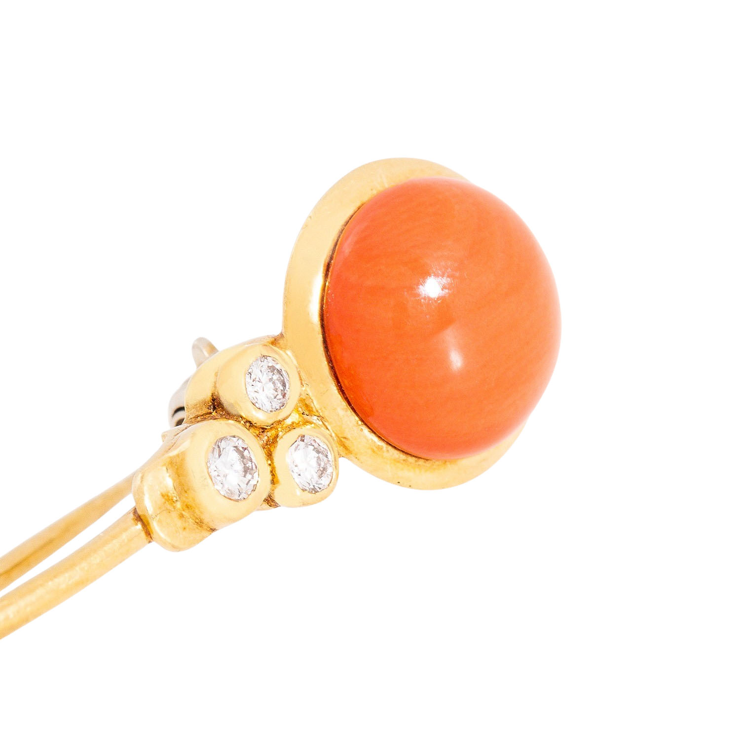 Brooch with coral cabochon, round, 10 mm, 3 brilliant cut diamonds, totalling ap. 0.12 ct, WHITE (H)/VS, 14K yellow and white gold, 6.6 g, L x W: 79 x 12 mm, late 20th century, minimal signs of wear. Note: Corallium species are subject to the species protection agreement in accordance with Regulation (EC) 3407/2009 Annex III. Re-export from the EU requires an export certificate from the Federal Agency for Nature Conservation (BfN).