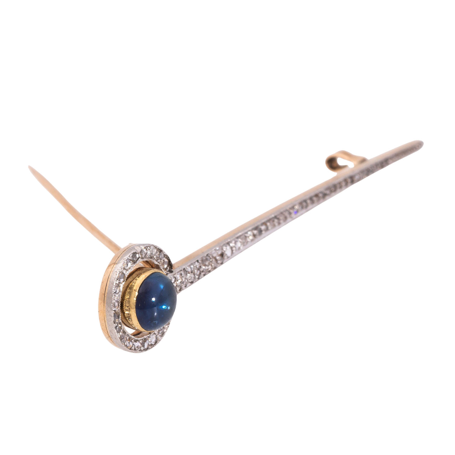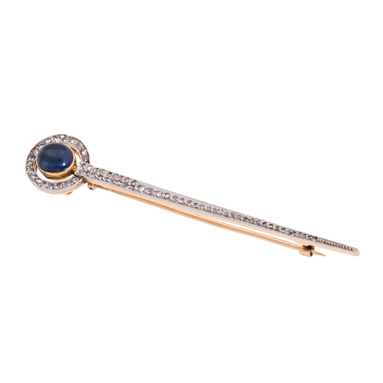 Brooch with cabochon-cut sapphire and rose-cut diamonds totalling ca. 0.5 ct, 14K yellow gold, face side platinum, 7 g, L: 7 cm, 1st half of 20th century, signs of wear, slightly bent.