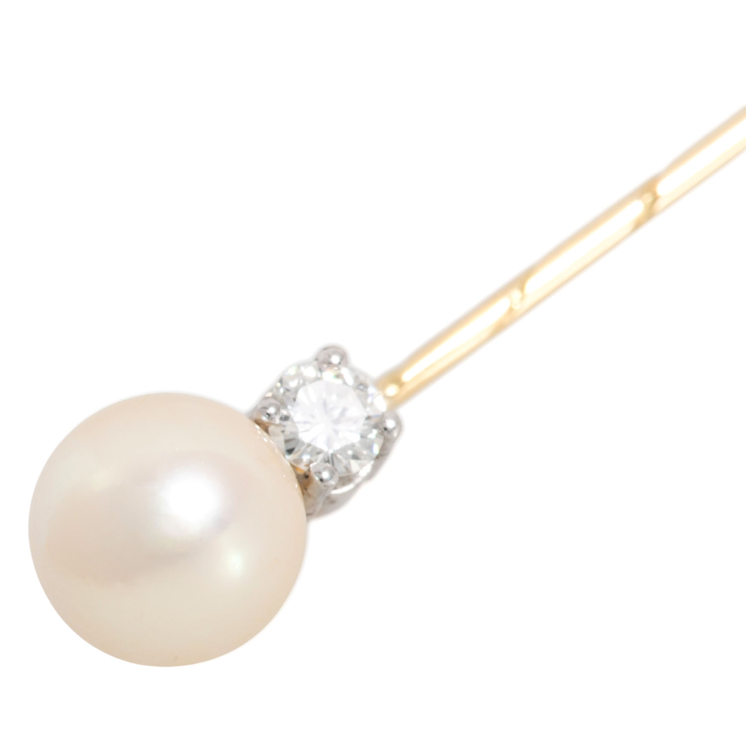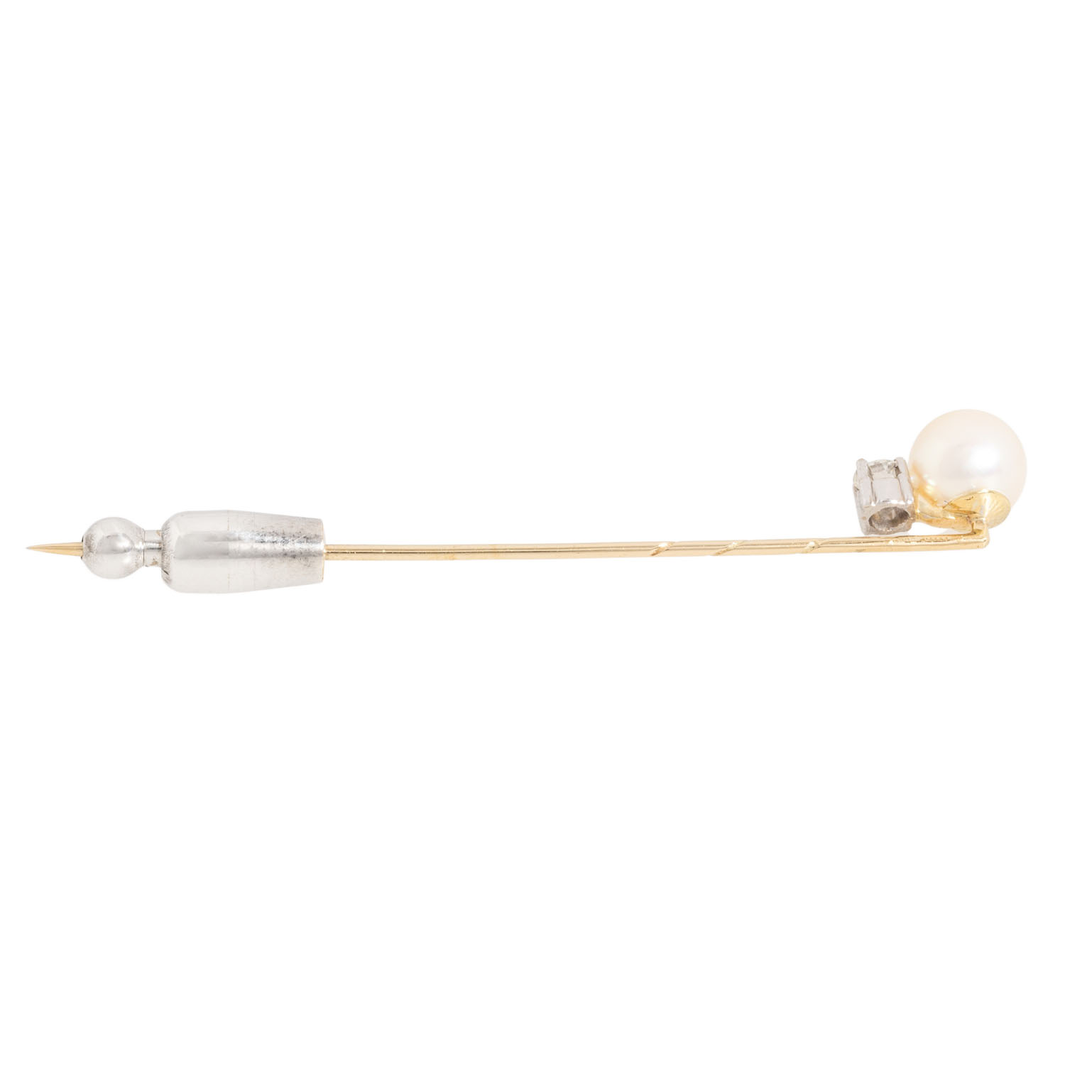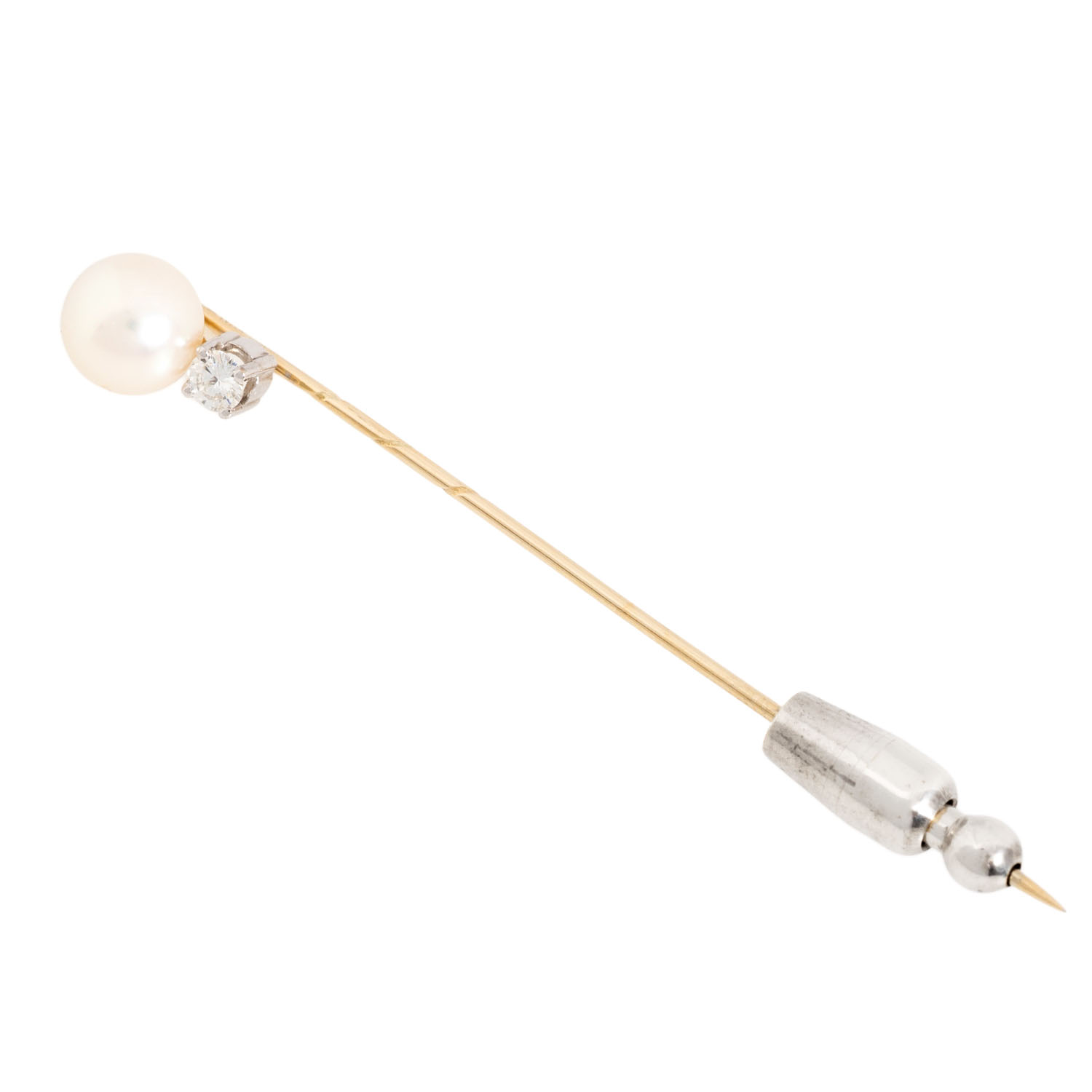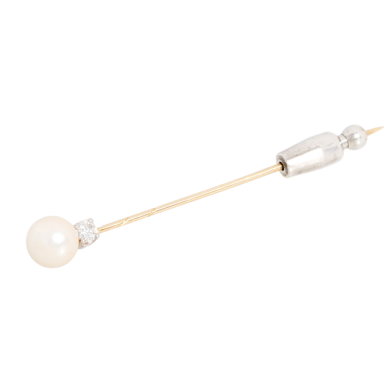 Needle with white cultured Akoya pearl, D: 7.6 mm, good lustre, 1 brilliant-cut diamond, 0.13 ct, WHITE (H)/VS, GG/WG 14K, silver pin holder, 2.8 g, L: 63 mm, mid 20th century, minor signs of wear.