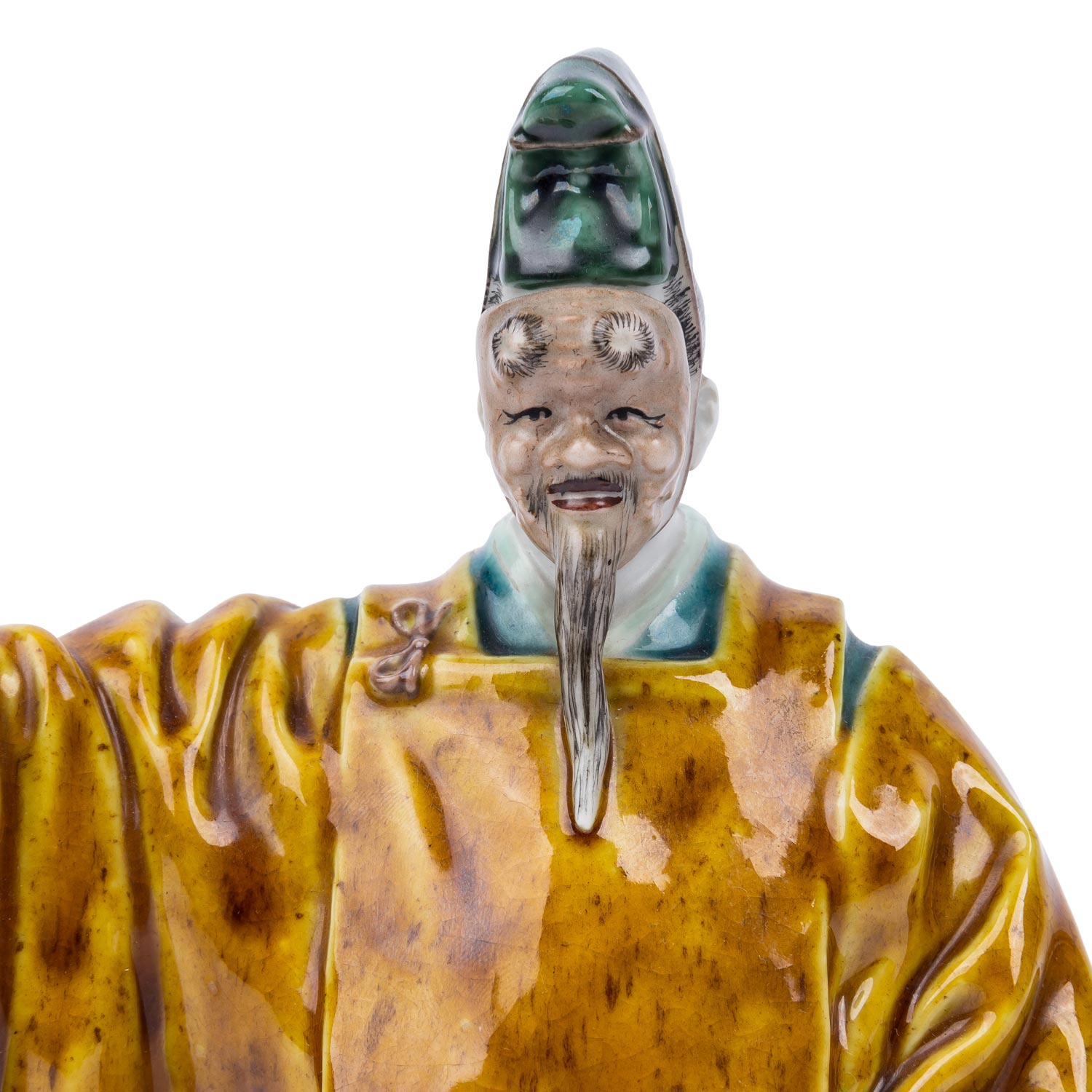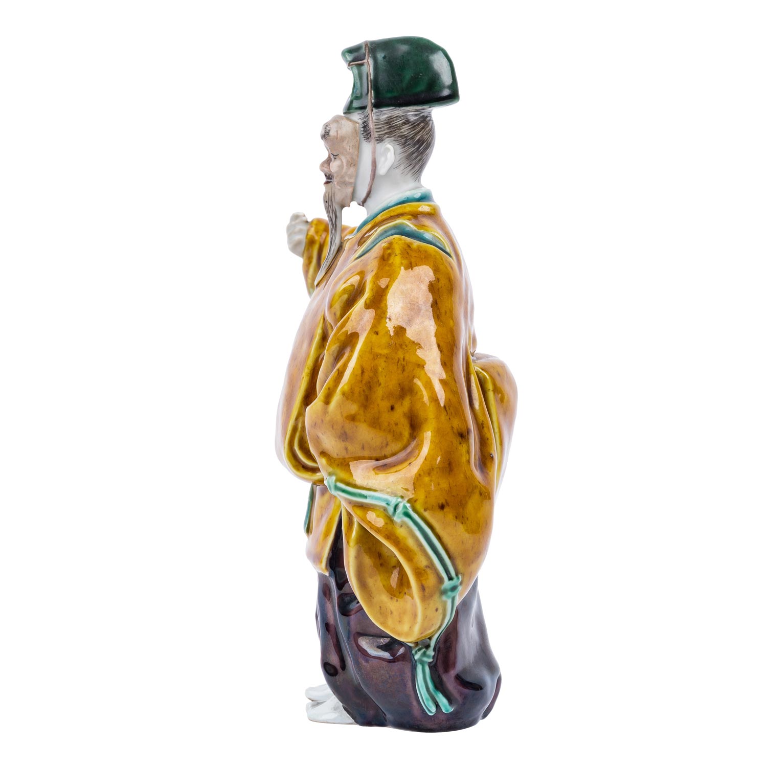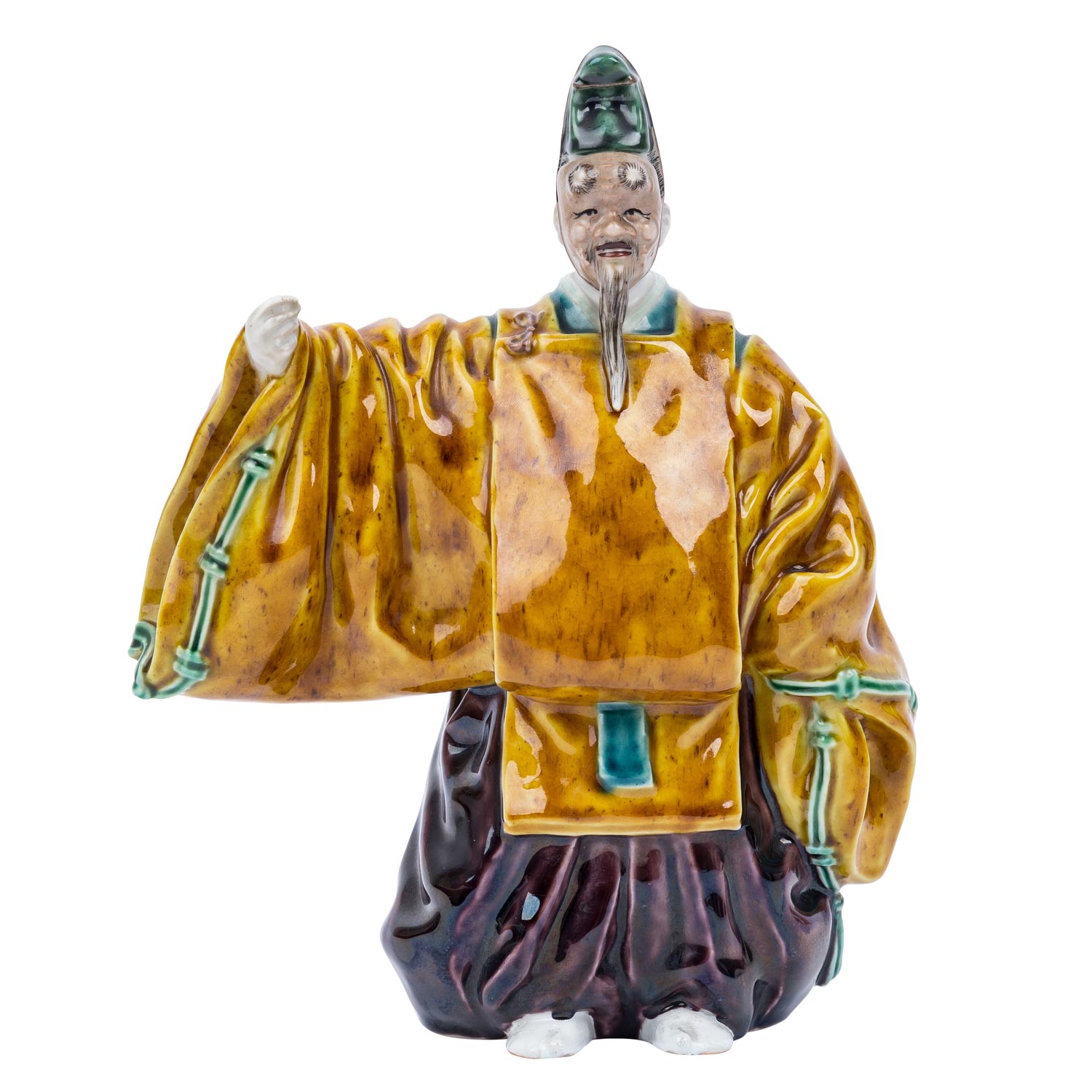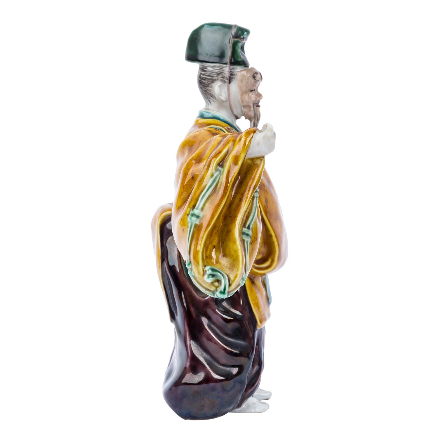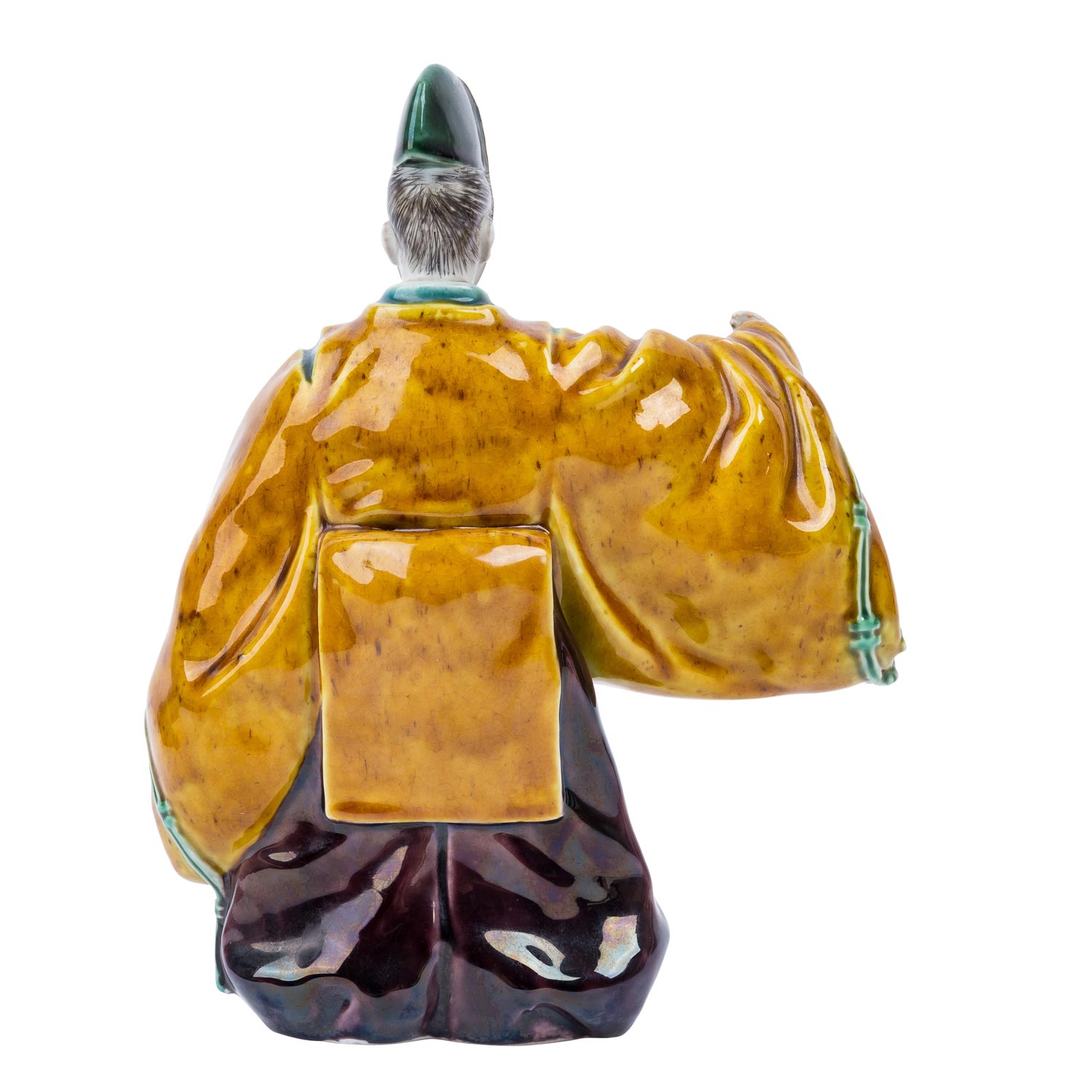 Porcelain actor. KUTANI/JAPAN, 19th century. Rare depiction of an actor in court costume. Glazed in the colours green, aubergine and honey, h: 20.5 cm/w: 17 cm. Presumably missing an attribute in the right hand, signs of age.