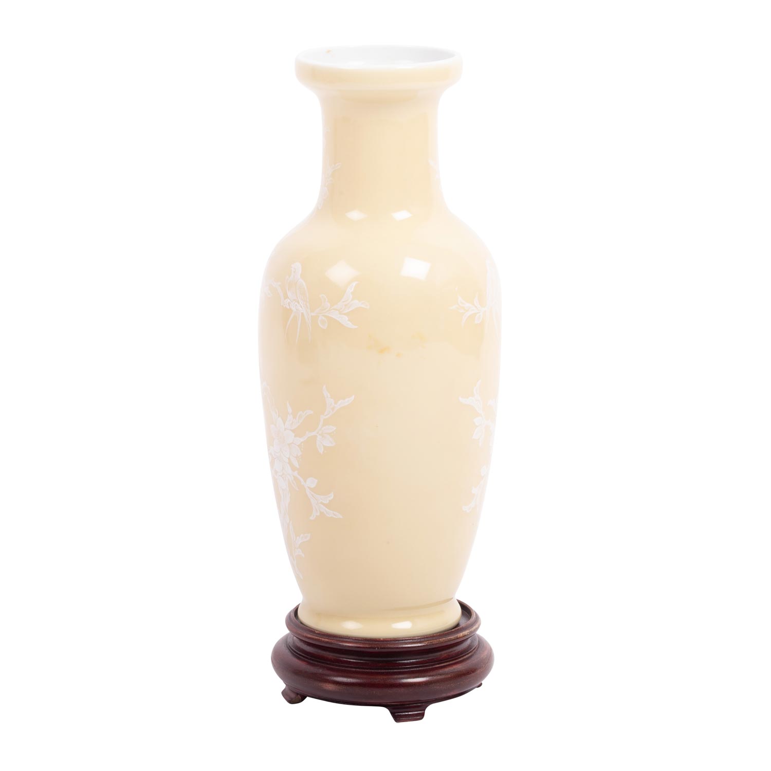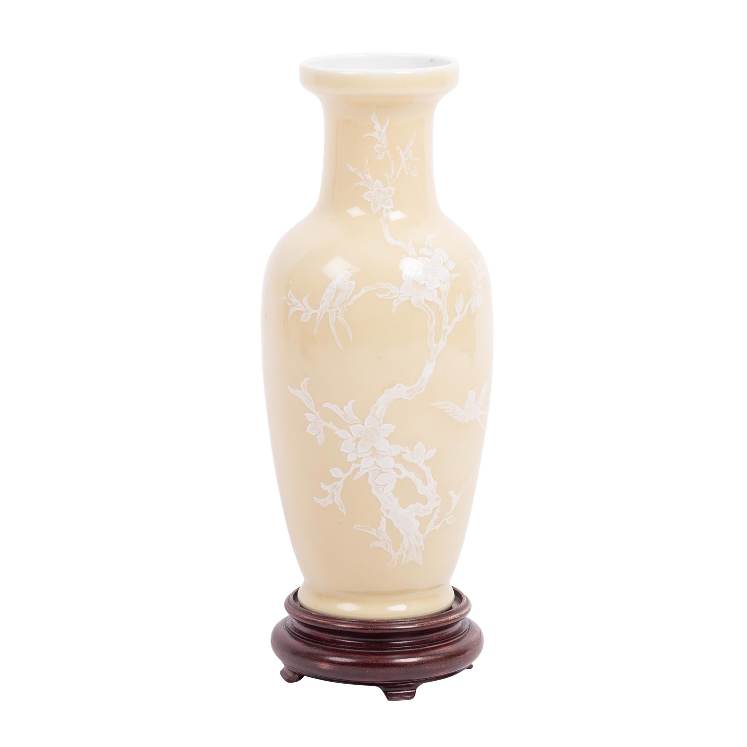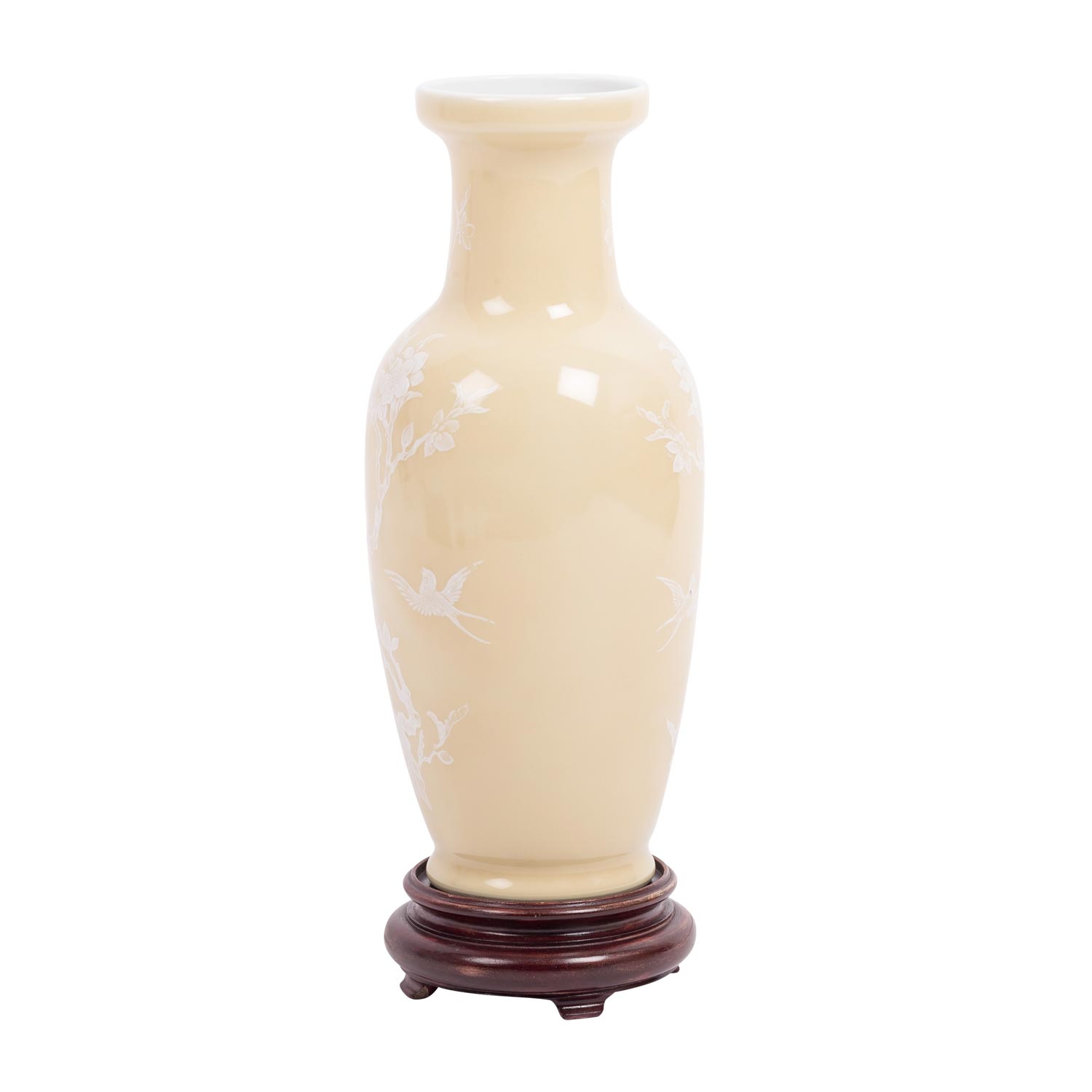 Porcelain vase. JAPAN, Meiji period (1868-1912). glazed beige outside and decorated with white enamel painting of a gnarled branch with swallows set in between, underside underglazed blue four-character mark, h: 26 cm. with matching wooden base.