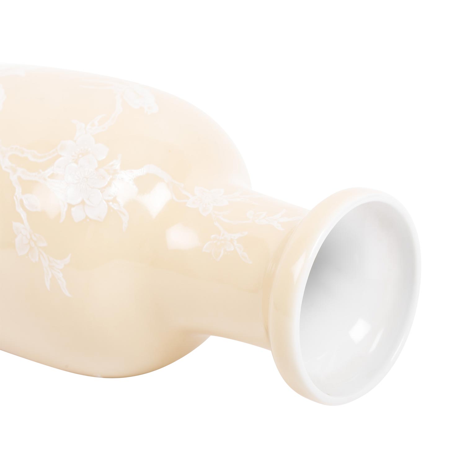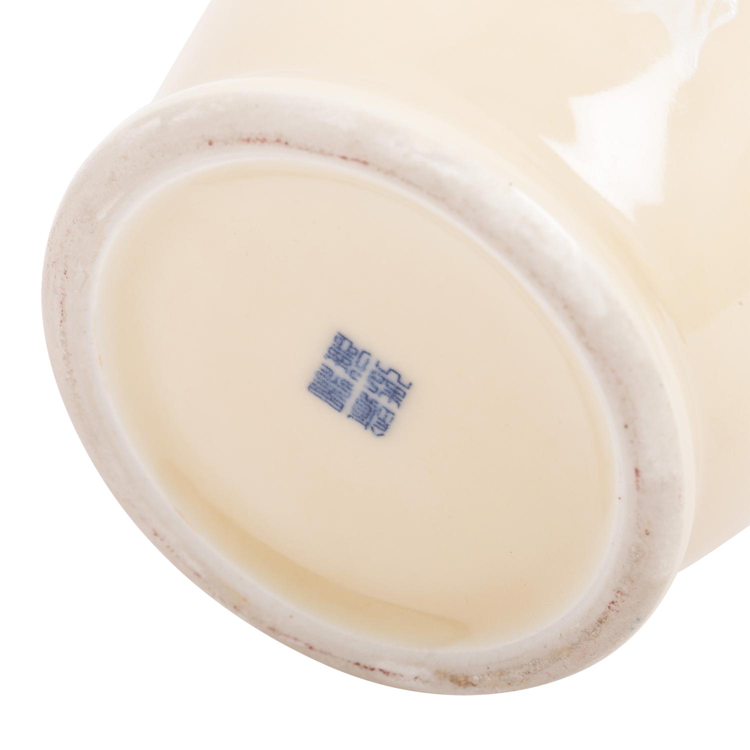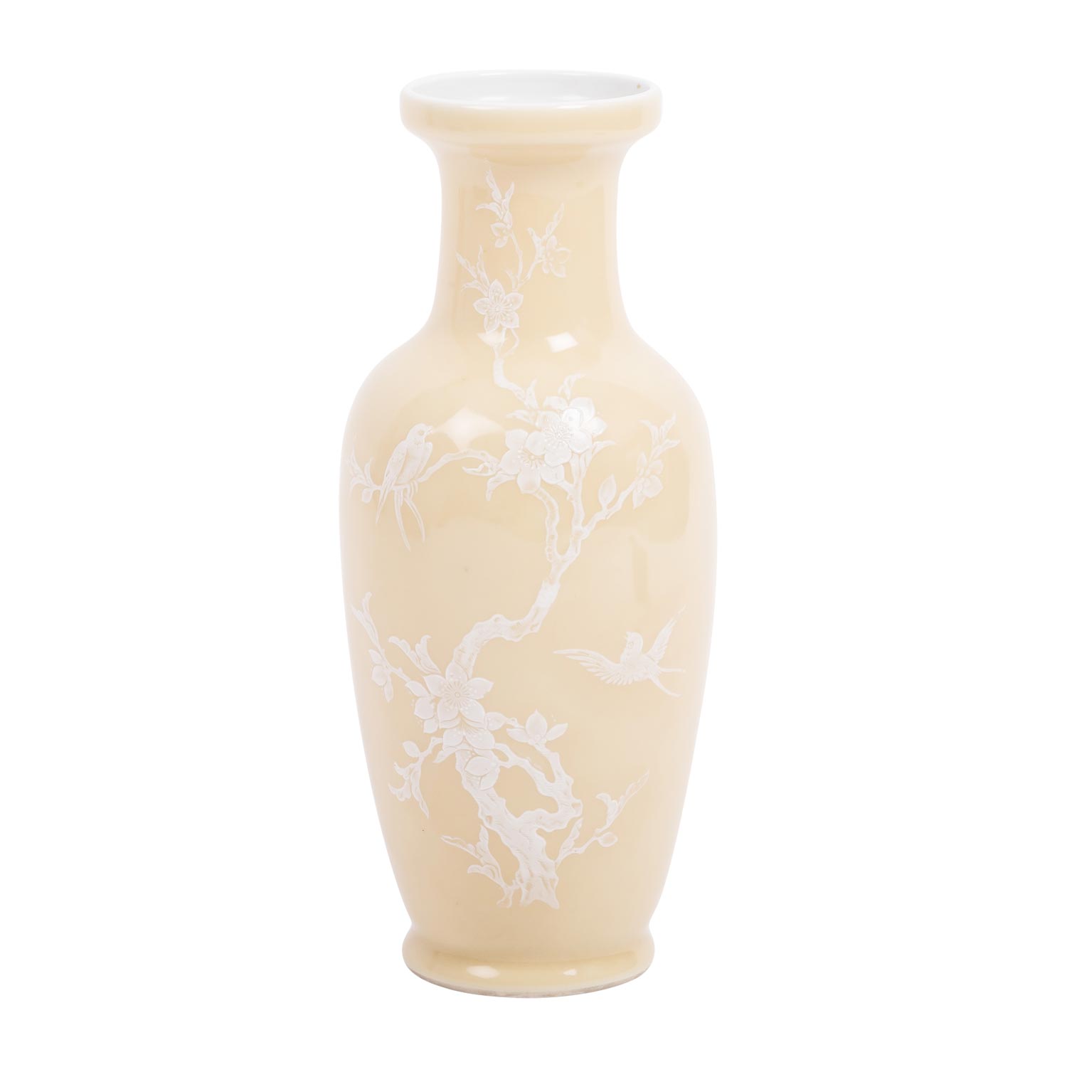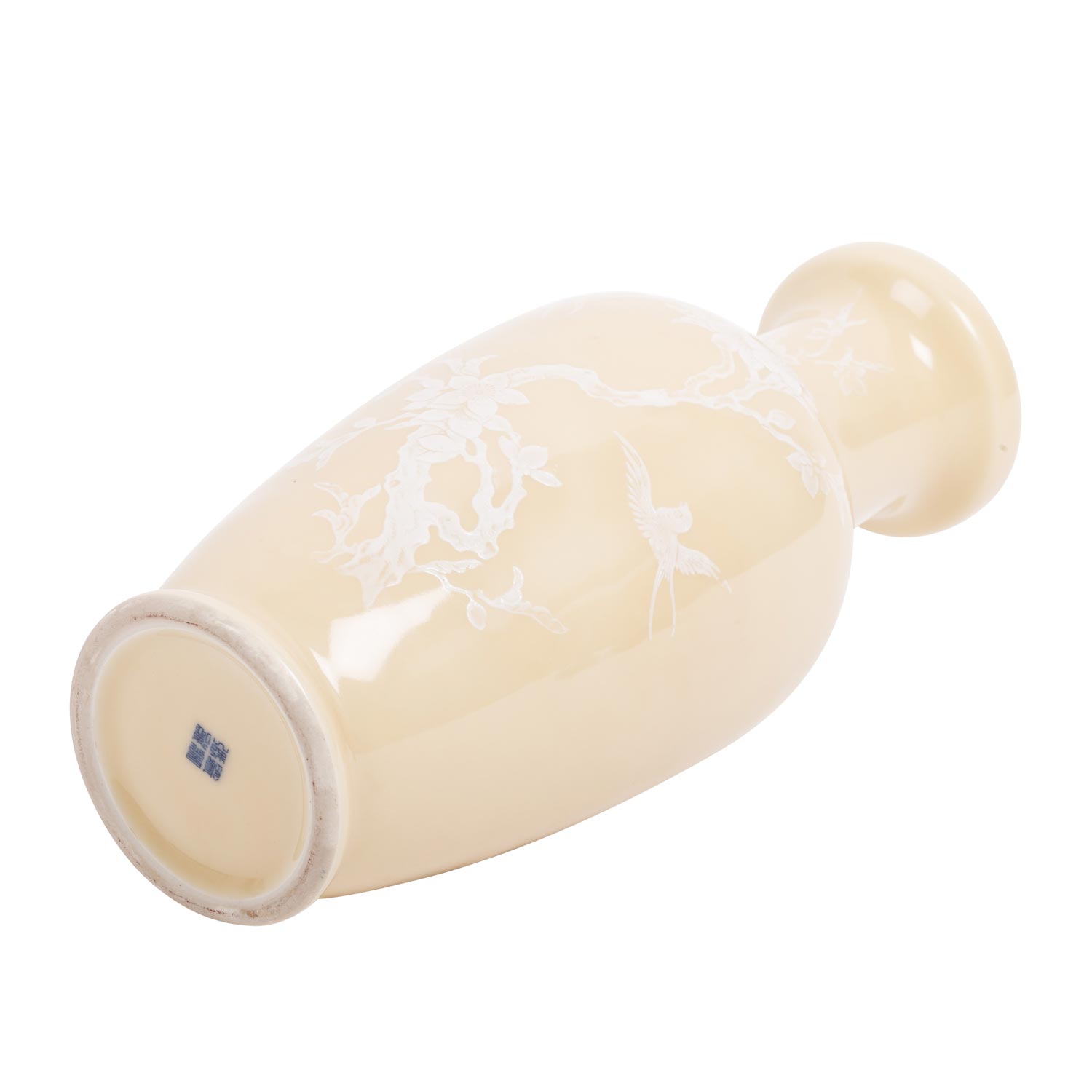 Porcelain vase. JAPAN, Meiji period (1868-1912). glazed beige outside and decorated with white enamel painting of a gnarled branch with swallows set in between, underside underglazed blue four-character mark, h: 26 cm. with matching wooden base.