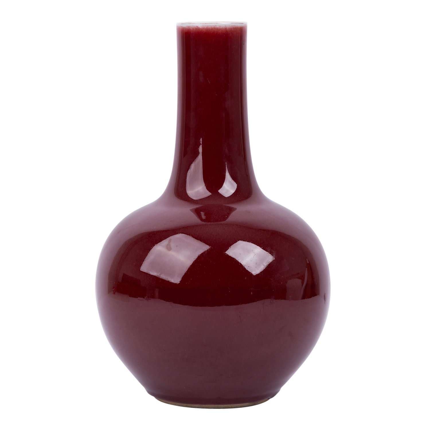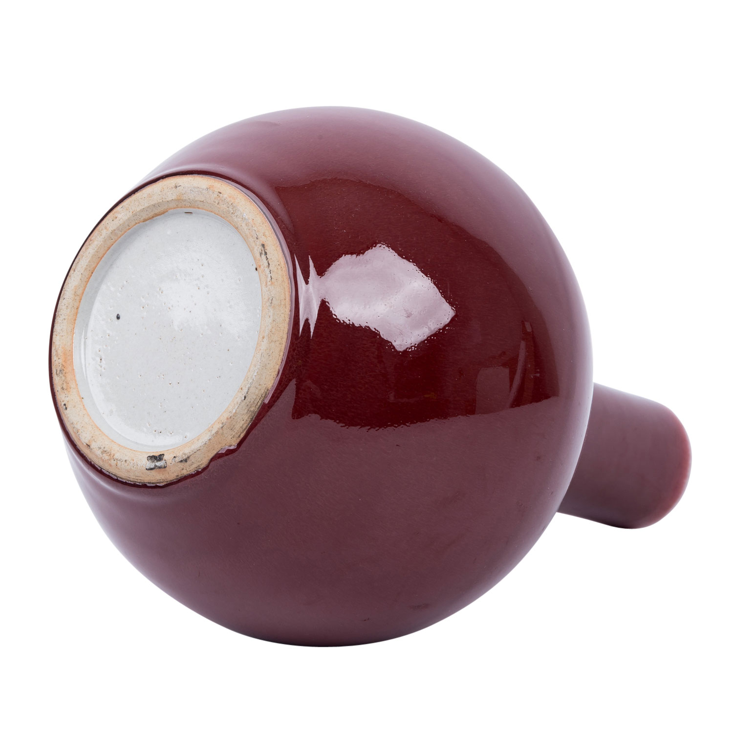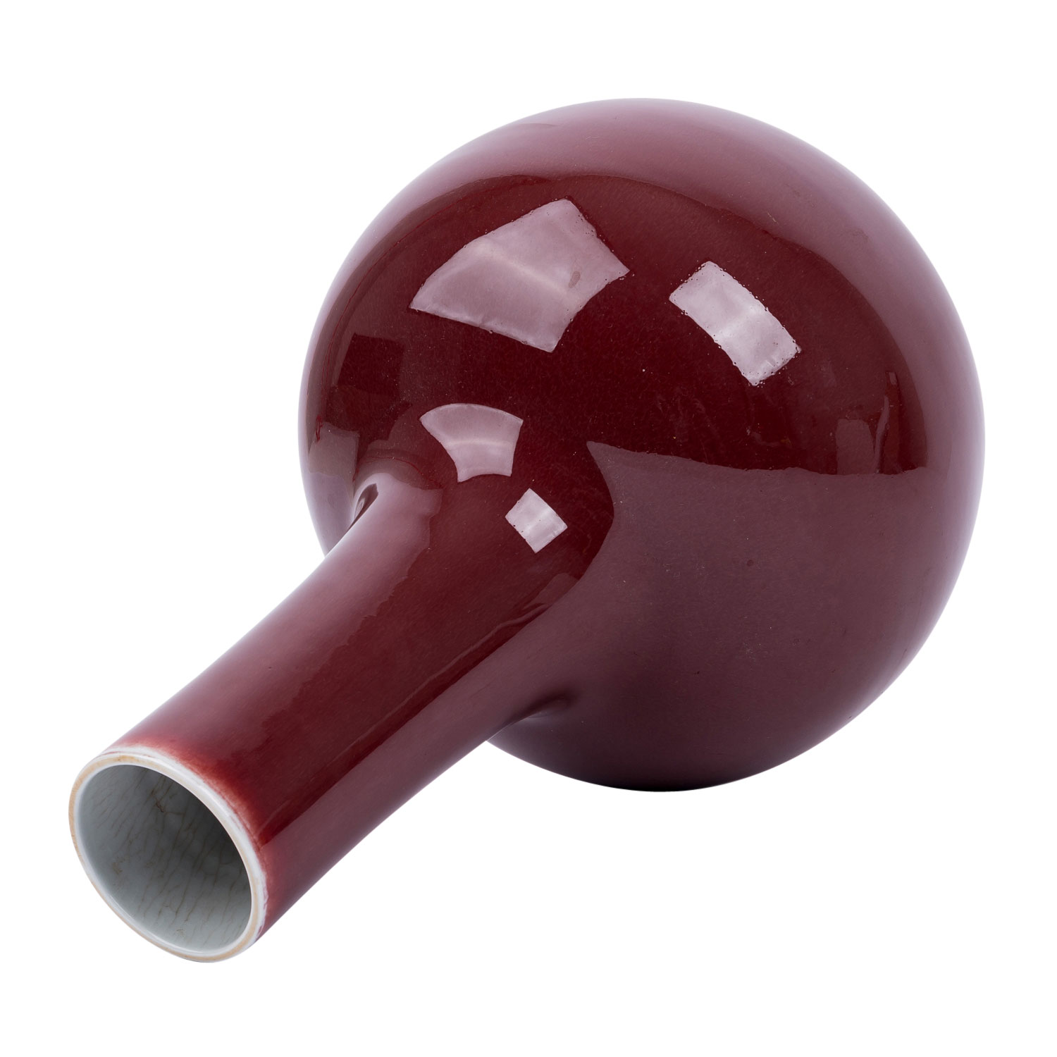Porcelain vase with oxblood glaze. CHINA, probably 19th c. Spherical body with long neck. The glaze flows gradually into white at the rim. Glaze cracks inside, h: 34.5 cm.