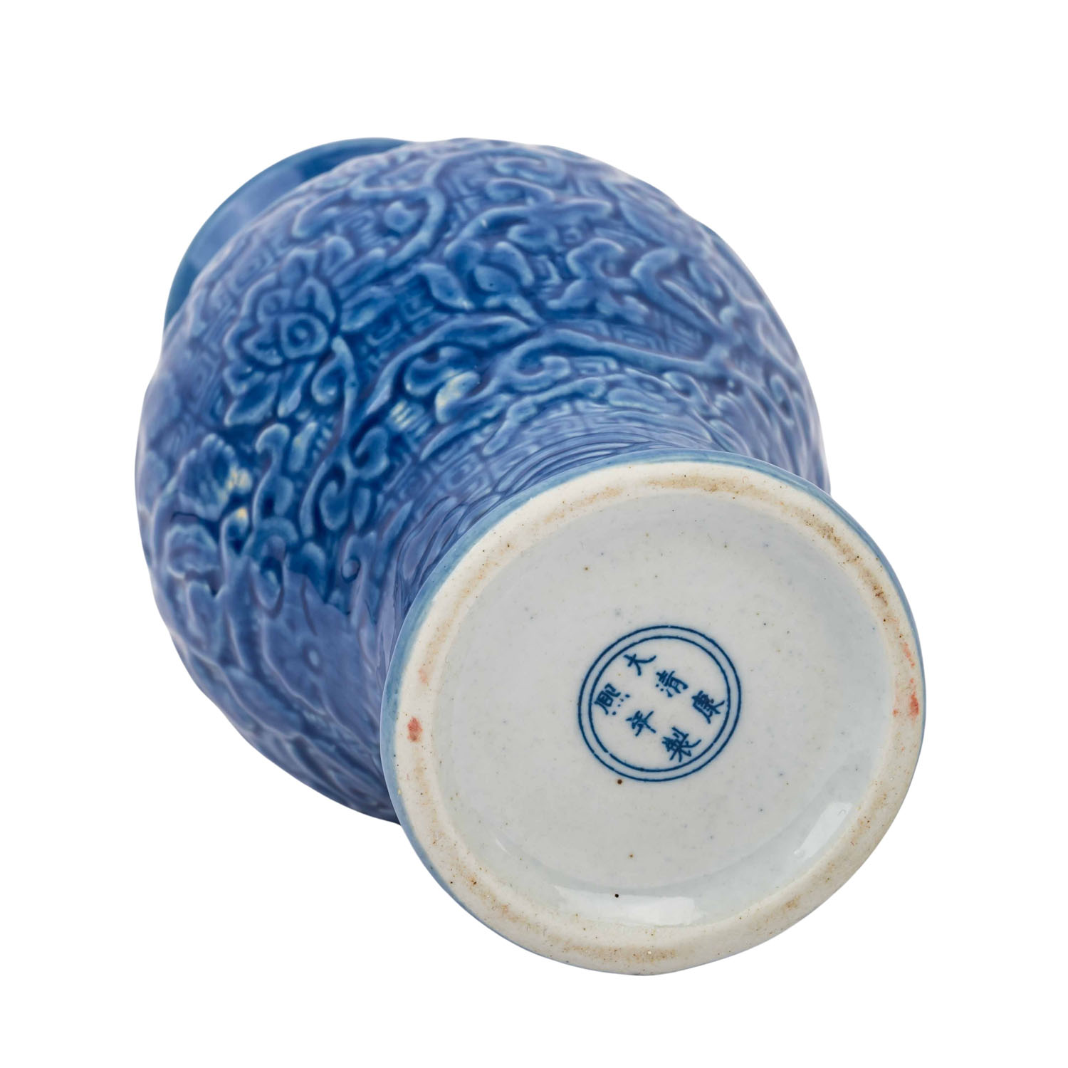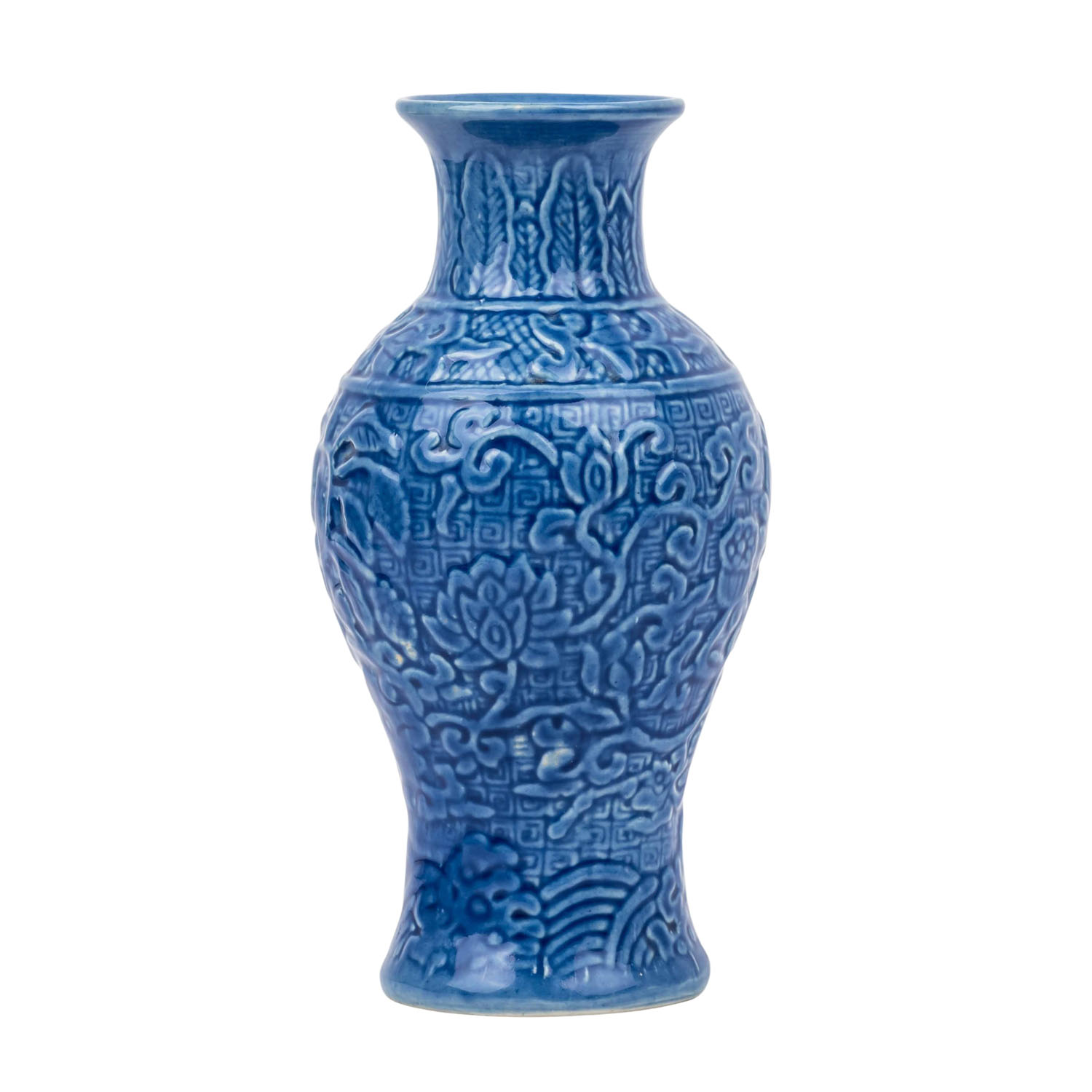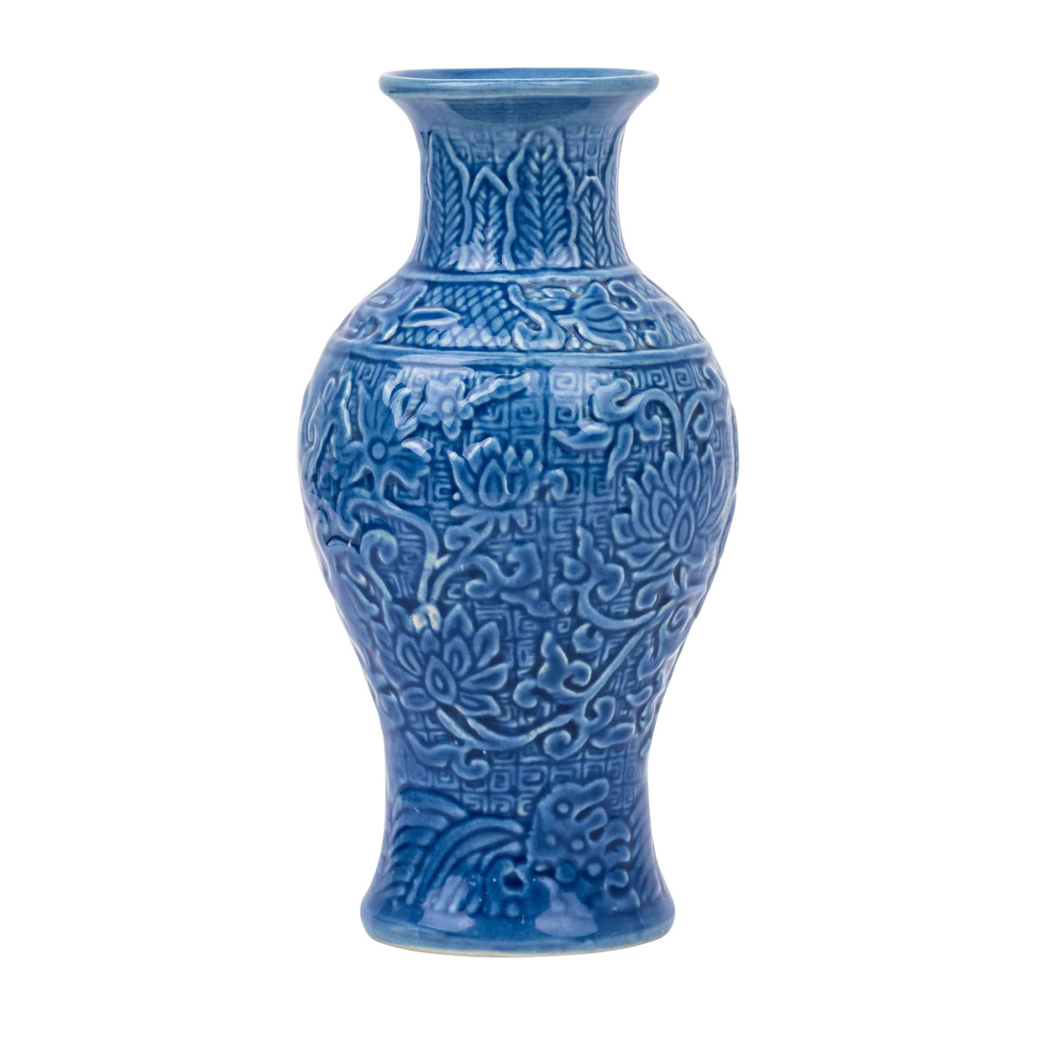 Powder blue glazed vase made of porcelain. CHINA, 20th century, relief decoration of foliage with crysanthemums. Apocryphal six-character Kangxi mark on the underside, h: 19 cm. Some irregularities in the glaze.