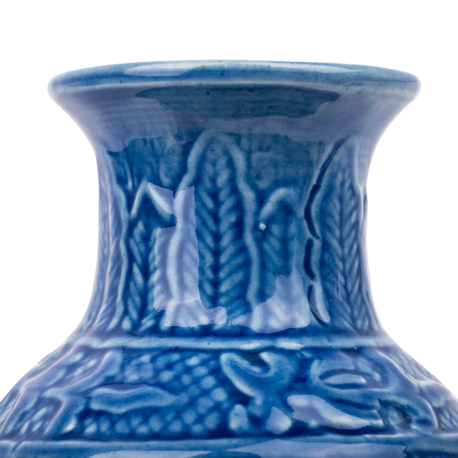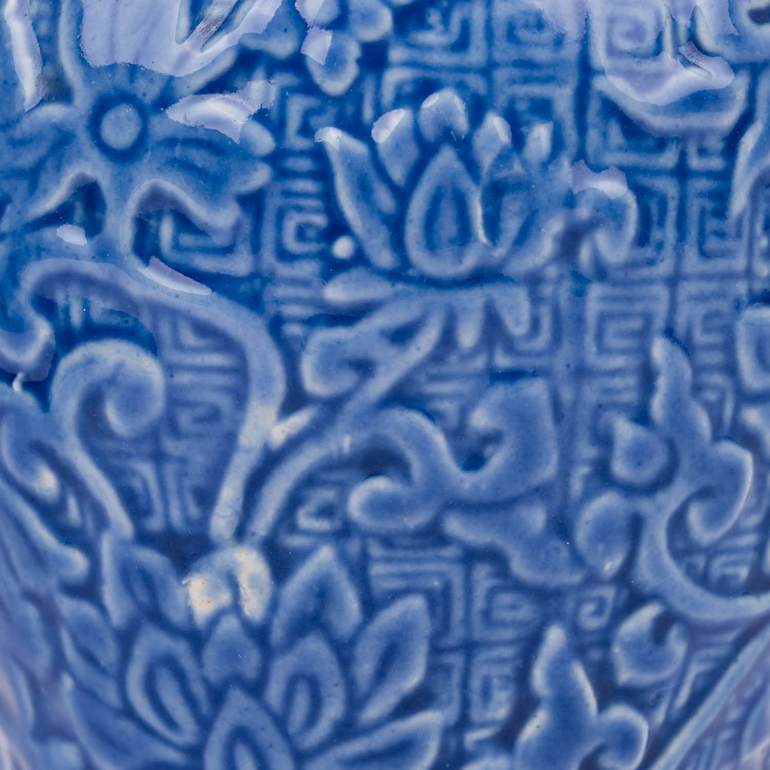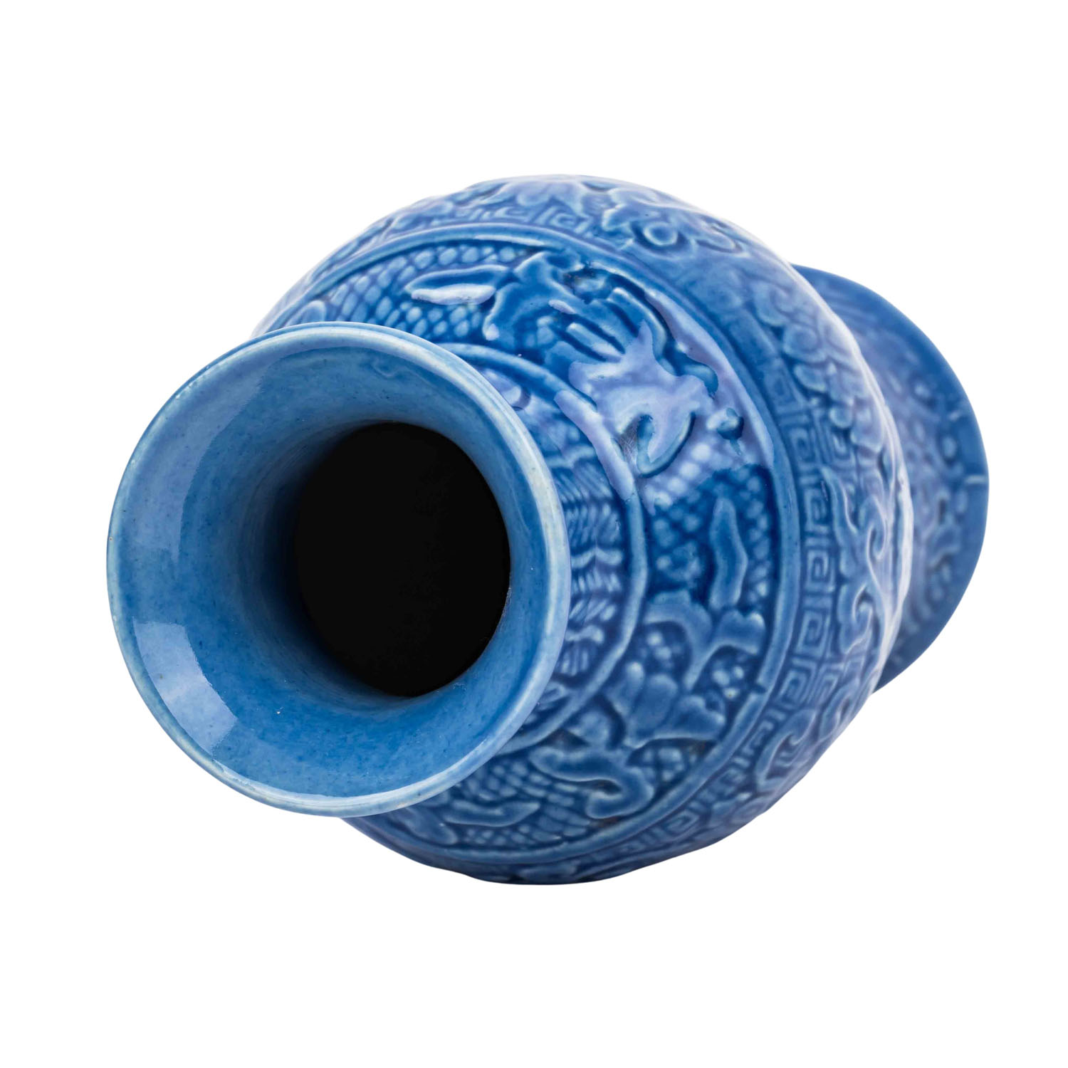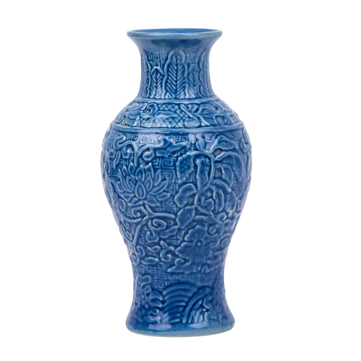 Powder blue glazed vase made of porcelain. CHINA, 20th century, relief decoration of foliage with crysanthemums. Apocryphal six-character Kangxi mark on the underside, h: 19 cm. Some irregularities in the glaze.