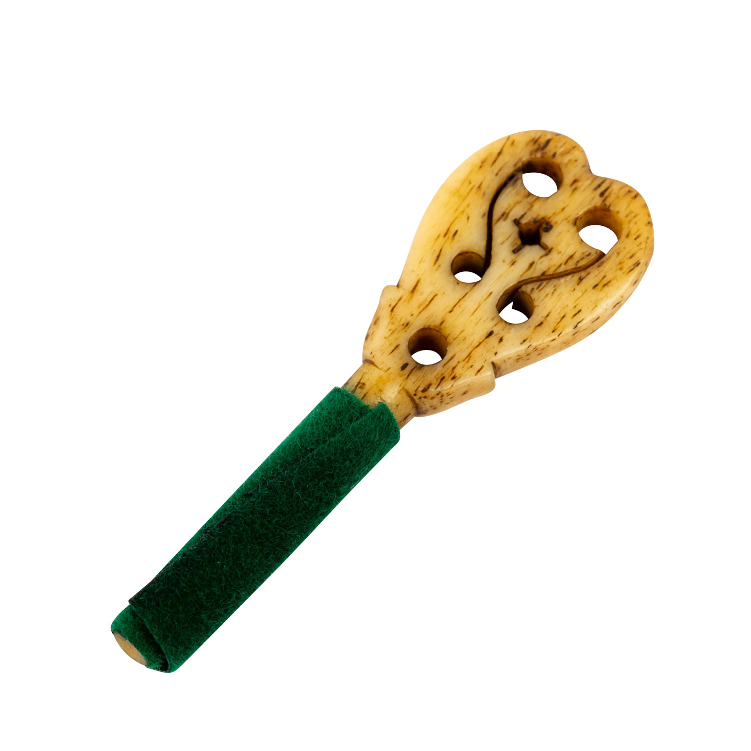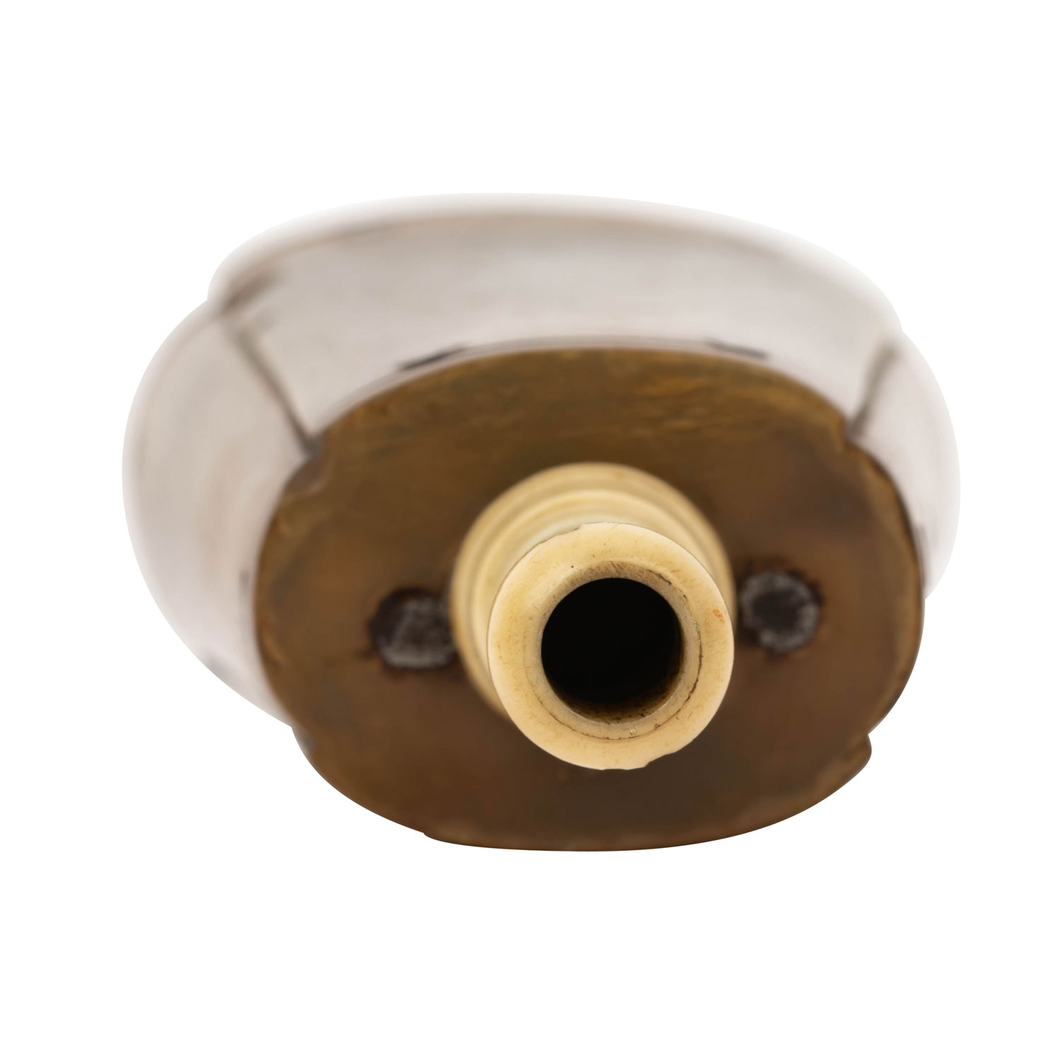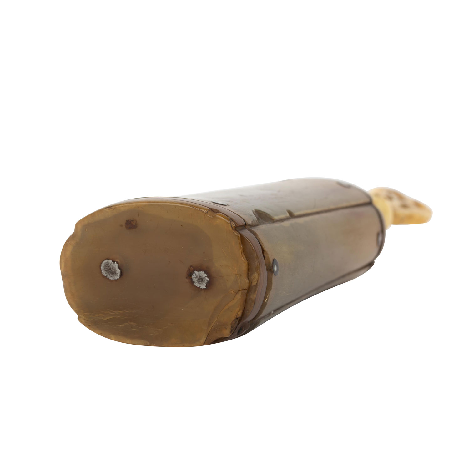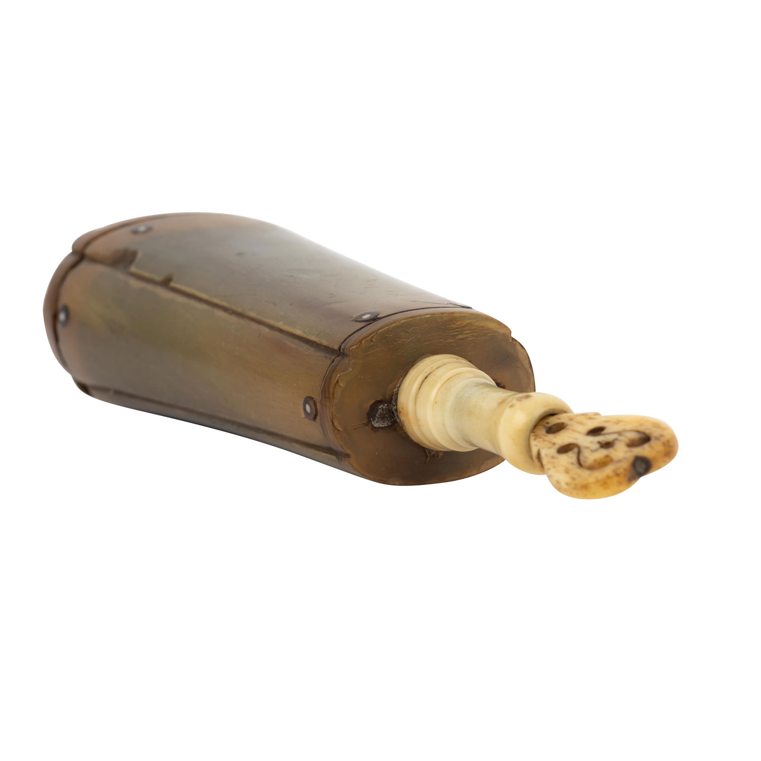 Powder flask, German, 17th/18th century, trapezoidal body made of concave curved horn plates riveted together with horn and metal nails. Leg shaft and stopper, openwork stopper, almost heart-shaped. The obverse is characterised by fine engraving, which includes trophy bundles from various weapons, as well as flags and figurative representations. Total length: approx. 16 cm. Signs of age and rubbing, chipping in places. PROVENANCE: South German private collection.