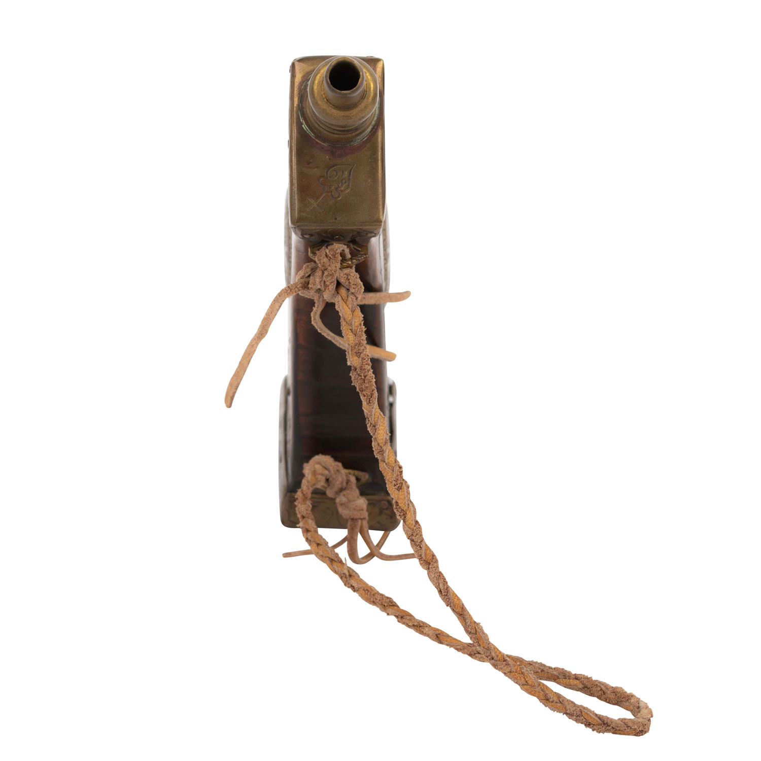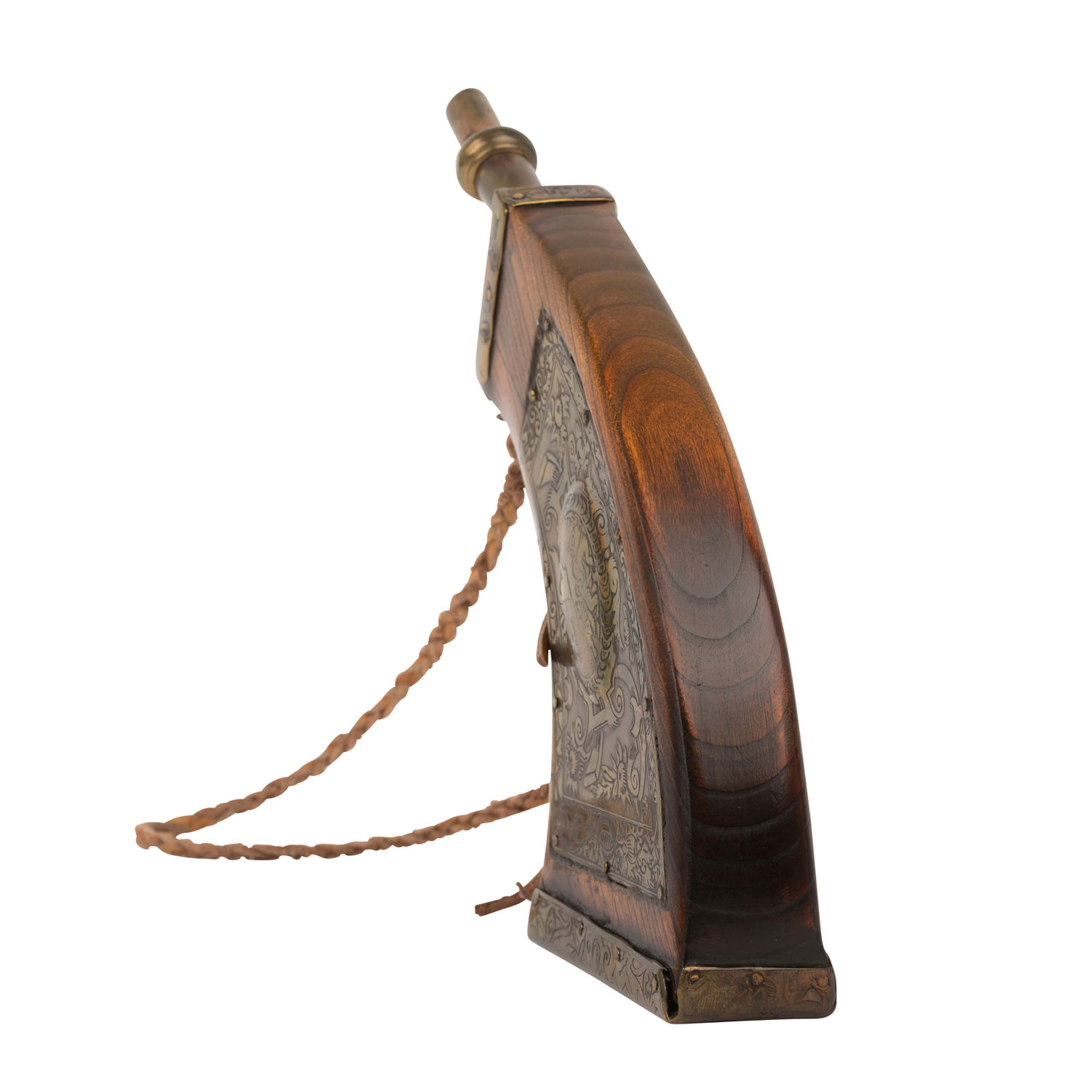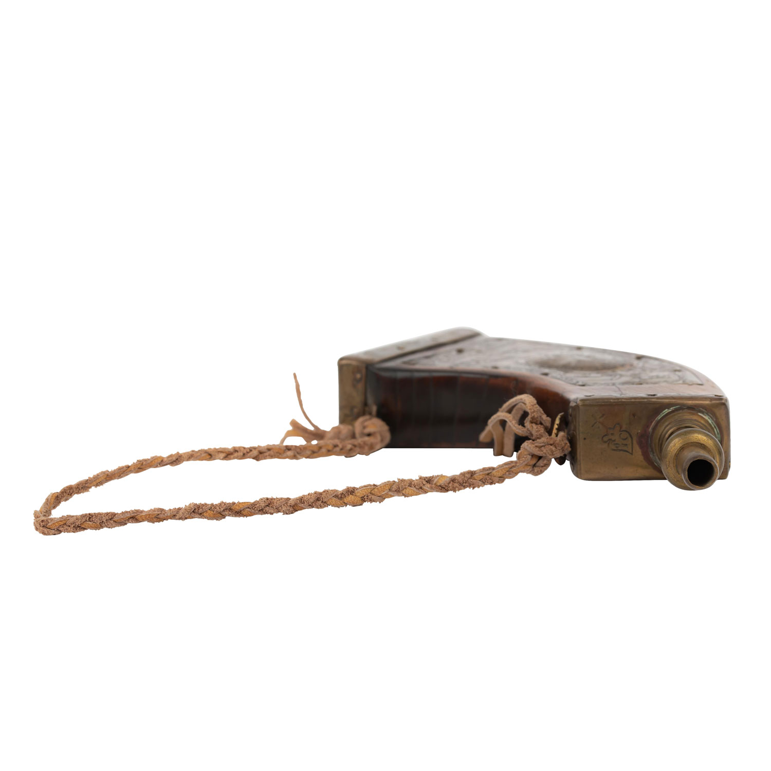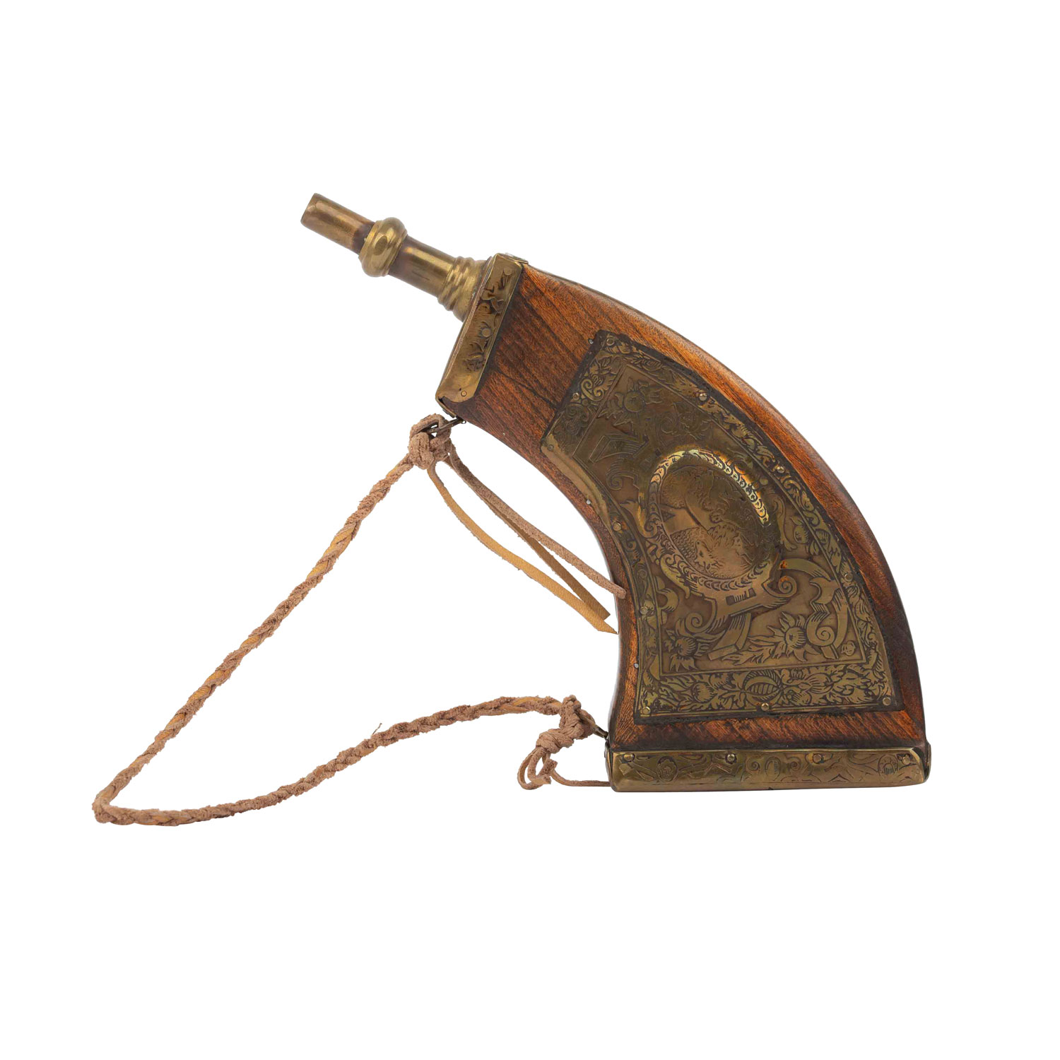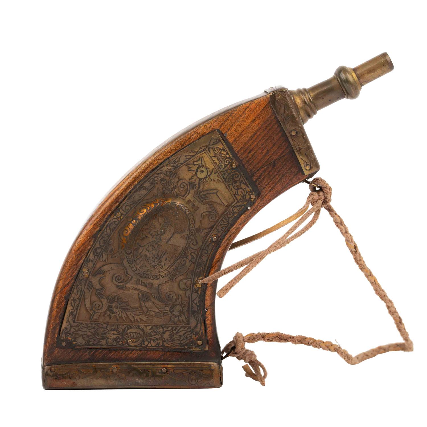 Powder horn, Italy, 20th century, in the style of the 17th century. Curved wooden body with two decoratively etched and engraved brass plates on the front and back. Both show the twins Romulus and Remus being suckled by the she-wolf in a central medallion. The scene is surrounded by vegetal elements and scrollwork. Brass fittings, also decorated en suite with figurative and floral motifs. Brass eyelets attached to the sides with a braided leather strap. Total length: approx. 23.5 cm. Signs of age and rubbing, heavy wear in places, feather missing from the chute. PROVENANCE: South German private collection.