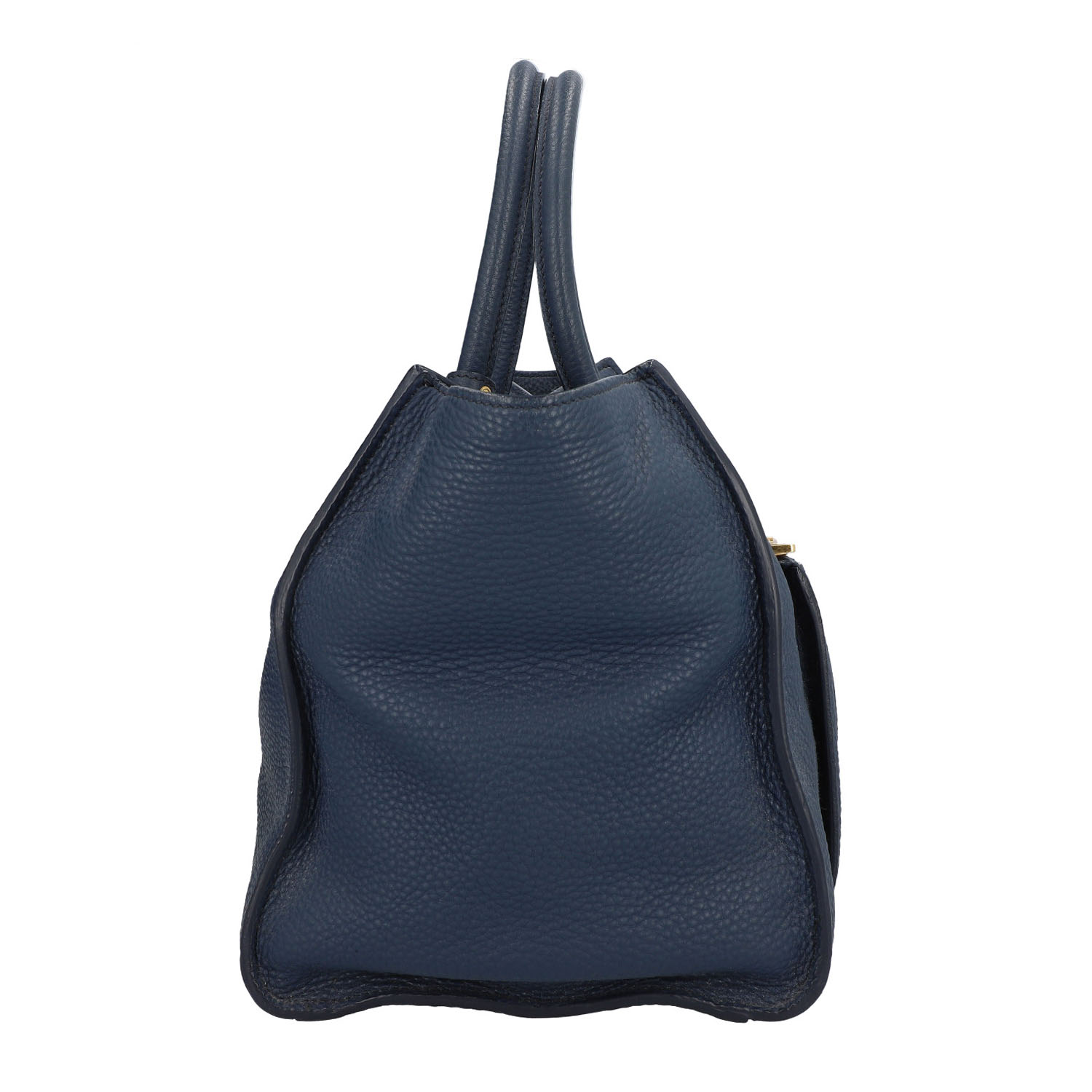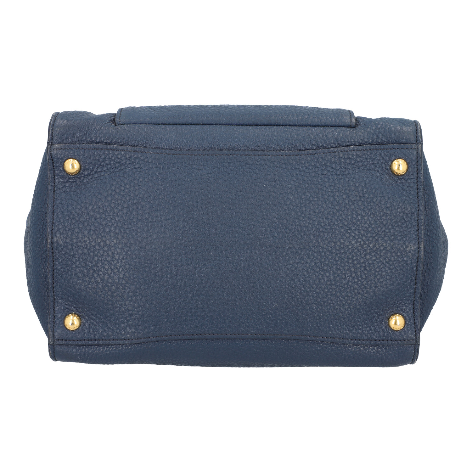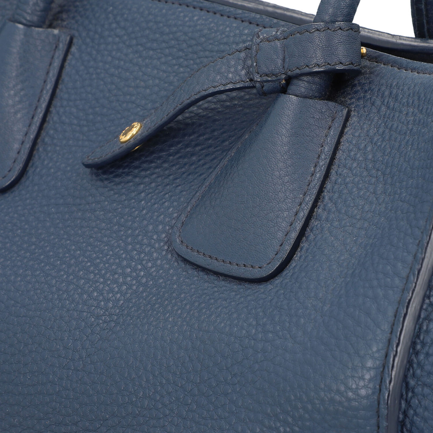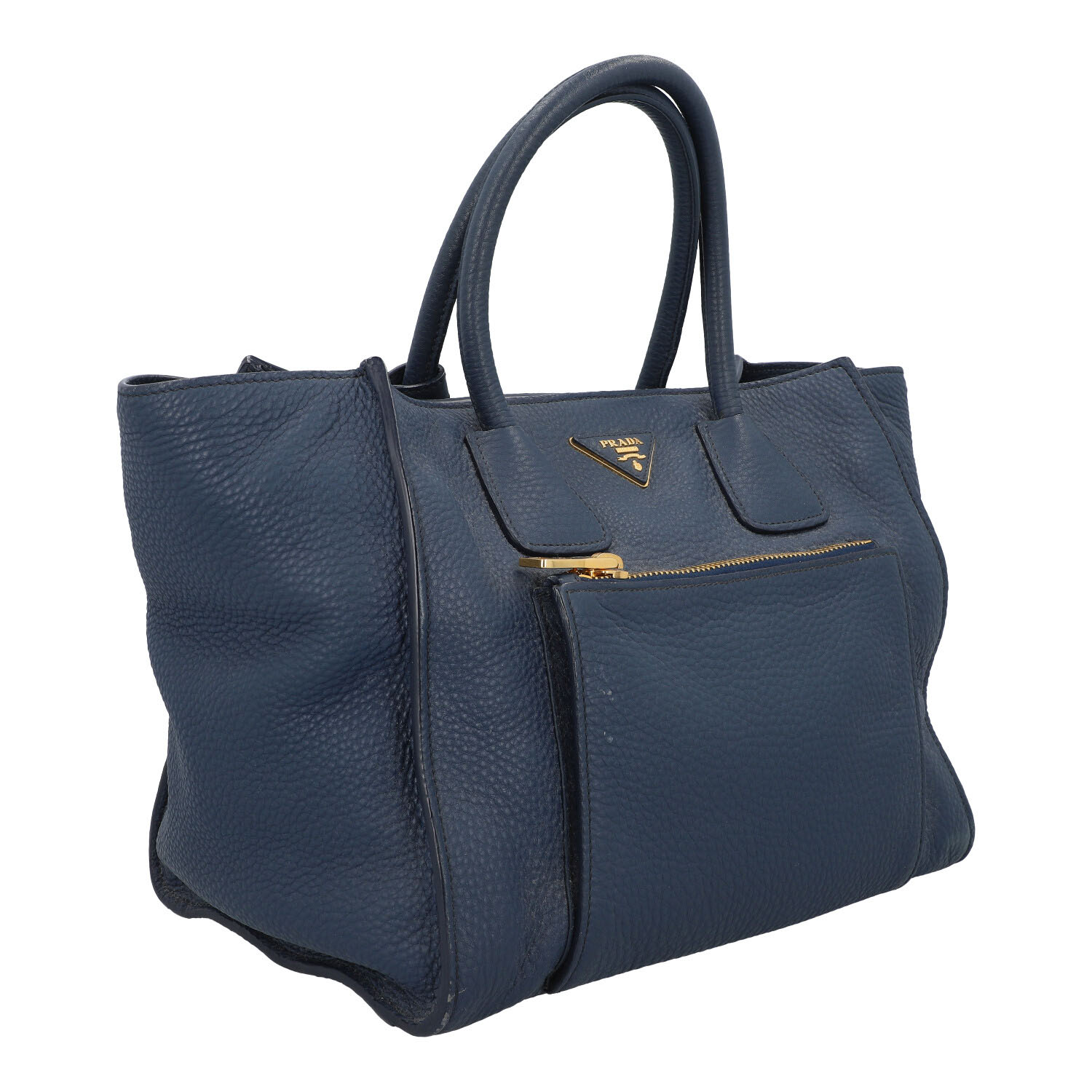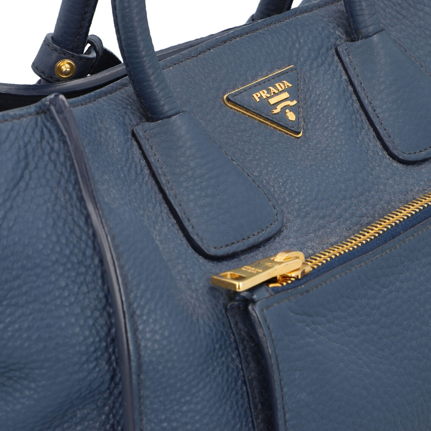 PRADA handbag. Soft, grained leather in petrol blue with gold-coloured hardware. Classic model with logo appliqué on the front, main compartment with magnetic fastening, textile lining with three small inner compartments. Dust bag and shoulder strap enclosed. Scuffing on the edges and signs of wear. 31x20x24cm.