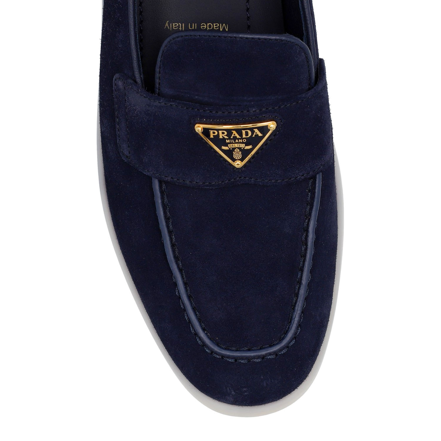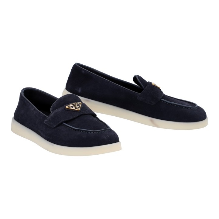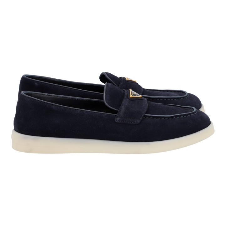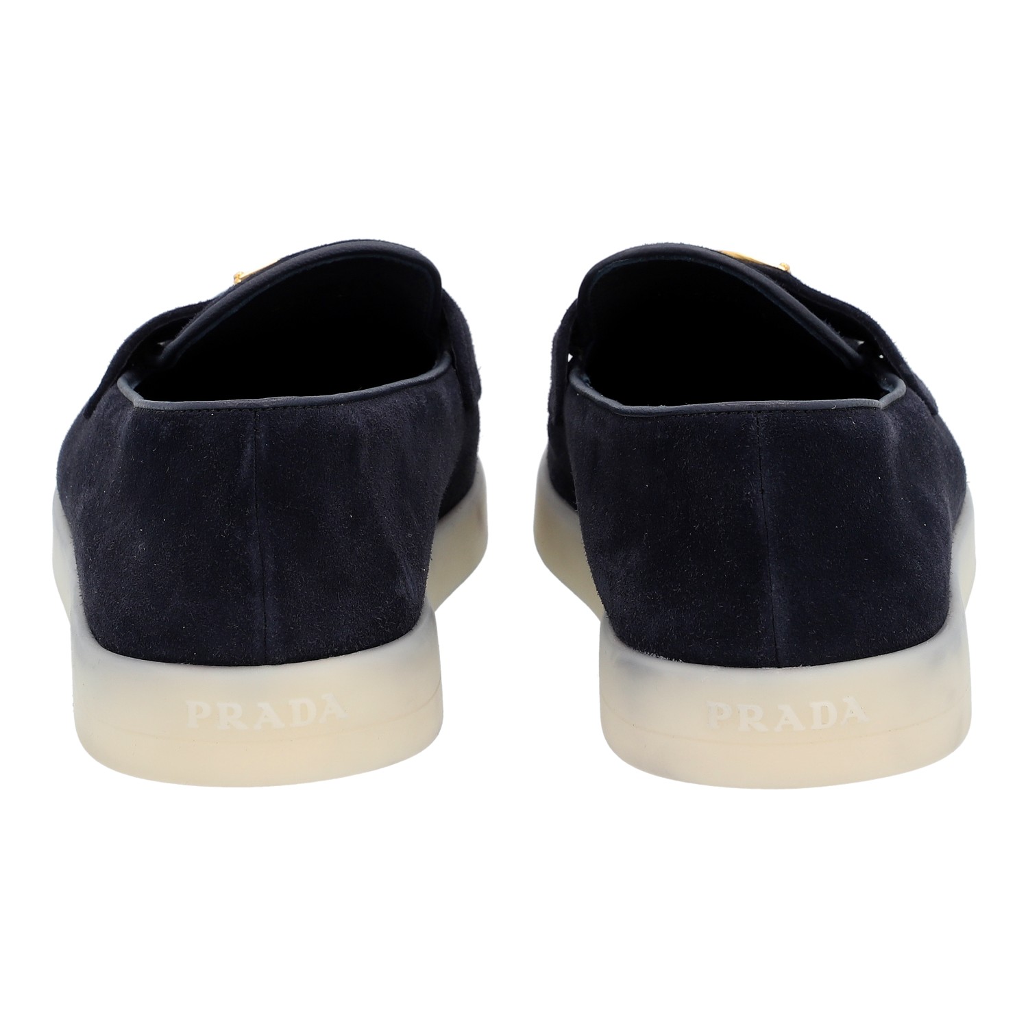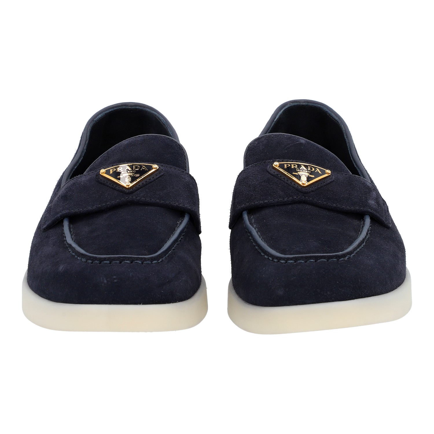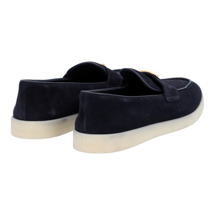 PRADA loafer, size 37,5. Dark blue suede with gold-colored logo appliqué and white rubberized outsole. Slight signs of wear.