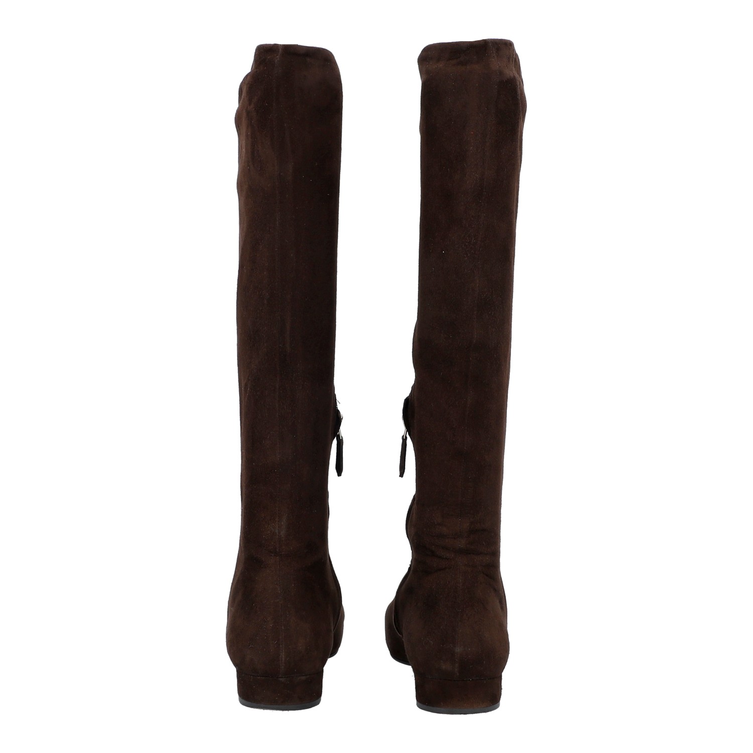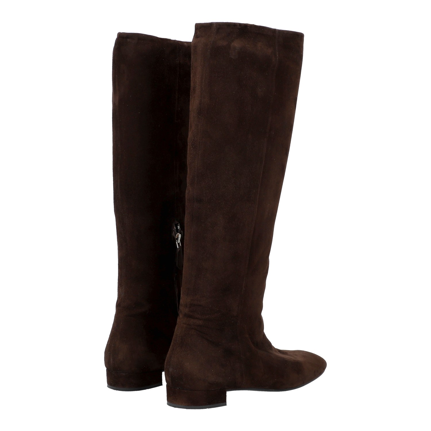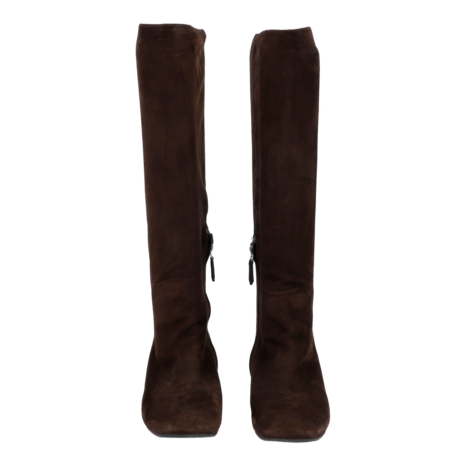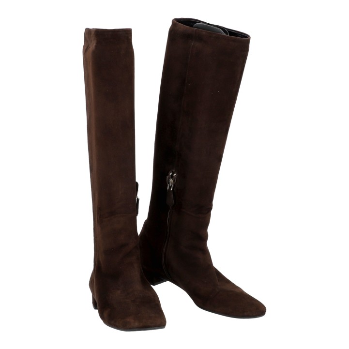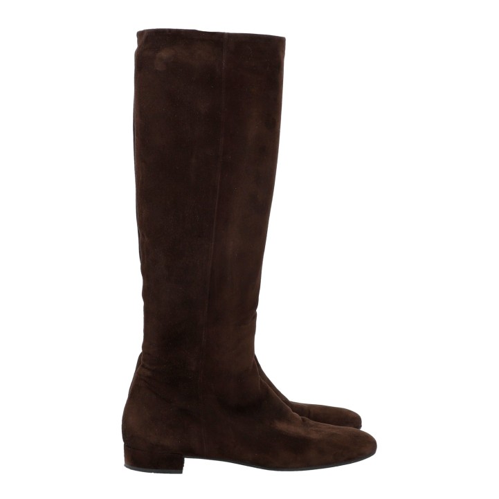 PRADA boots, size 37,5. Brown suede leather with square toe, partial zip and small block heel. Box included. Signs of wear present.
