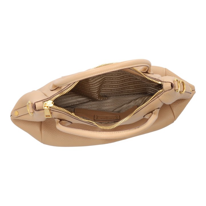 PRADA bag. Beige leather model with gold-coloured hardware, double handles, zip fastening and logo decoration. Interior made from logo fabric with two compartments, one of which has a zip fastening. Dust bag included. Signs of wear and stains present. 35 x 16 x 30 cm.
