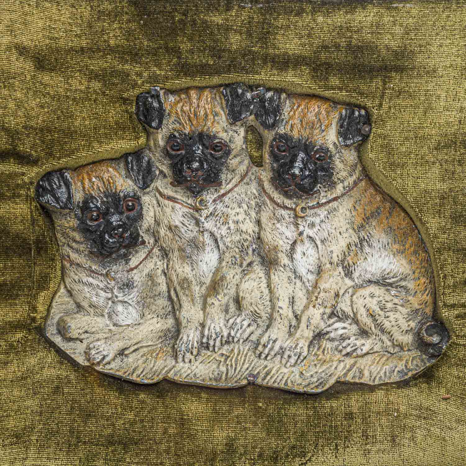 Likely BERGMANN, FRANZ (1861-1936) relief of 3 pug dogs, 19th/20th century. Metal casting in the manner of Vienna bronze, 3 pug dogs in natural colors, framed, background in green velvet, L: 17 cm, frame HxW: 35 x 44 cm, signs of age.