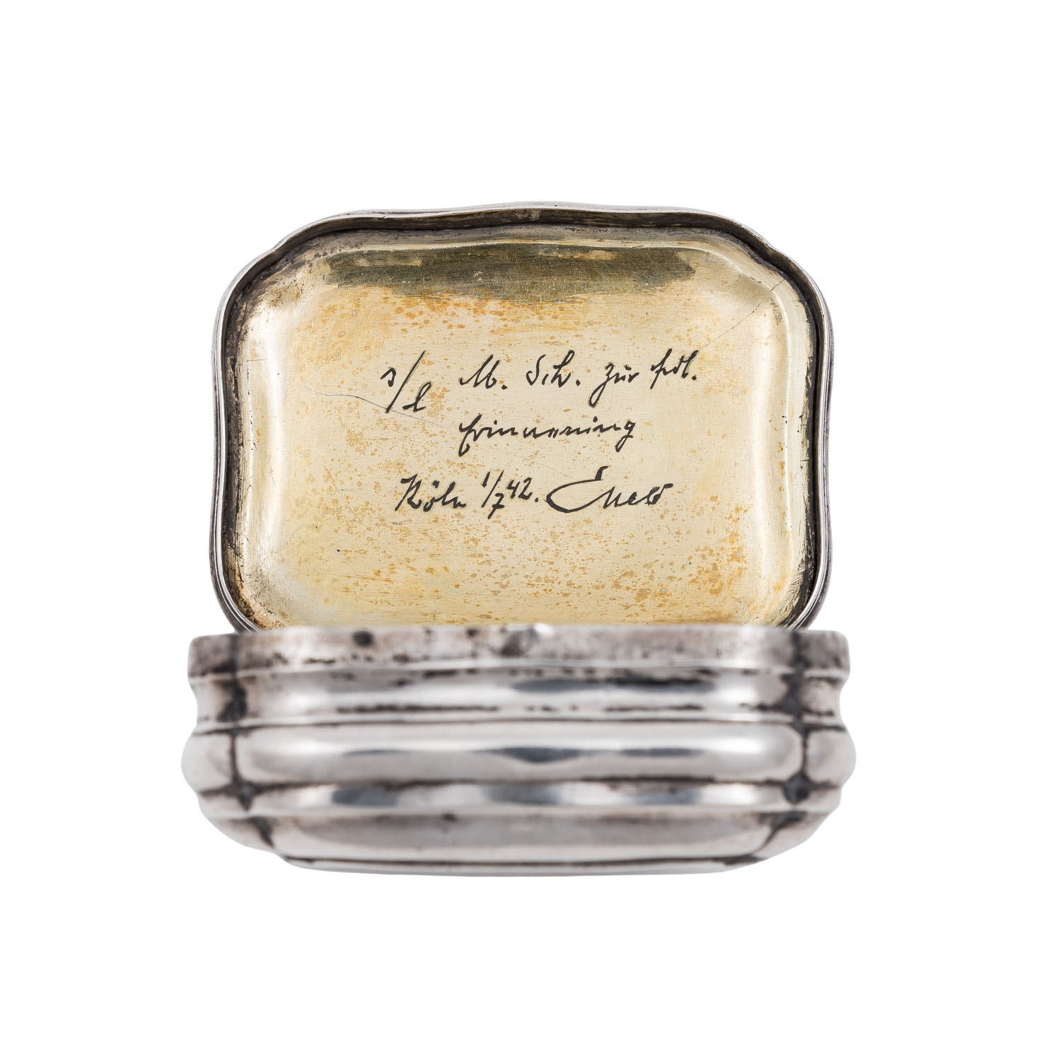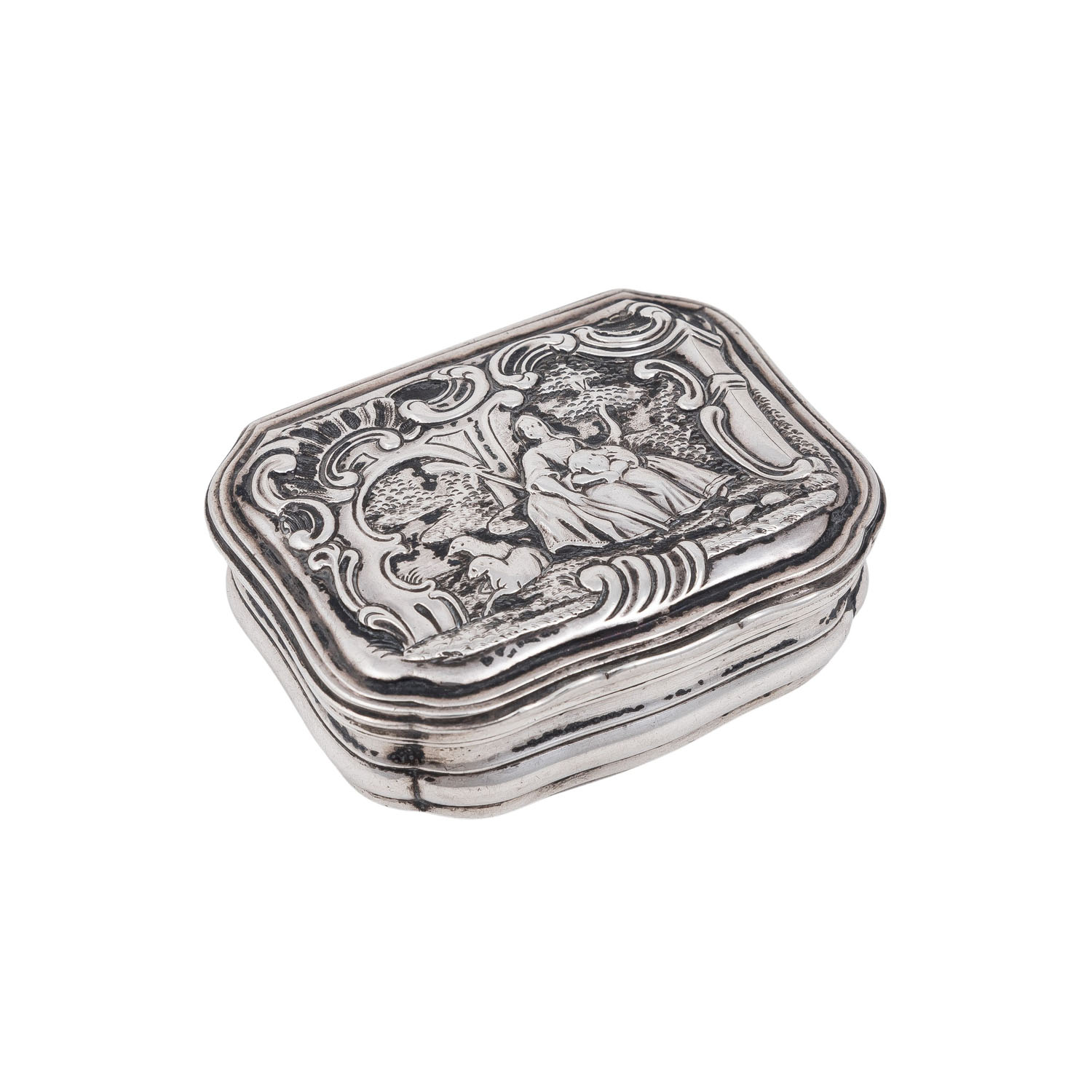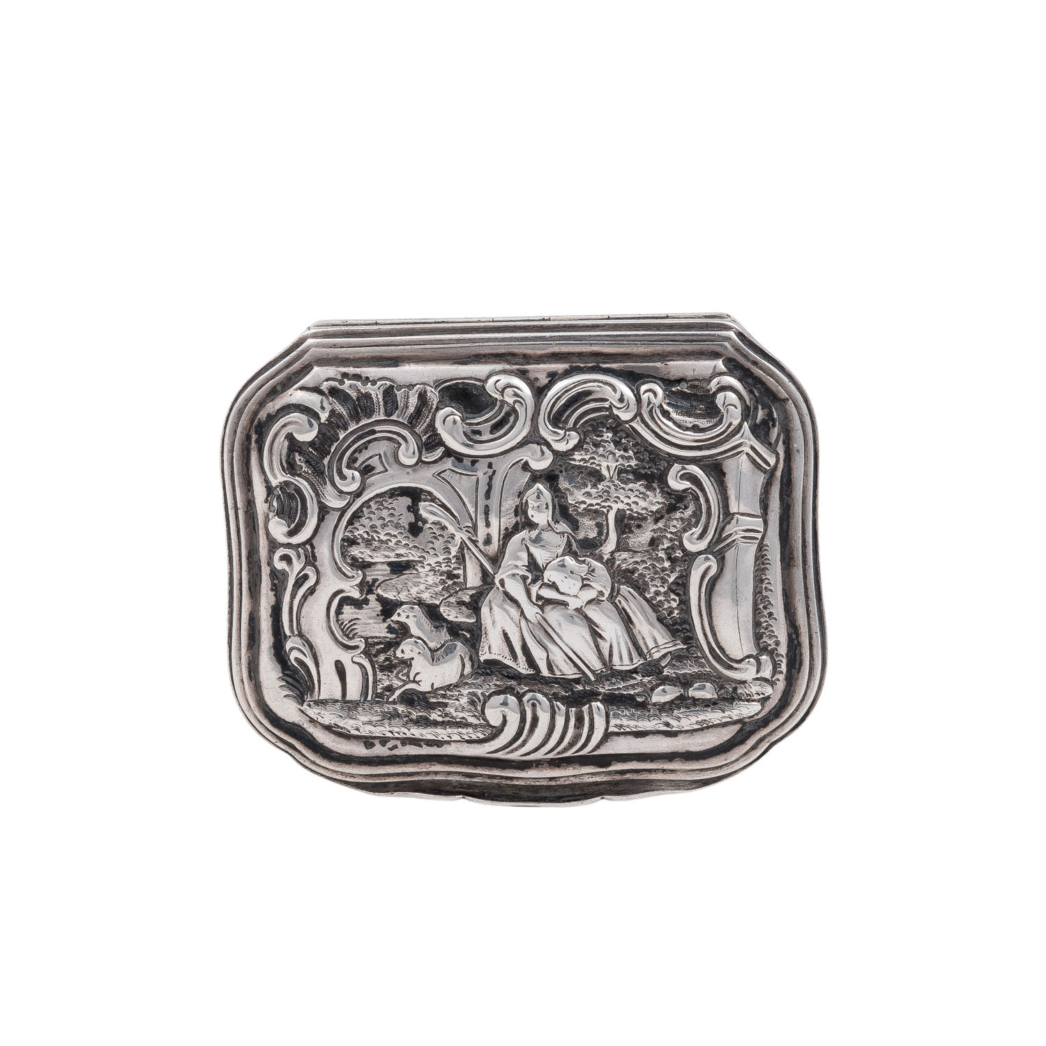 Probably DEUTSCH tabatière, silver, probably 20th century, curved, moulded wall, hinged lid with a relief of a shepherd scene, hinged lid, gilt interior, lxwxh: approx. 6.5x5.3x2.5, not hallmarked, weight approx. 58 g. Signs of age and use. Signs of age and use. Partly dented. Dedication engraved on the inside.