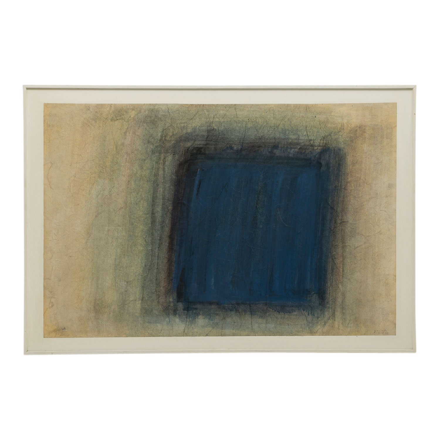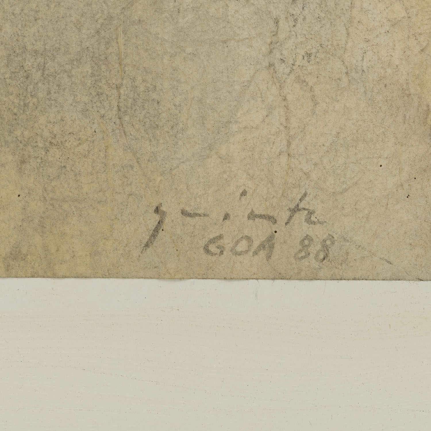 QUINTE, LOTHAR (1923-2000), 'Untitled', Composition with blue color field, signed, designated and dated 'quinte, GOA 88', gouache / Japanese laid paper mounted on a plate (by the artist himself), HxW: sheet ca. 60.5 x 92 cm, top ca. 68 x 100 cm, outside dimensions ca. 70 x 102 cm. Signs of age. Stains. Mounted in frame.