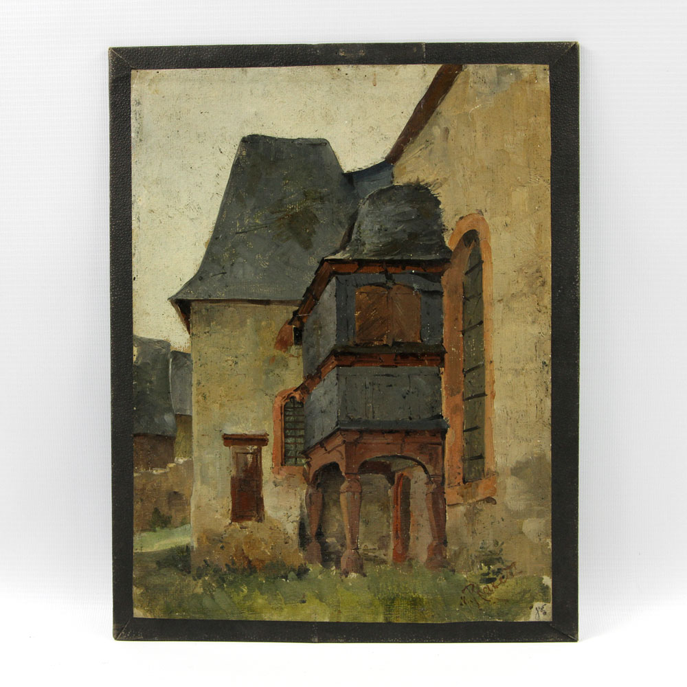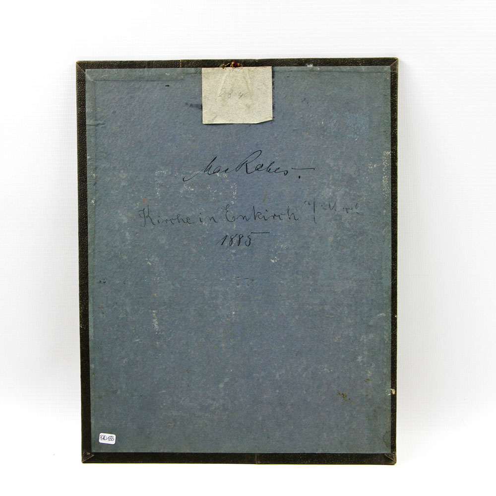 RABES, MAX FRIEDRICH (attributed;1868-1944): Partial view of the church in Enzkirchen, 1885, oil/paper/cardboard, 31x24 cm, signed u.r , verso signed, inscribed and dated, traces of age.