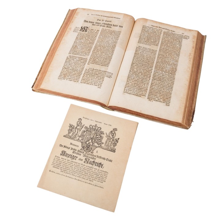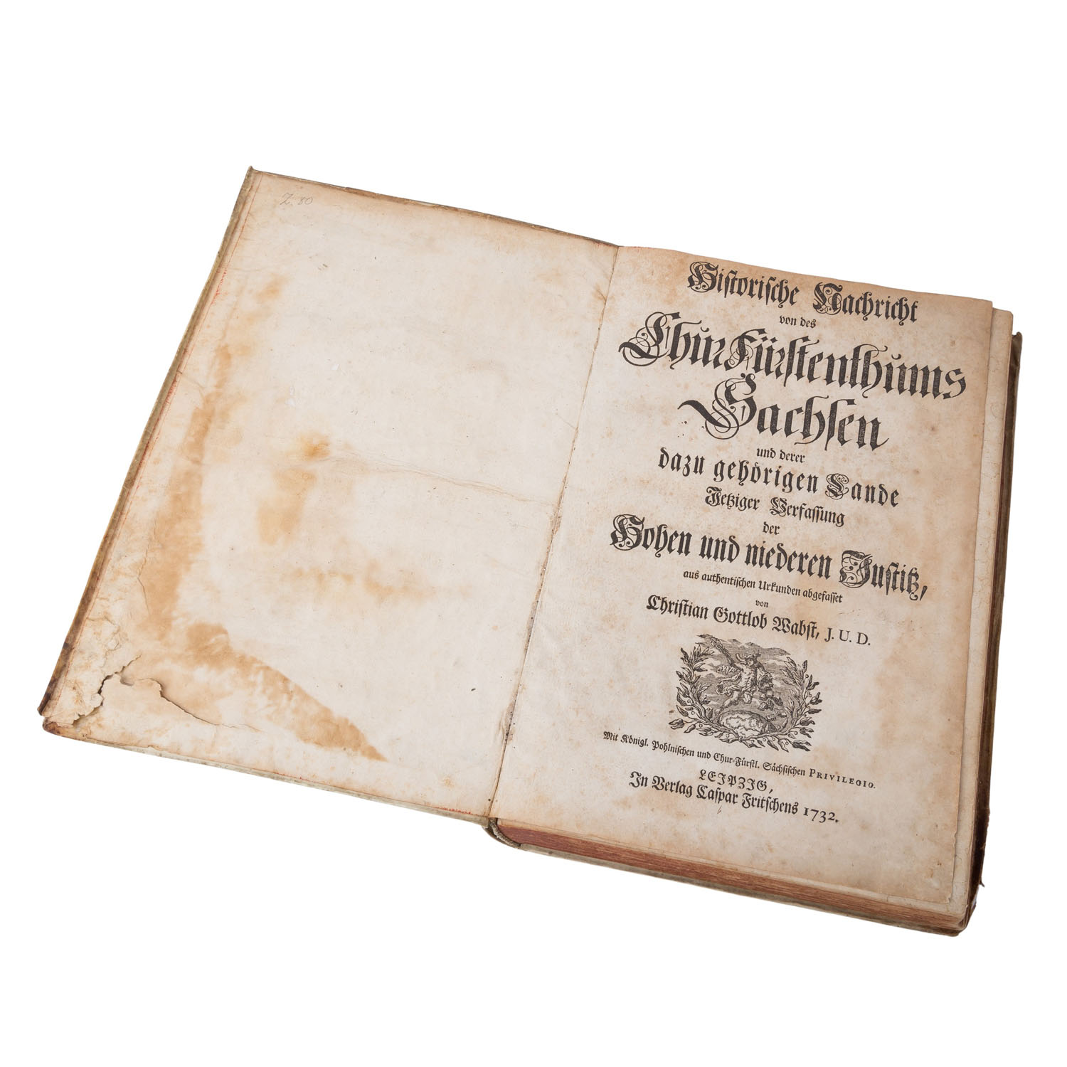 A rare work on the constitution of the Electorate of Saxony from 1731, ‘Historical Account of the Electorate of Saxony and its Associated Lands, Current Constitution, High and Low Justice’ written by the German jurist Christian Gottlob Wabst (c. 1692-1743). The text provides a comprehensive account of the political and legal constitution of the Electorate of Saxony in the 18th century. It describes in detail the administrative structures and the responsibilities of the high and low courts on the basis of contemporary documents. Signs of age and wear.