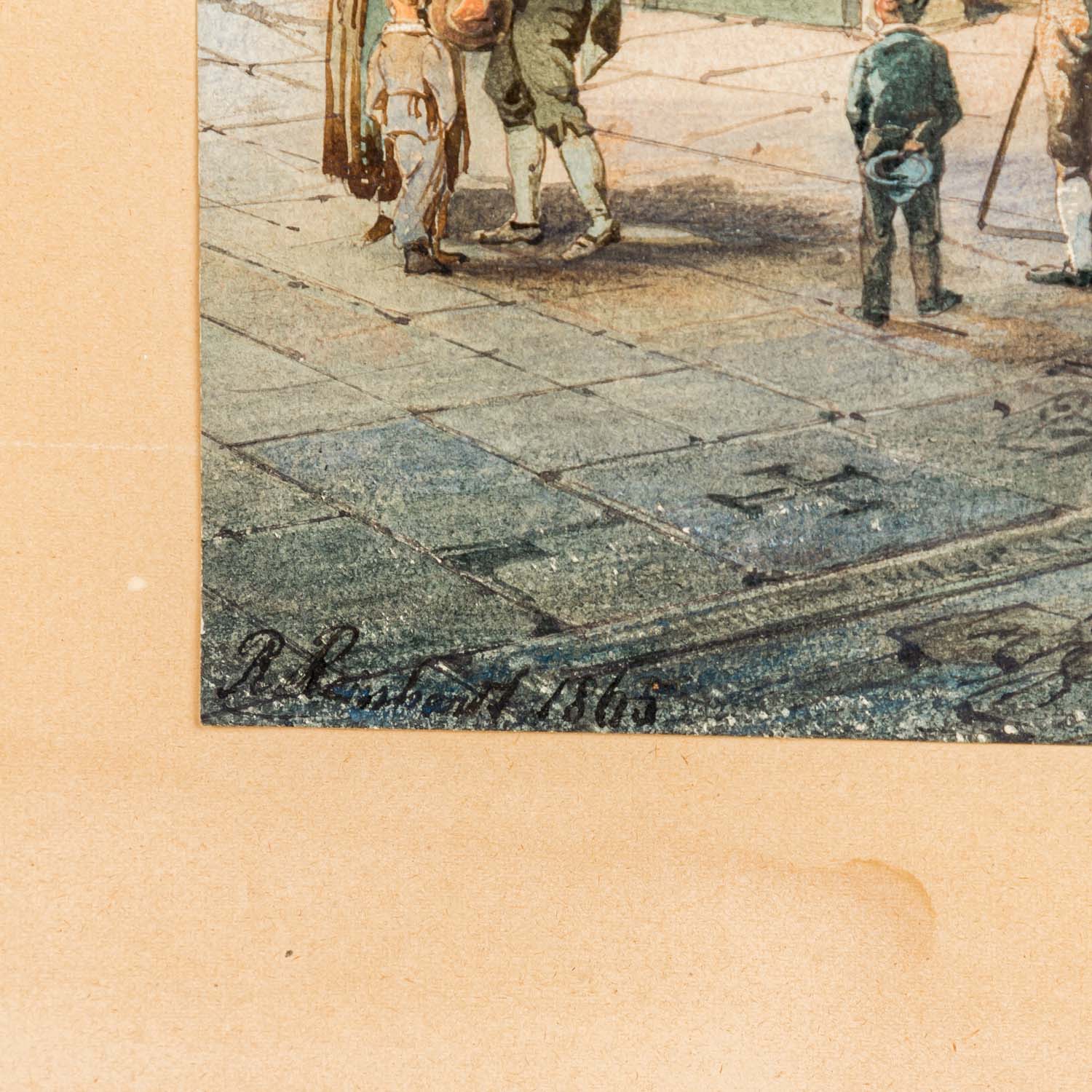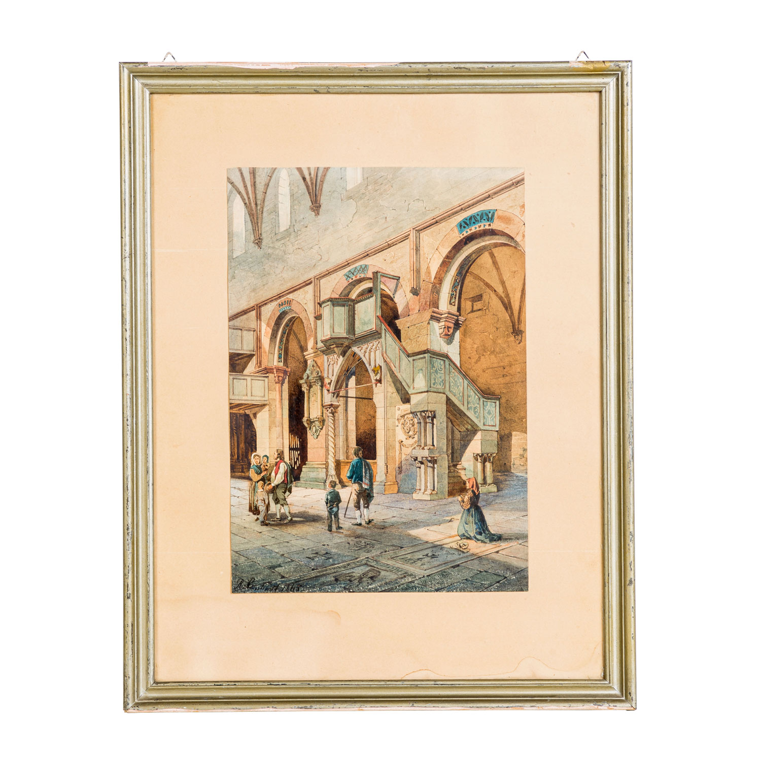 REINHARDT, R., probably Robert (1843-1914), 'Mon Reale in Palermo', pilgrim in church interior, signed and dated 1865, watercolor / paper, HxW: approx. 34x24 cm (52x41 cm with frame). Browned, sheet edges probably trimmed. With glazed frame (edges damaged).