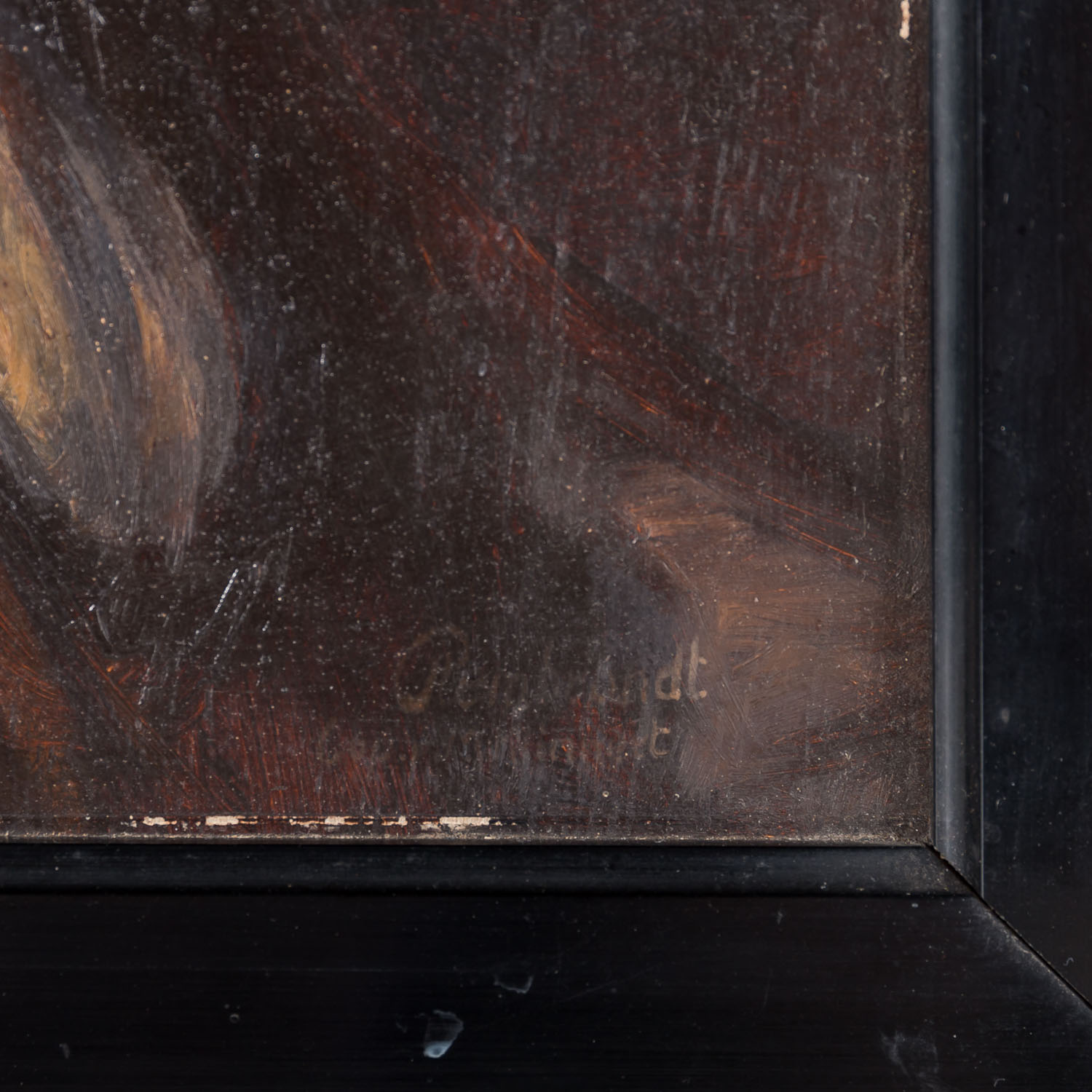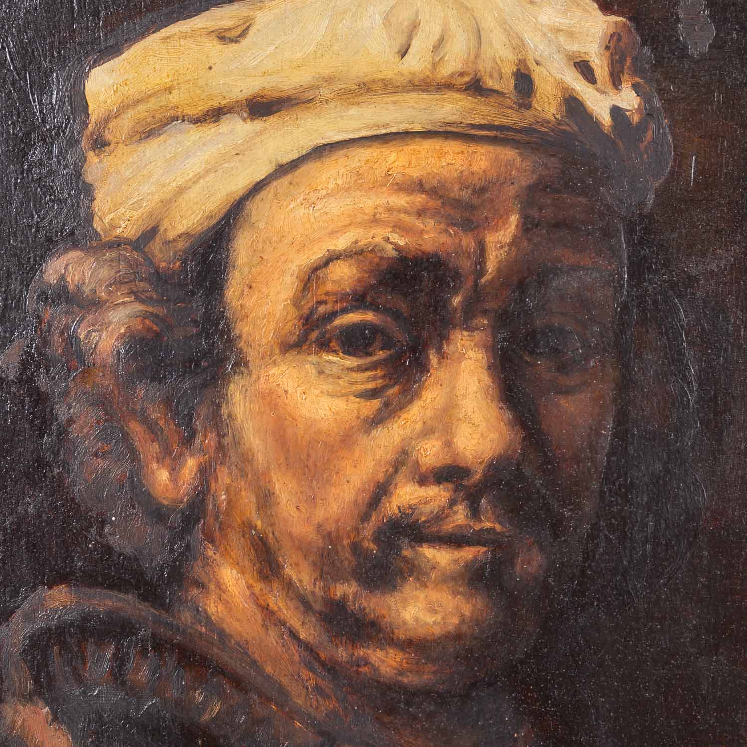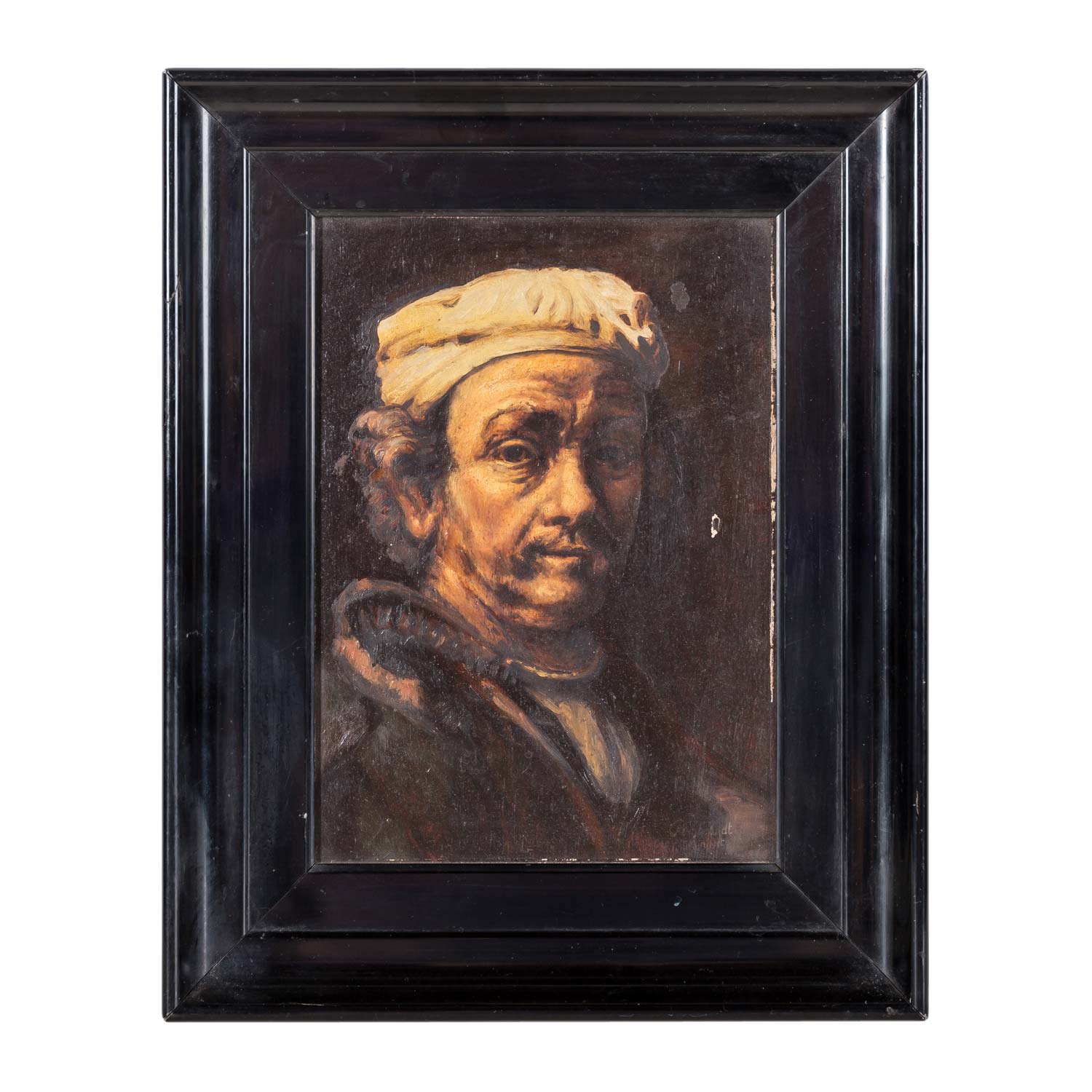 REMBRANDT van RIJN, AFTER (copyist 1st half of the 20th century), 'Portrait of Rembrandt', copied from the self-portrait with an easel, l.r. inscribed (copyist's name unclear), oil/wood, HxW: approx. 33x24 cm (45x36 cm with frame). Signs of age and rubbing, chipped paint. With frame (signs of age).