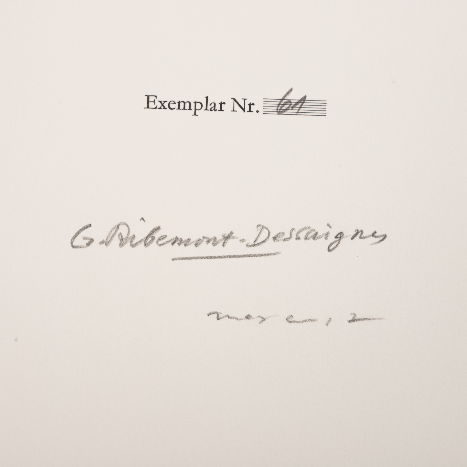 RIBEMONT-DESSAIGNES, GEORGES, 'The Ballad of the Soldier', 34 lithographs by MAX ERNST, manus presse 1972, the texts and the original lithographs on Arches (with watermark), copy 61 of 217, by Ribemont-Dessaignes and Max Ernst with Pencil signed and numbered by hand, the unbound sheets enclosed in hardcover binding, in a slipcase, external dimensions approx. 41x30.5 cm. Slight signs of age, a few creases, stain on the slipcase.