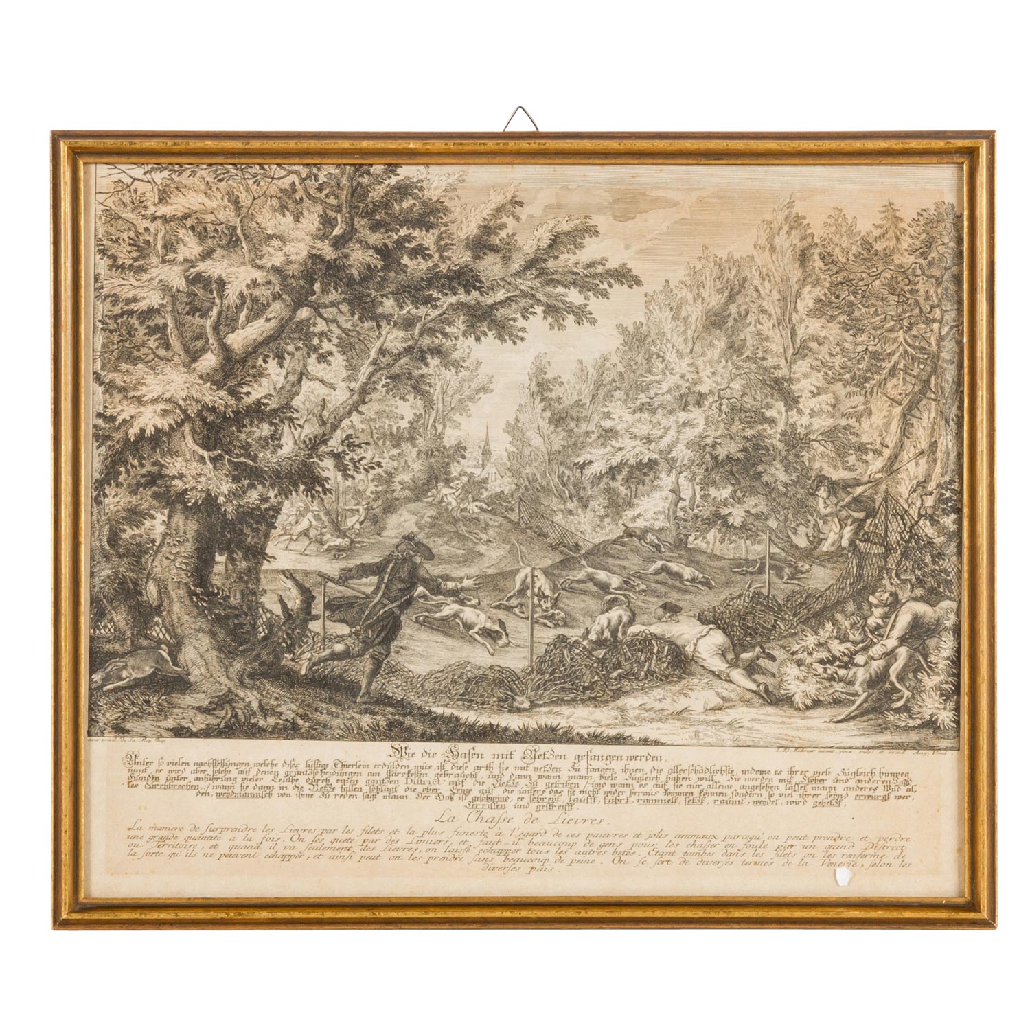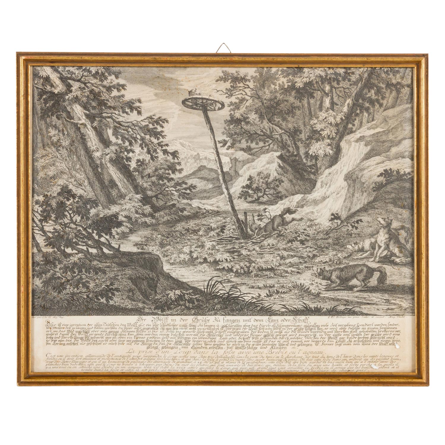 Kupferstiche, rechts unten 'Joh. El Riedinger inv. prinx. sculps. et excudit Aug. Vind', 'Der Wolf in der Grübe zu fangen mit dem Lam oder Schaft', 'Wie die Hassen mit Netzen gefangen werden', HxB: 34/41 cm. Leichte Altersspuren.