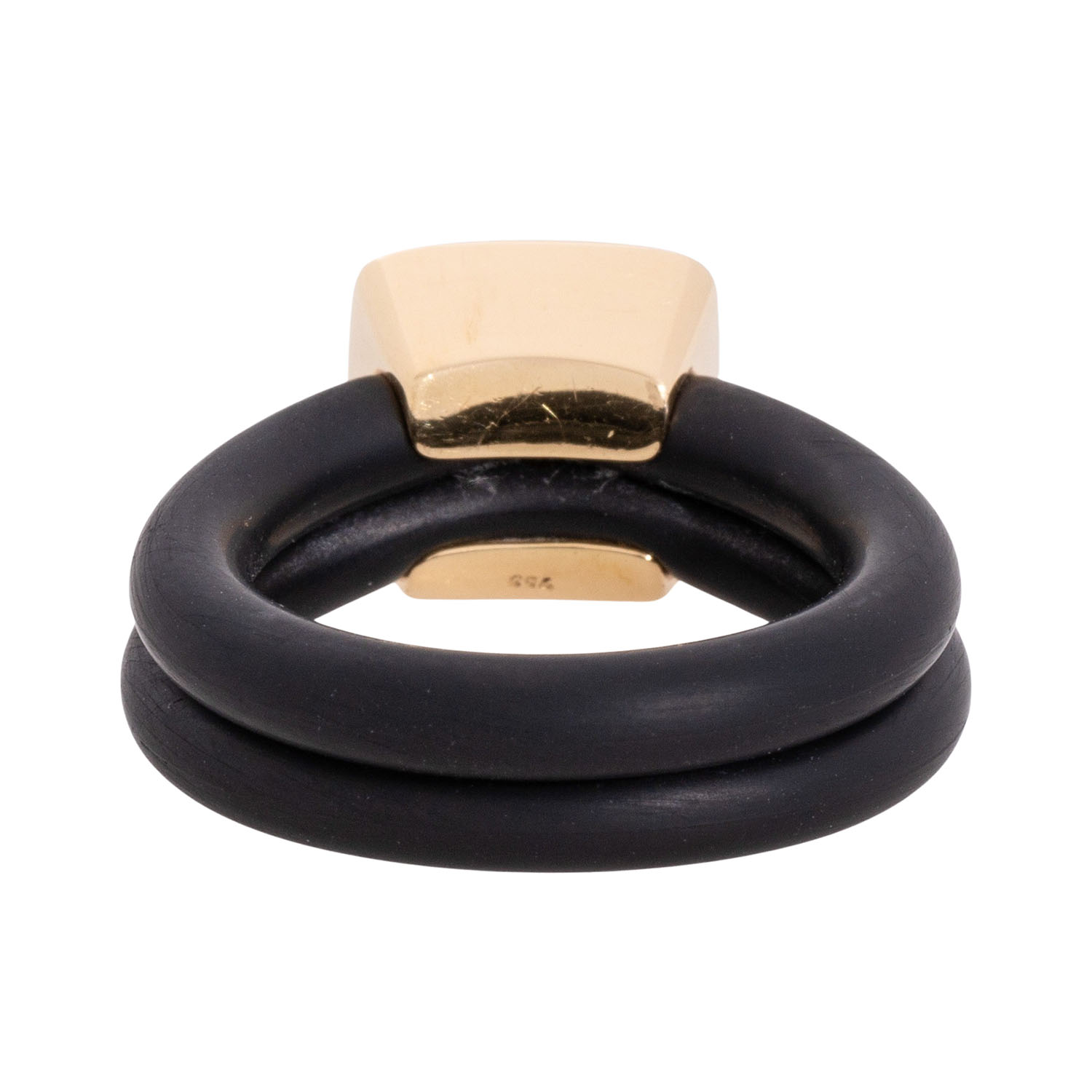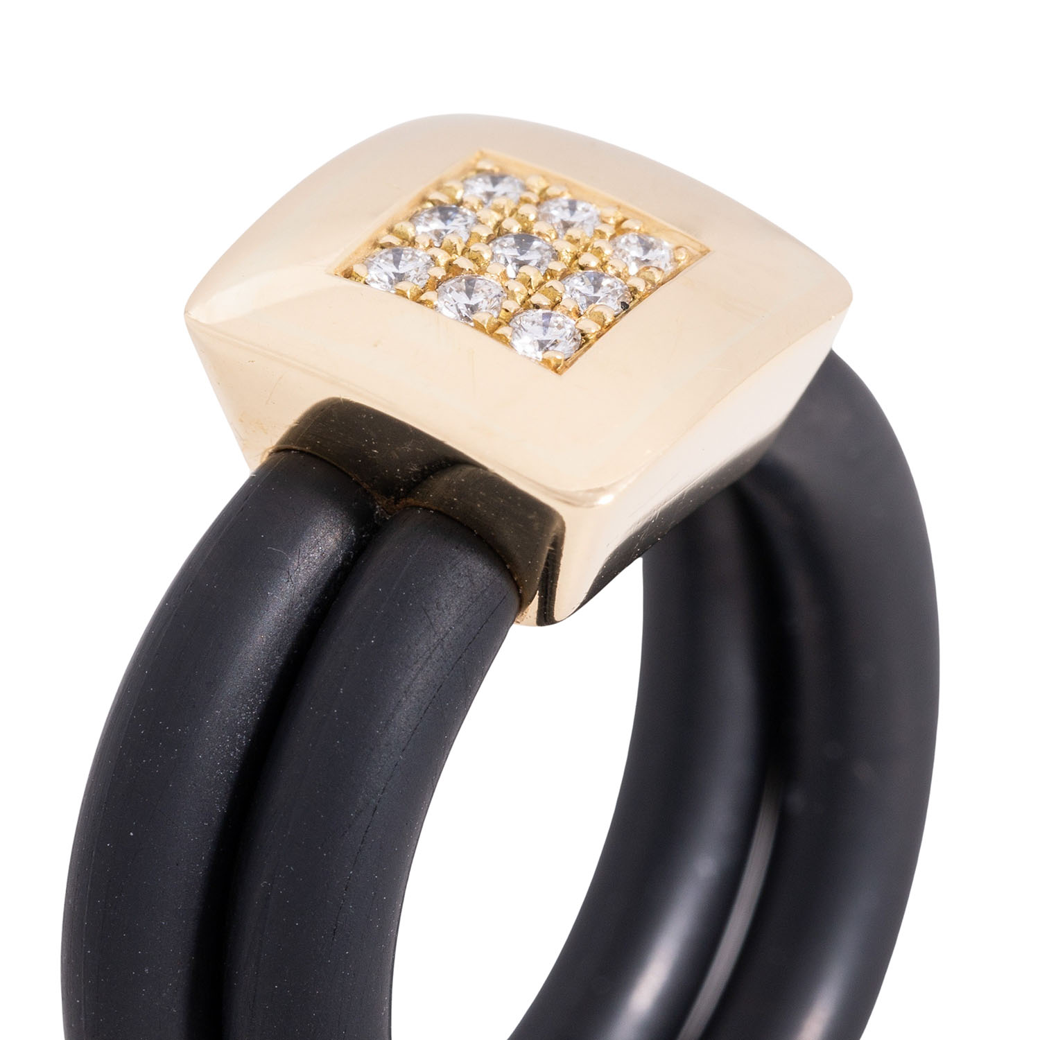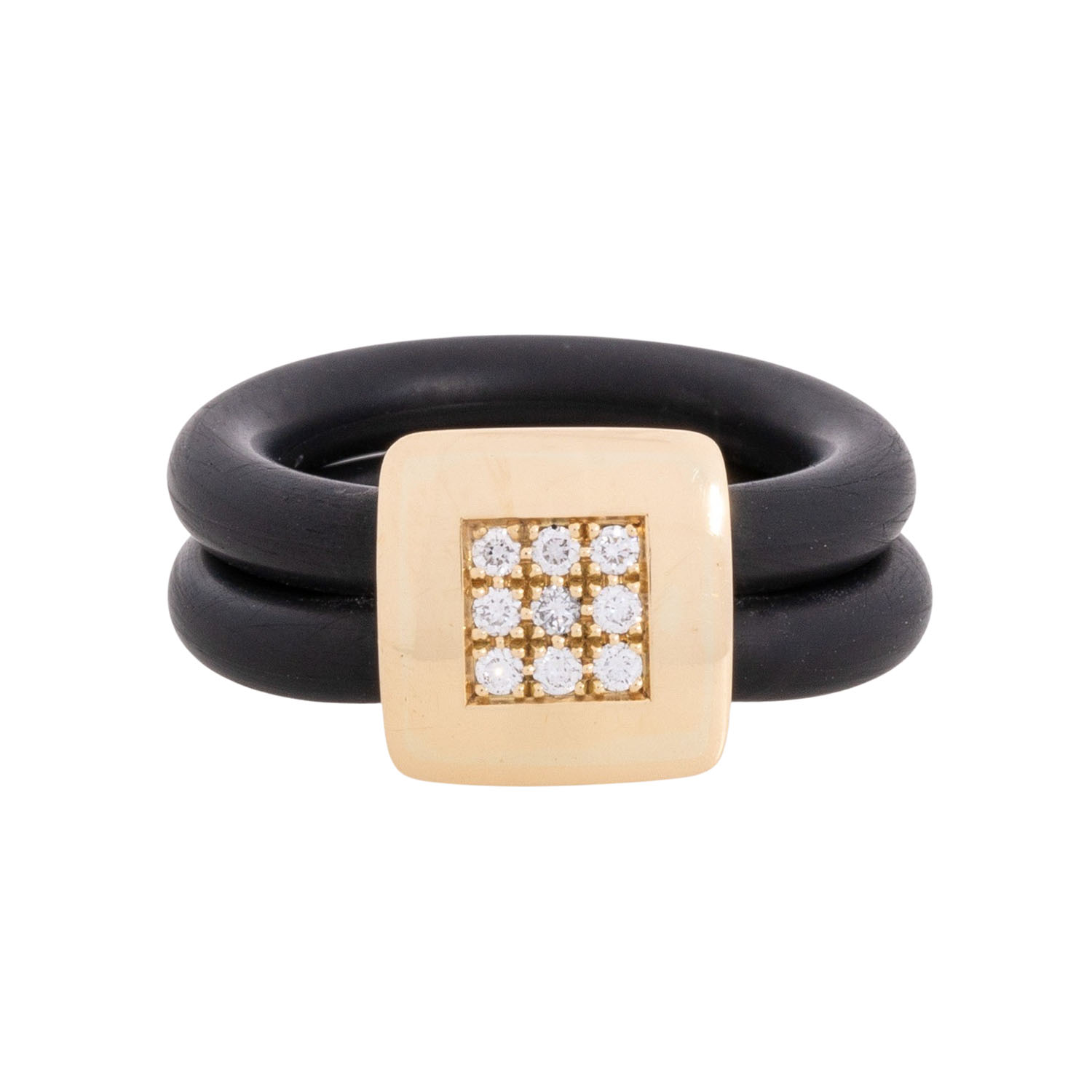 Ring with 9 brilliant cut diamonds, pavé-setting, ap. 0.14 ct, double ring shank out of elastomer plastic, 18K yellow gold, 5.2 g, ring size 53, late 20th century, minor signs of wear.